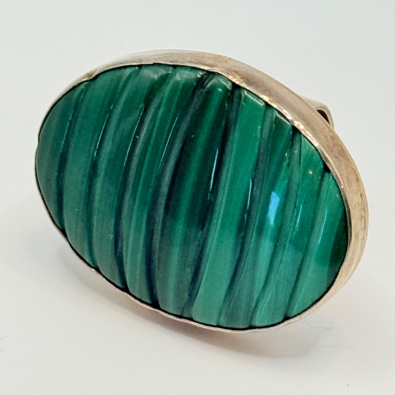 Malachite and sterling ring featuring a large carved oval stone in a ridged cabochon form. Stamped Sterling. Measures 1.5" × 1" and fits a size 5. Size: 5