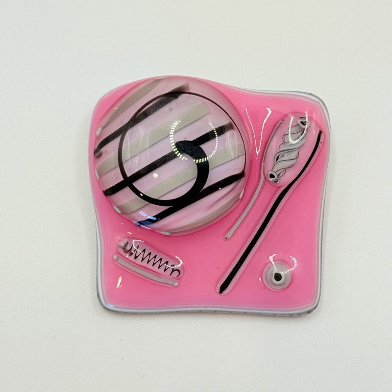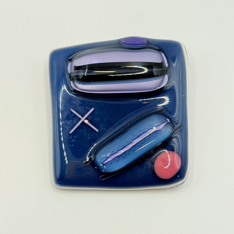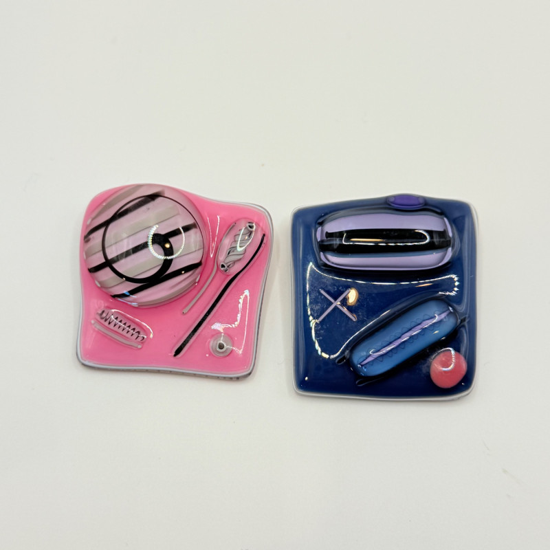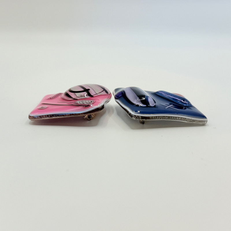 Pair of artisan hand-blown glass brooches with stylized abstract designs. One in pink, one in navy, each featuring fused glass elements in playful, sculptural arrangements. Measures 1.75" wide. Unmarked. Quantity: 2