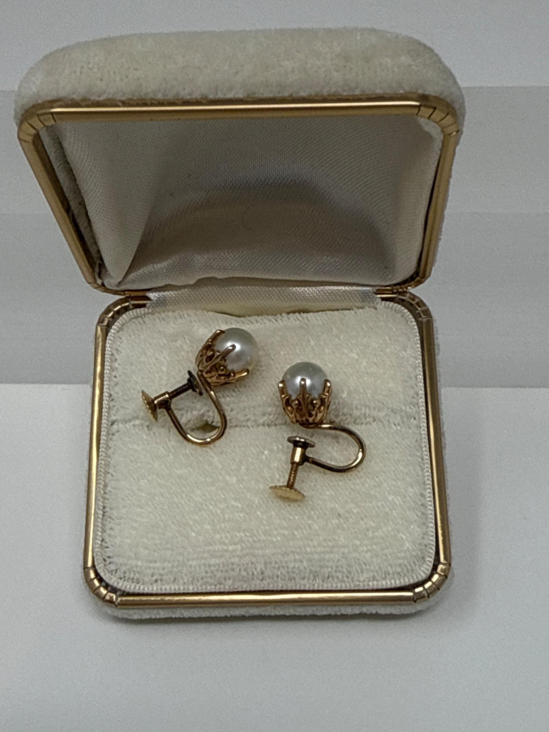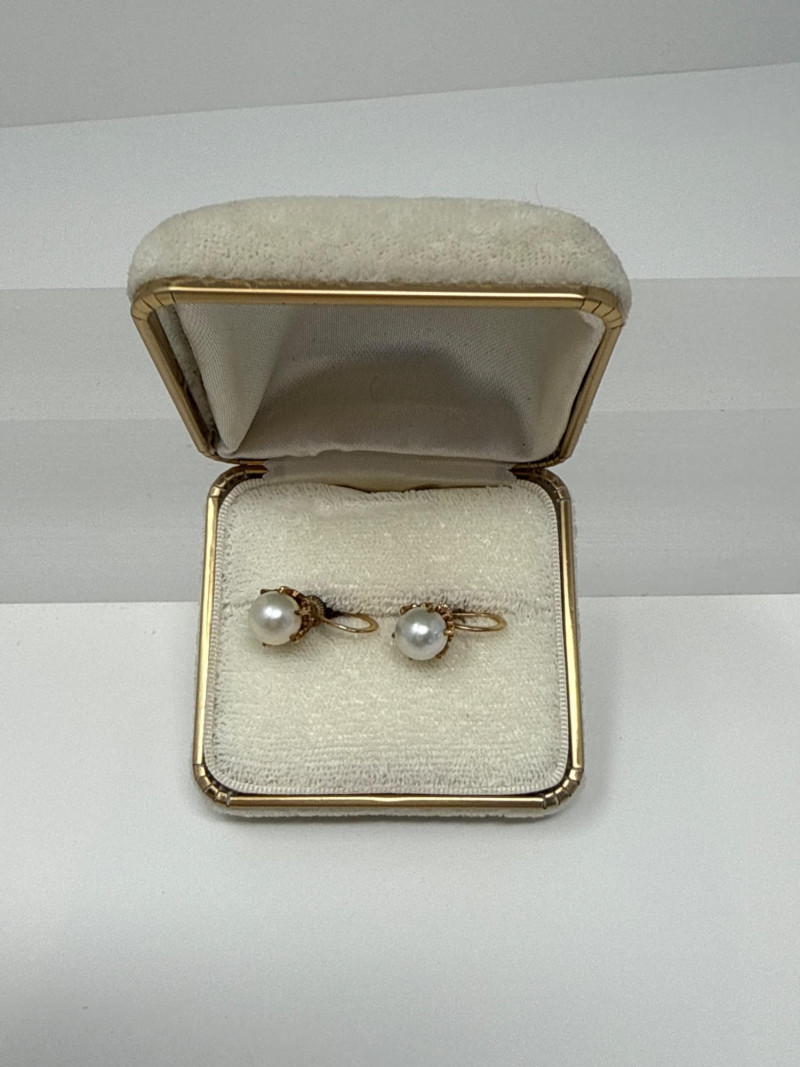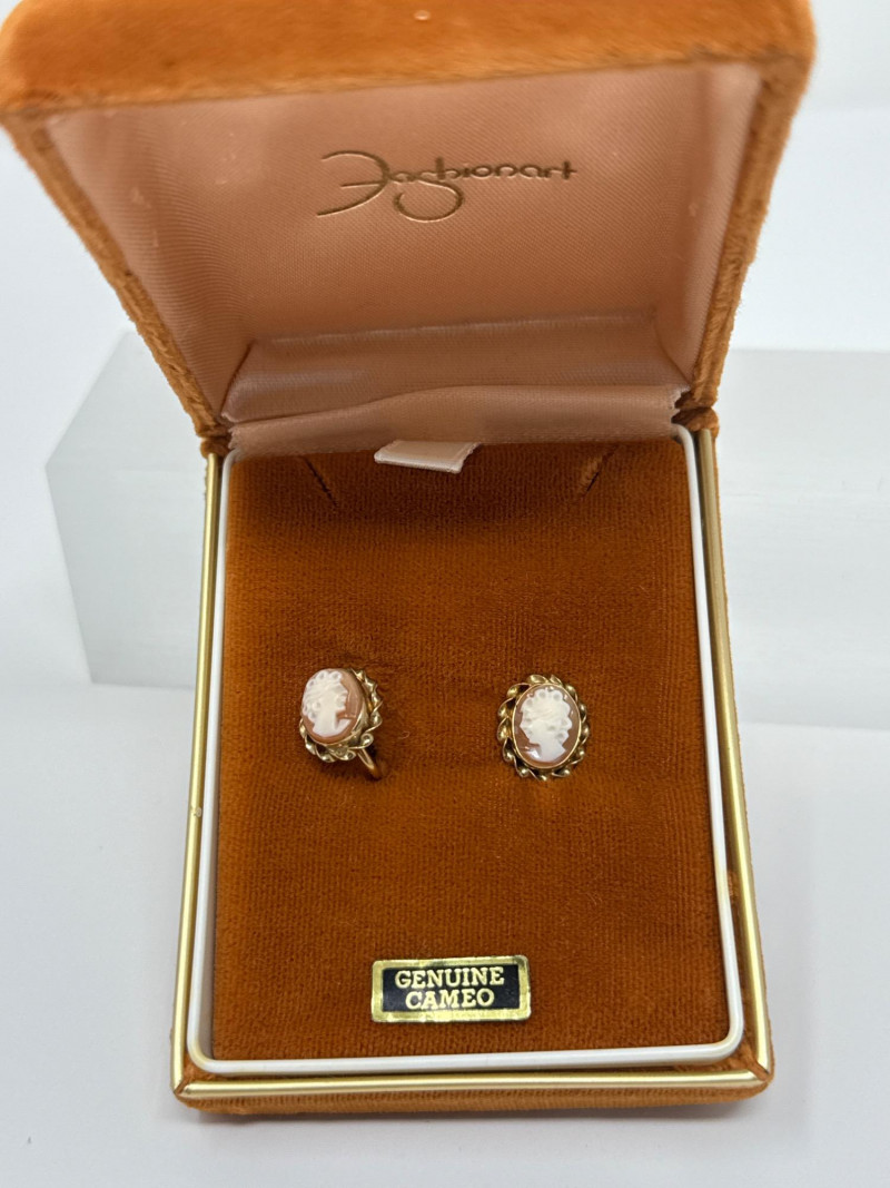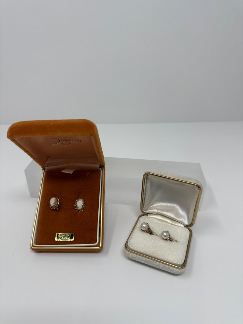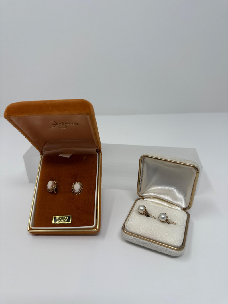 Charming set of two vintage earring pairs, each presented in its original display box. Includes one pair of oval cameo studs marked 1/20 12K, housed in a brown velvet Junior Gems box, and one pair of round pearl drop earrings marked 14K, displayed in a white satin-lined box. Both sets are pierced post-back style. Cameo Earrings: Oval profile cameos in decorative gold-filled settings (1/20 12K), Junior Gems branded box Pearl Earrings: Round pearl drops with 14K gold posts and decorative tops, white presentation box Style: Pierced, post-back