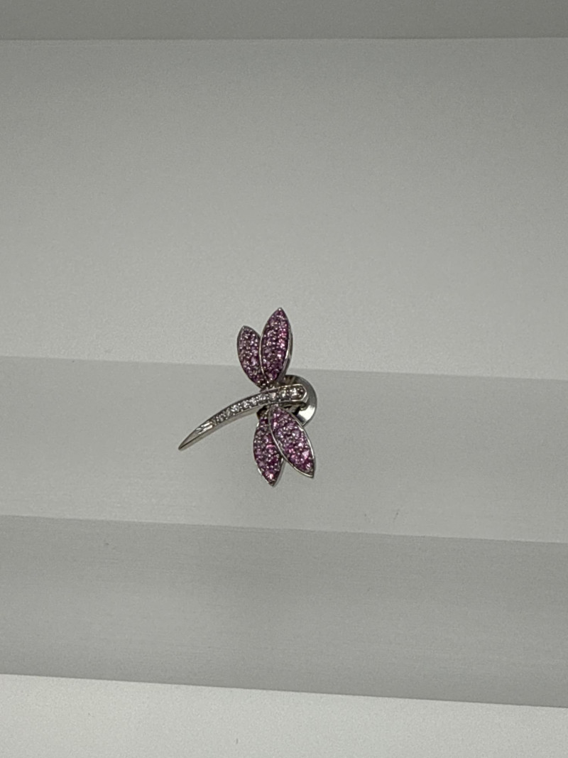 Striking 14K white gold dragonfly brooch featuring four marquise-shaped wings encrusted with pink sapphires, and a gently curved body set with a line of sparkling white diamonds. The piece is marked 14K and BH, weighing 3.728 grams, and showcases elegant craftsmanship with a whimsical silhouette. Presented on a hexagonal display stand. Maker: BH (signed) Metal: 14K white gold, marked Gemstones: Pink sapphires (pavé-set wings), white diamonds (body) Weight: 3.728 grams Design: Stylized dragonfly with curved body and gemstone-encrusted wings Markings: Stamped 14K and BH