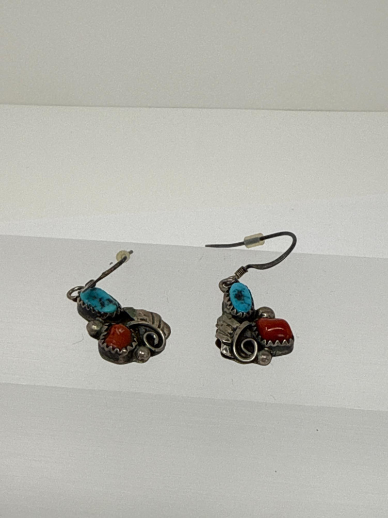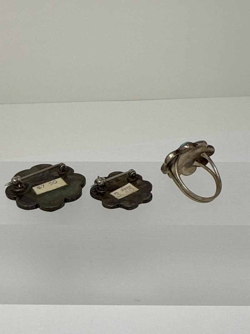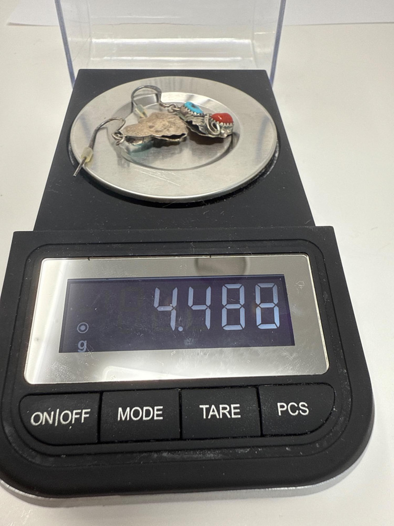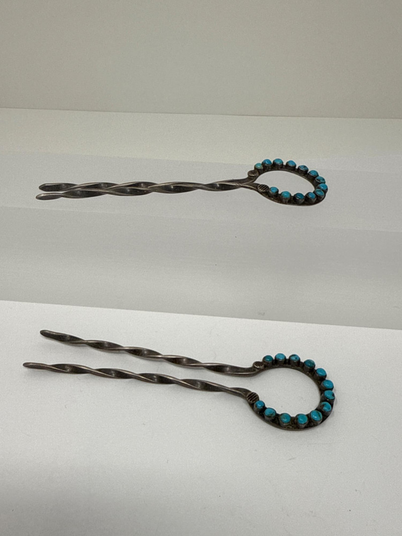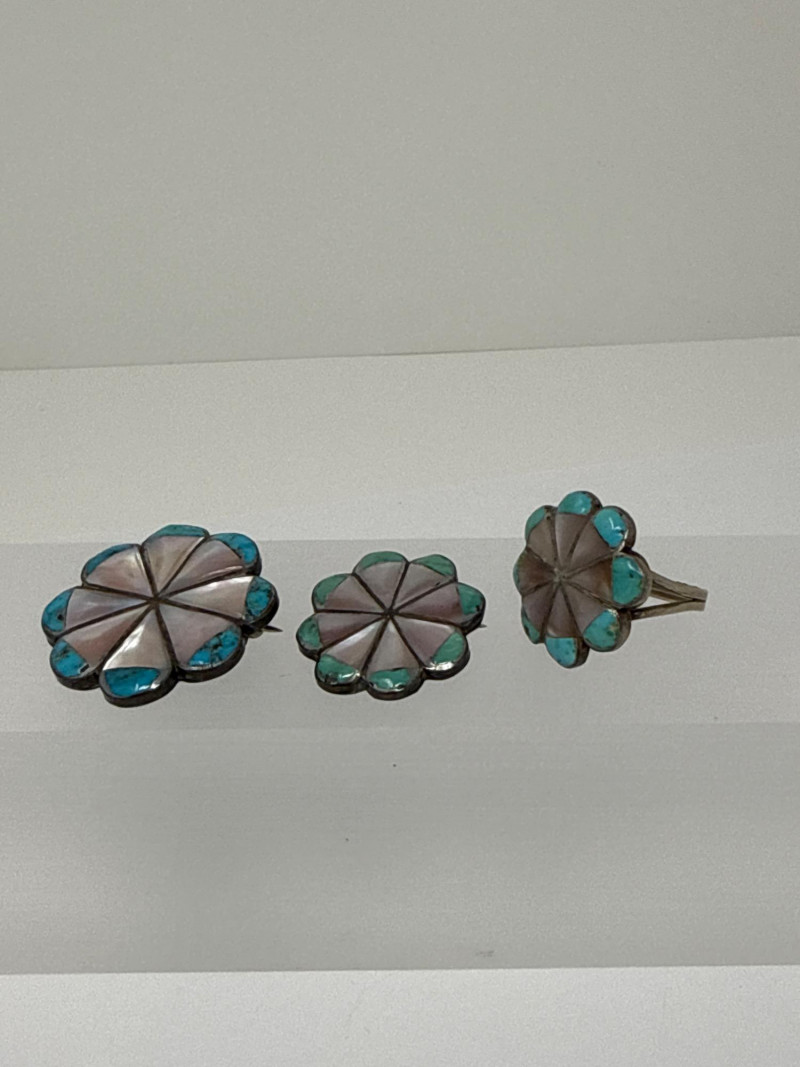 Striking four-piece vintage jewelry set, blending Southwest symbolism, artisan metalwork, and bold blue stones. Includes: One Ring – Floral turquoise inlay, size 6. Two Hairpins – Twisted metal with turquoise cabochons, each approx. 3.75" long. Two Pairs of Earrings – Pierced dangles with coral, black, and turquoise inlay, each piece measures between 1" and 1.5". Material: Sterling silver (marked or consistent), turquoise, coral, shell Style: Zuni-inspired, artisan Southwest