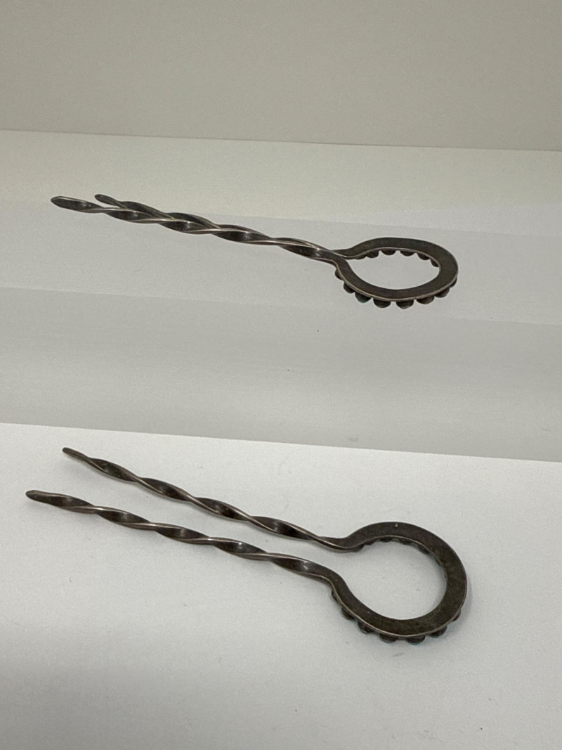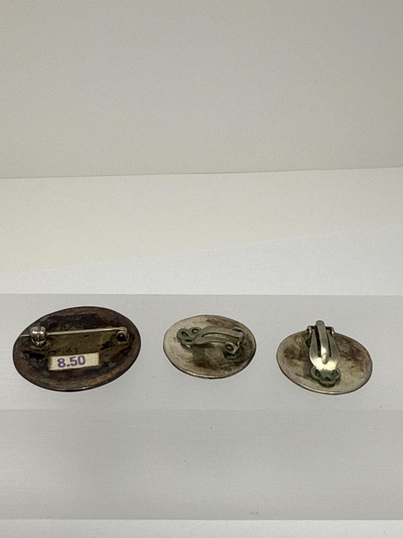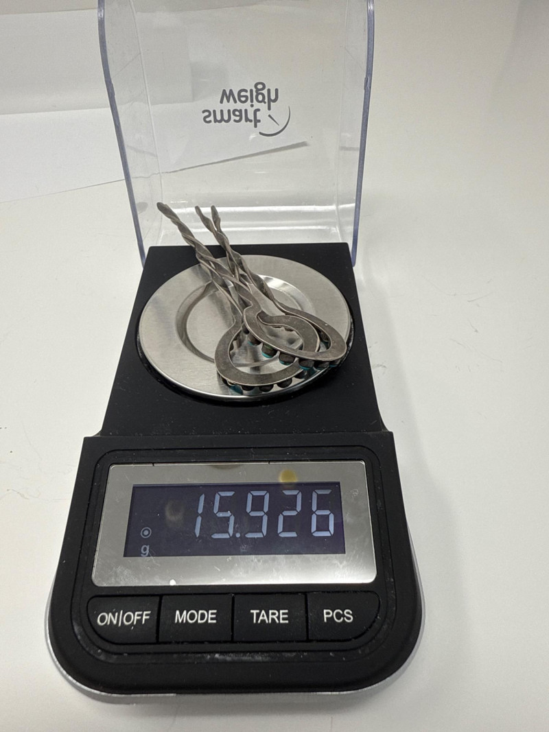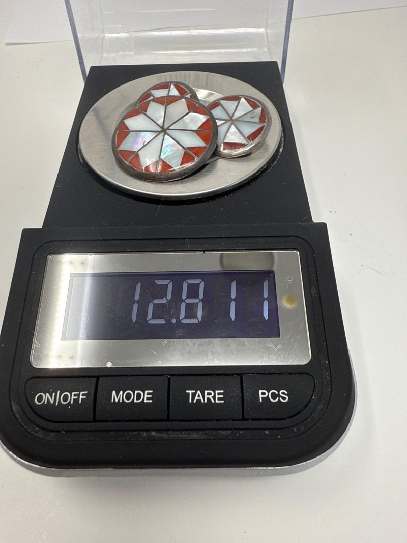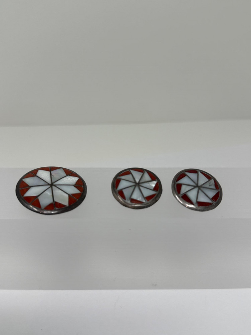 Striking four-piece vintage jewelry set, blending Southwest symbolism, artisan metalwork, and bold blue stones. Includes: One Ring – Floral turquoise inlay, size 6. Two Hairpins – Twisted metal with turquoise cabochons, each approx. 3.75" long. Two Pairs of Earrings – Pierced dangles with coral, black, and turquoise inlay, each piece measures between 1" and 1.5". Material: Sterling silver (marked or consistent), turquoise, coral, shell Style: Zuni-inspired, artisan Southwest