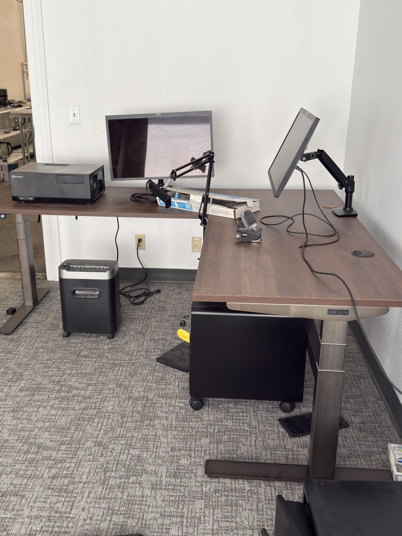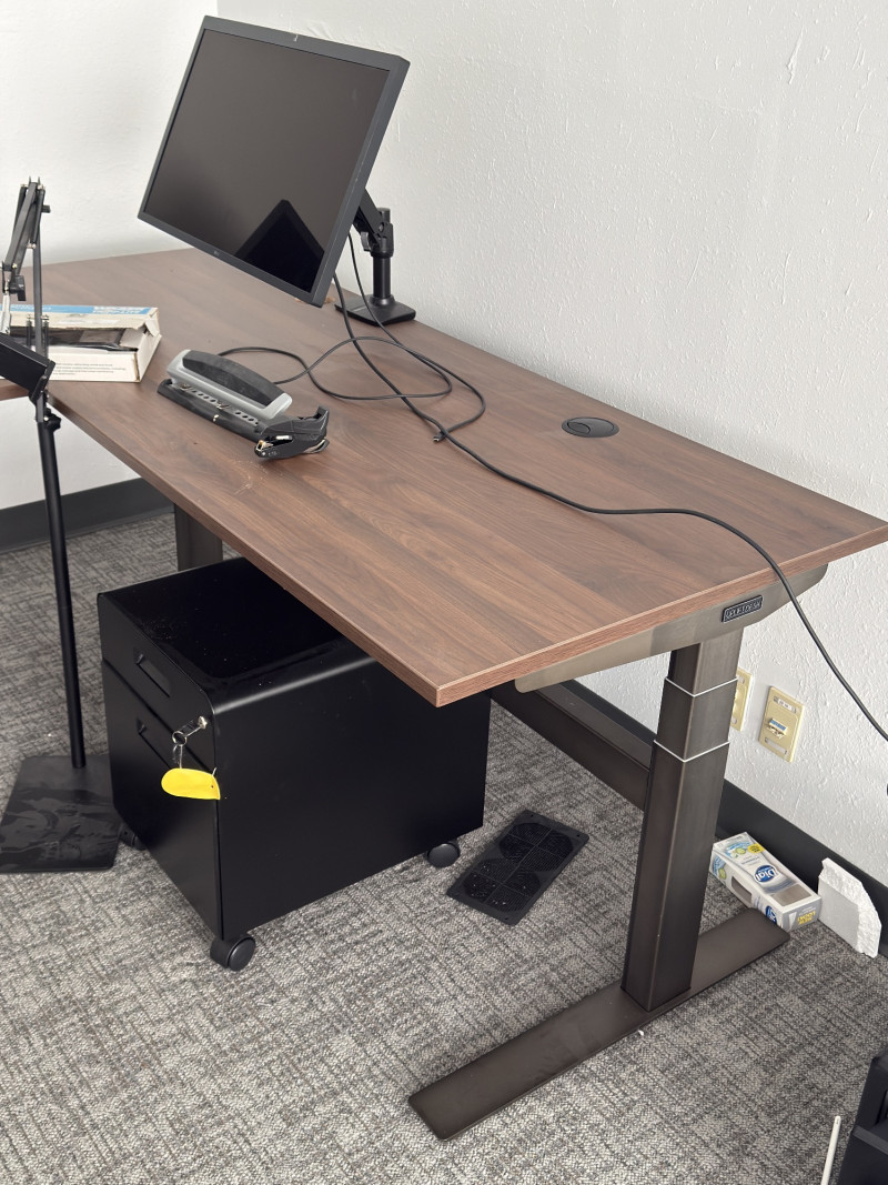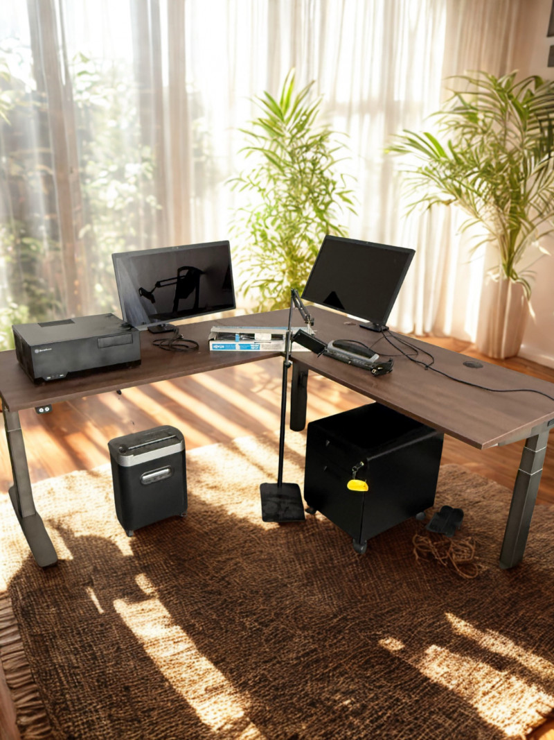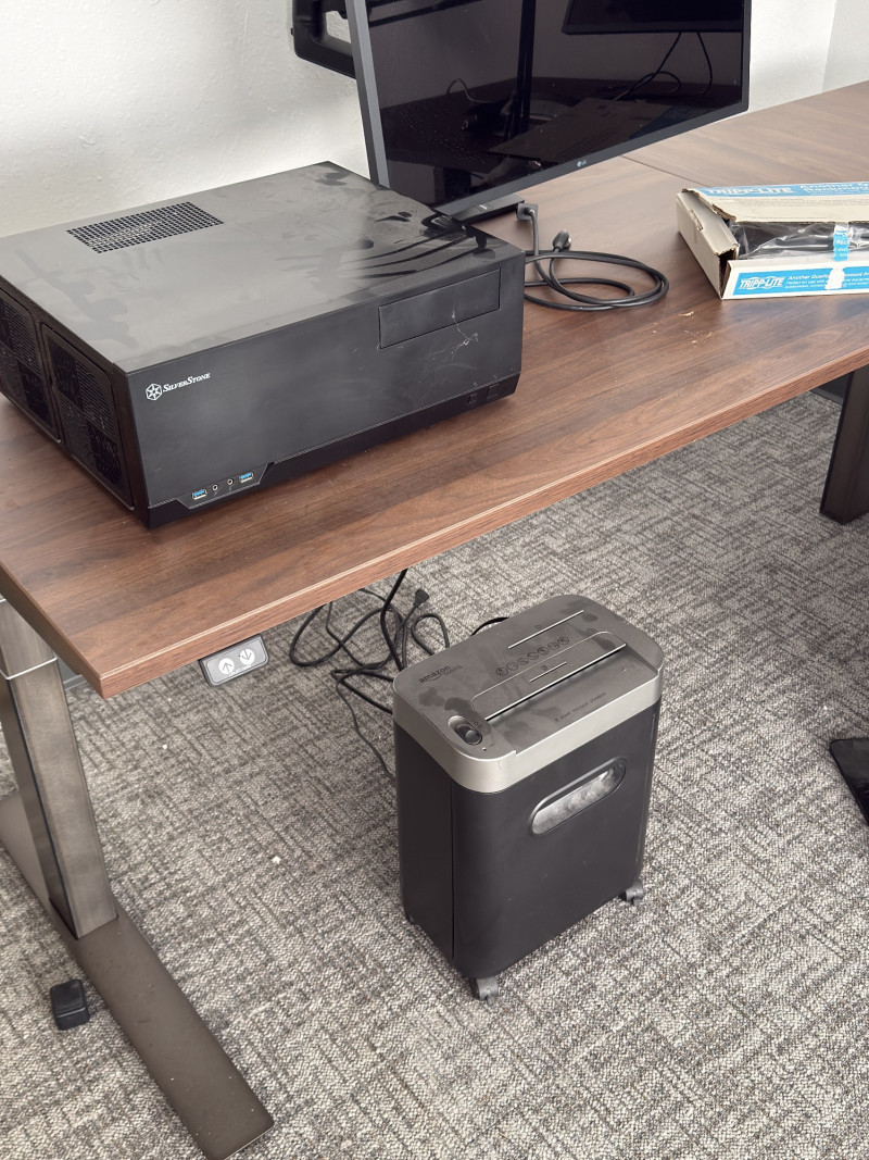 Complete Modern Office Setup – Uplift Desk, Electronics, and Accessories Elevate your workspace with this full office bundle, combining ergonomic design, reliable tech, and professional-grade accessories: Uplift Desk L-Shaped Electric Sit/Stand Desk – premium height-adjustable desk system with walnut surface, dual-motor lift, and sturdy steel frame. Retail new: ~$1,200+. LG Monitors (x2) – slim LED displays, perfect for dual-screen productivity setups. SilverStone Desktop Computer Tower – compact horizontal case with USB front ports (internal specs not verified, sold as-is). Fellowes Paper Shredder – wheeled crosscut shredder for office document security. Locking Black Metal File Cabinet – 2-drawer mobile storage unit with included key. Tripp Lite Waber Rackmount Power Distribution Unit (Model PDU1220T) – brand new in box. Retail value: ~$120. Tripp Lite Surge Protector – unopened in box, commercial-grade extension protection. Adjustable Microphone Boom Arm with Stand – podcasting or streaming-ready floor stand. Miscellaneous Accessories – hole punch, desk organizer, and assorted cabling included. Desk Measurements (approx.): Long side: ~72” Short side: ~60” Depth: ~30”