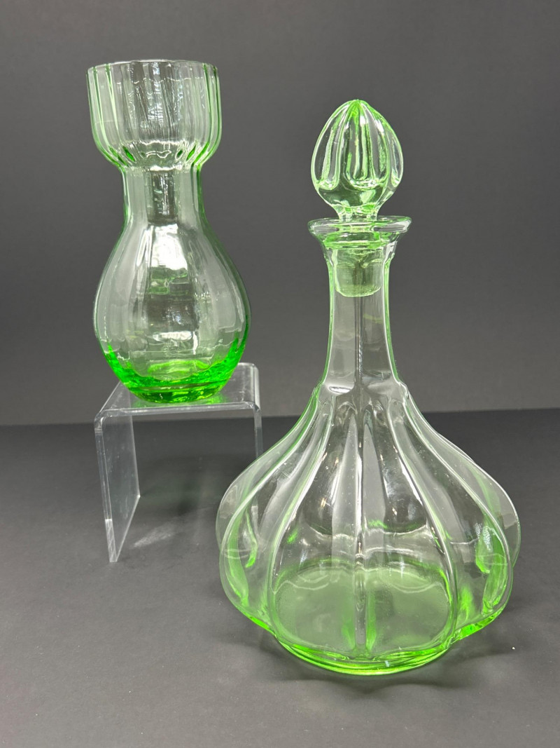 Lot # 10 - Mid-Century Green Glass Duo – Tiara Genie Bottle & Depression Carafe