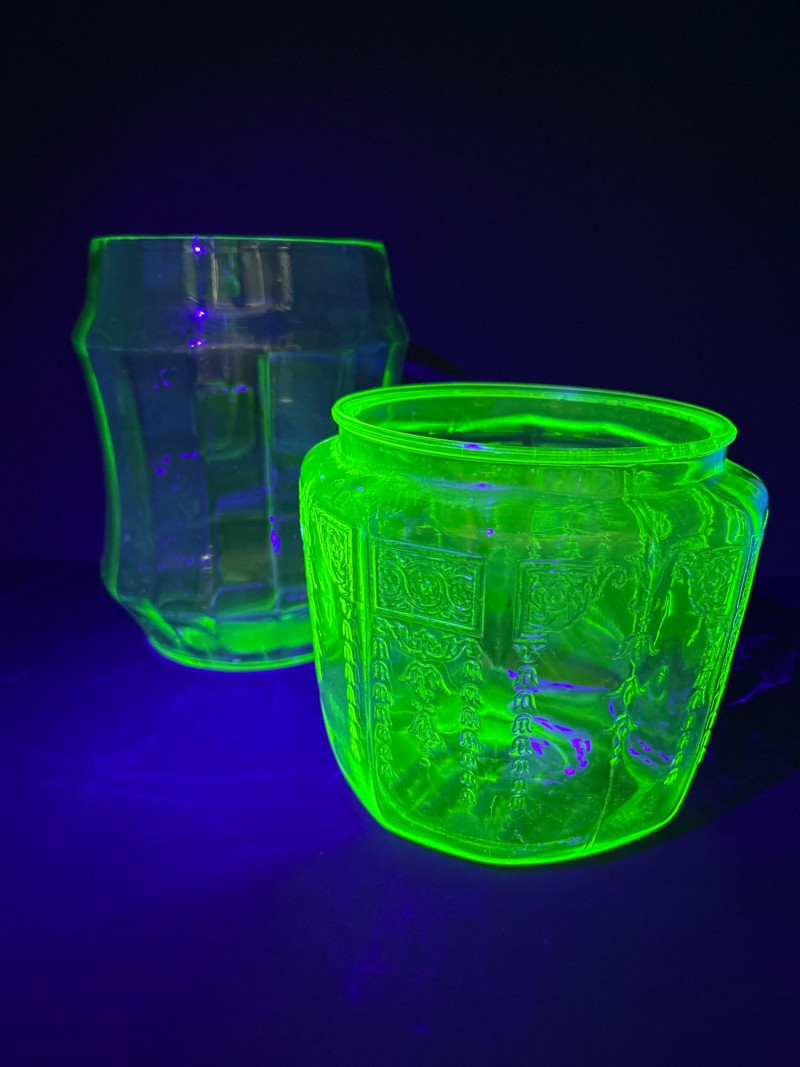 Dimensions: 5" tall × 7" wide Color: Transparent green; fluoresces bright neon under UV light Origin: Anchor Hocking Glass Co., USA, c.1931–1935 Design: Octagonal pressed glass with draped garlands, scrollwork, and geometric panels—hallmarks of the Princess pattern. Originally produced with a lid (not included). Style Notes: A quintessential Depression glass piece, celebrated for its Art Deco flourishes and vivid uranium glow. Dimensions: 7.5" tall × 7" wide Color: Pale green; fluoresces vividly under UV light Design: Smooth paneled body with gentle flare at rim and base. Clean Deco lines offer a sleek counterpoint to Jar A’s ornate styling. Style Notes: Likely American-made, c.1930s. Exemplifies the streamlined aesthetic of early modernist glassware.A – Anchor Hocking “Princess” Pattern Cookie Jar