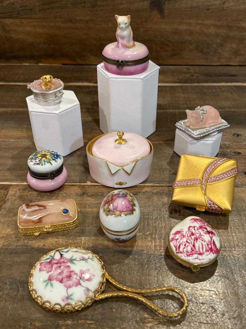 Dimensions: 2.75" tall Material: Hand-painted porcelain with brass mount and clasp Origin: Marked Castel Limoges France, Peint Main Design: Orange-and-white tabby cat atop an ombré pink base with gilt rim detailing Style Notes: A delightful miniature from Limoges—playful feline charm meets refined craftsmanship in a collectible palette. Dimensions: 1.75" tall Material: Silver-tone metal with gold puppy and faux-pearl bubbles Mark: Estée Lauder 2002 Design: Bathtub-shaped compact with hinged lid and traces of original solid perfume Style Notes: From Estée Lauder’s whimsical series—well-detailed, joyful, and highly sought-after by collectors. Dimensions: 2" tall Material: Frosted pink glass with silver-tone pillow base Mark: Estée Lauder 1995 Design: Reclining cat with rhinestone bow collar atop a textured cushion base Style Notes: A fan favorite—elegant frosted finish and jeweled accents make this compact a standout. Dimensions: 1.5" tall Material: Hand-painted enamel over metal with gilt mount Origin: Unmarked; French-style manufacture Design: Round form with colorful floral bouquet under clear glossy enamel Style Notes: Petite and polished—ideal for vanity styling or Limoges-inspired collections. Dimensions: 2.75" wide Material: Porcelain with gilt trim and finial lid Origin: Unmarked; French or Limoges-style Design: Oval pink-and-white form styled as a folded tuxedo collar with raised gold edging Condition: Small chips under lid Style Notes: A witty and elegant vanity accent—rare form with subtle age patina. Dimensions: 1.75" wide Material: Matte gold-tone metal with pink rhinestones Mark: Estée Lauder Design: Square compact with intersecting rhinestone ribbons and interior mirror Style Notes: Created for Estée Lauder’s awareness campaign—radiant, symbolic, and empowering. Dimensions: 2.25" tall Material: Hand-painted porcelain with gilt accents Origin: Marked Limoges France Design: Egg-shaped box with Rococo courting couple and floral borders Style Notes: Classic Limoges romance—fine brushwork and period elegance. Dimensions: 2.25" wide Material: Porcelain with gilt metal mount Origin: Unmarked; likely French or Continental Design: Raspberry-red transfer of a romantic couple in a pastoral landscape Style Notes: Evokes 18th-century engravings—graceful and decorative, ideal for display. Dimensions: 2.25" wide Material: Gold-tone metal with swirled faux-agate enamel and blue cabochon clasp Mark: Estée Lauder 1974 Design: Rectangular compact for Youth Dew perfume; retains faint perfume traces Style Notes: One of Estée Lauder’s earliest designs—vintage opulence with timeless appeal. Dimensions: 4" long Material: Porcelain with gilt metal frame and handle Origin: Unmarked; French-style, mid-20th century Design: Hand-painted cherry blossom motif framed in ormolu gilt metal Style Notes: A delicate vanity piece—pairs beautifully with Limoges and enamel boxes.1 – Castel Limoges “Kitty Cat” Trinket Box
