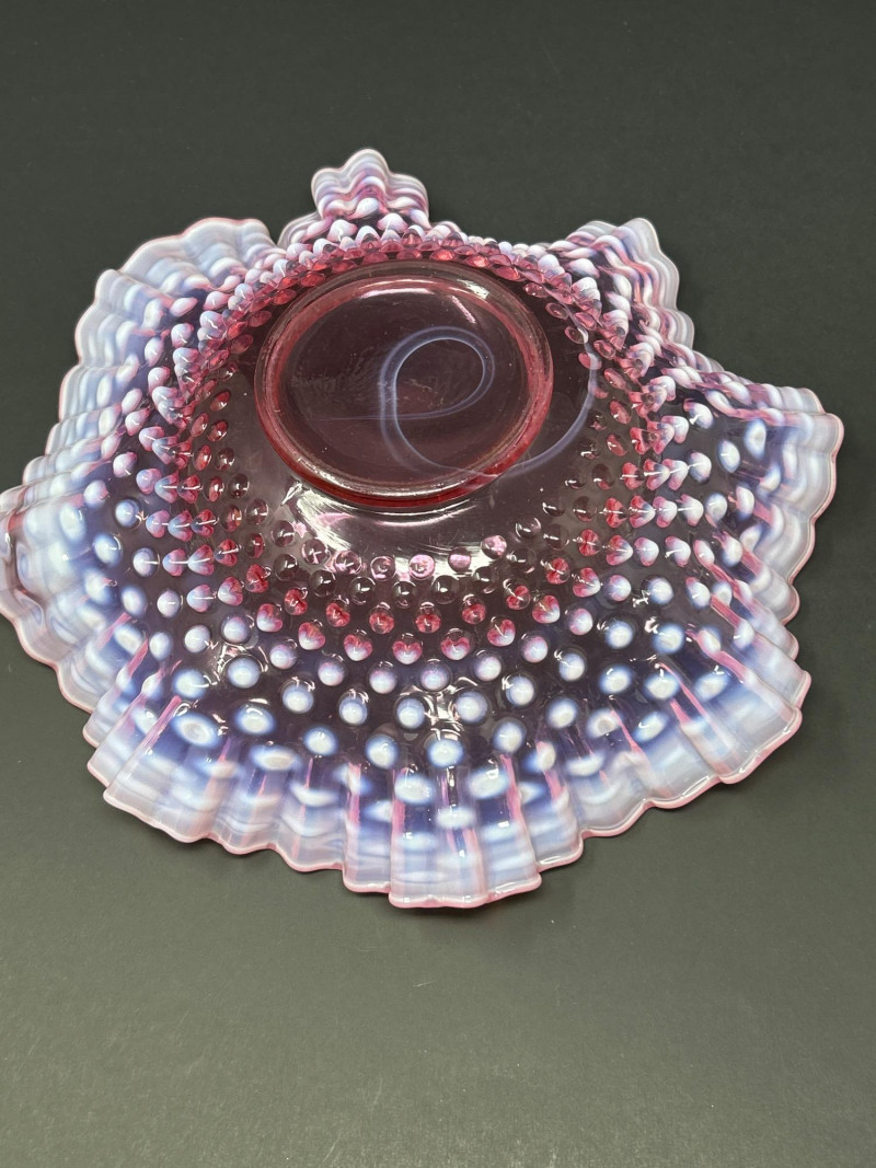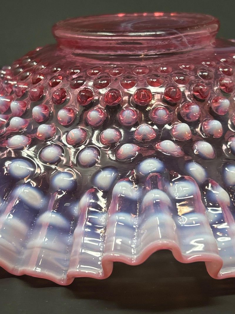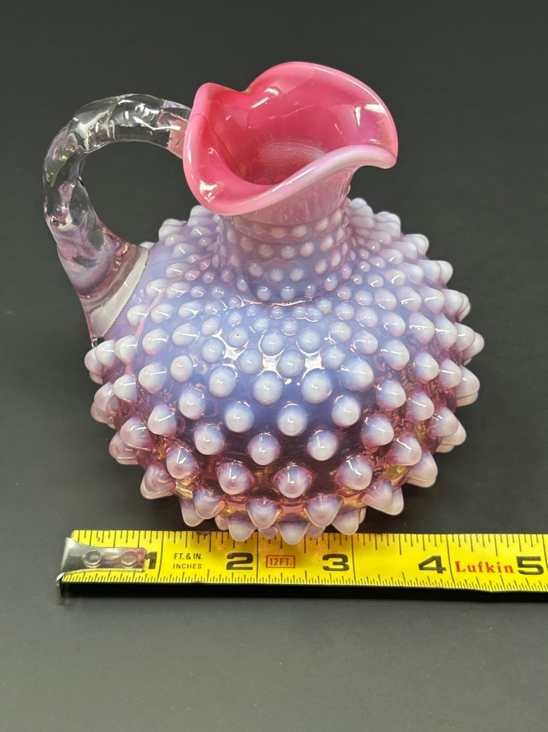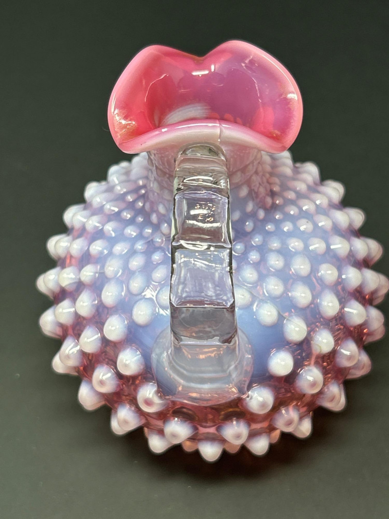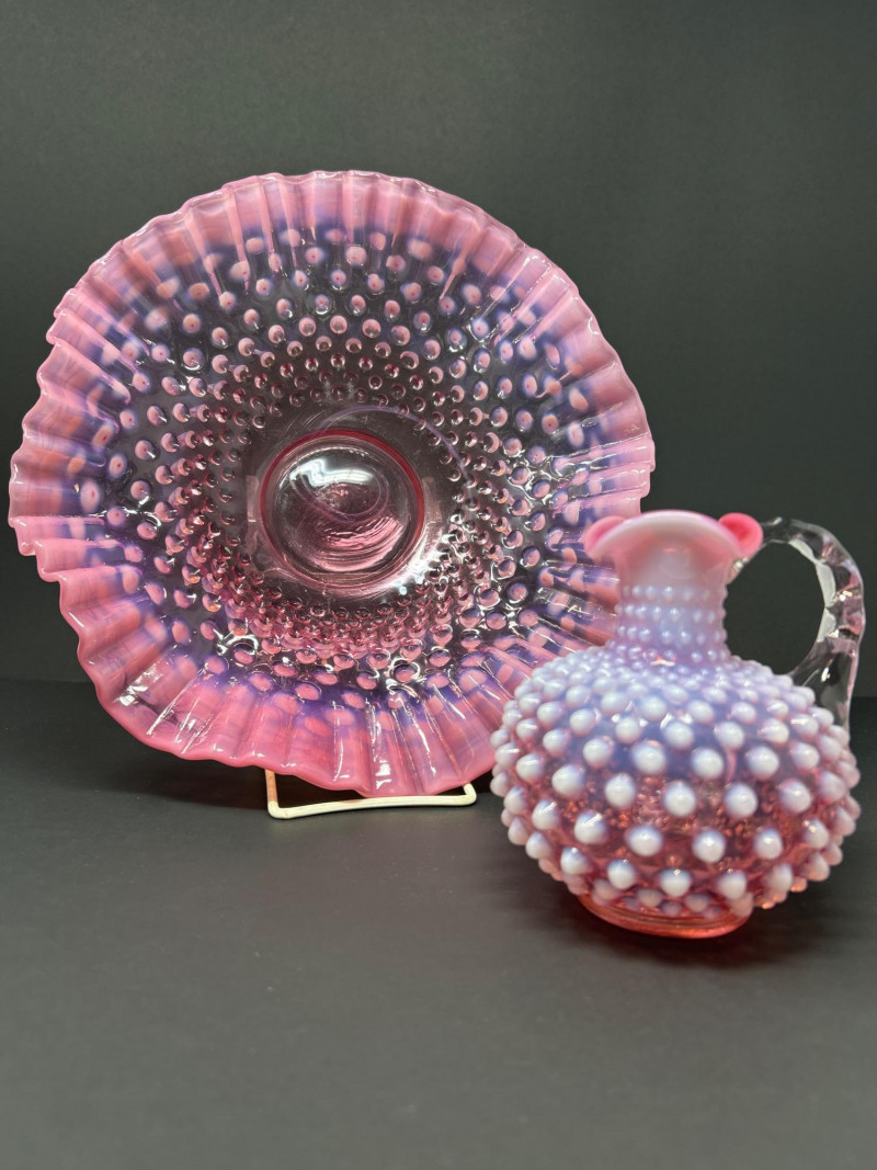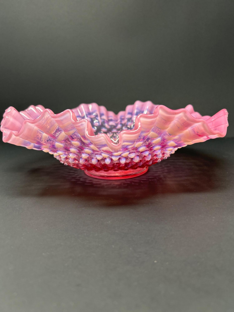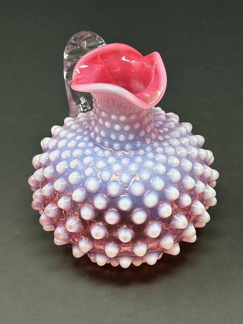 Bowl – Cranberry Opalescent Ruffled Edge Dimensions: 2.75" tall × 7.5" wide Color: Cranberry pink with opalescent white highlights Design: Deeply ruffled rim with raised hobnail texture. The body transitions from transparent cranberry to milky white under light, creating a luminous glow. Style Notes: A vibrant example of mid-century American decorative glass—textural, radiant, and elegantly formed for vanity or display. Cruet – Cranberry Opalescent Hobnail with Clear Handle Dimensions: 4.75" tall × 4.5" wide (handle to spout) Color: Matching cranberry-to-opalescent gradient with clear applied handle Design: Bulbous hobnail body with ruffled lip and clear applied handle. Likely produced by Fenton Art Glass, known for its radiant color transitions and fine handwork. Style Notes: A charming companion to the ruffled bowl, pairing rich color with the tactile appeal of opalescent hobnail glass.