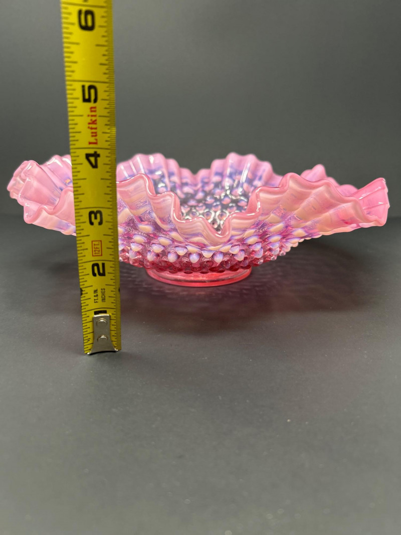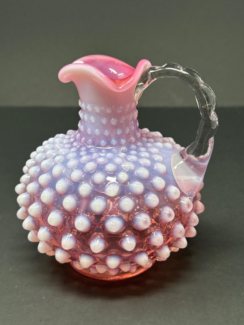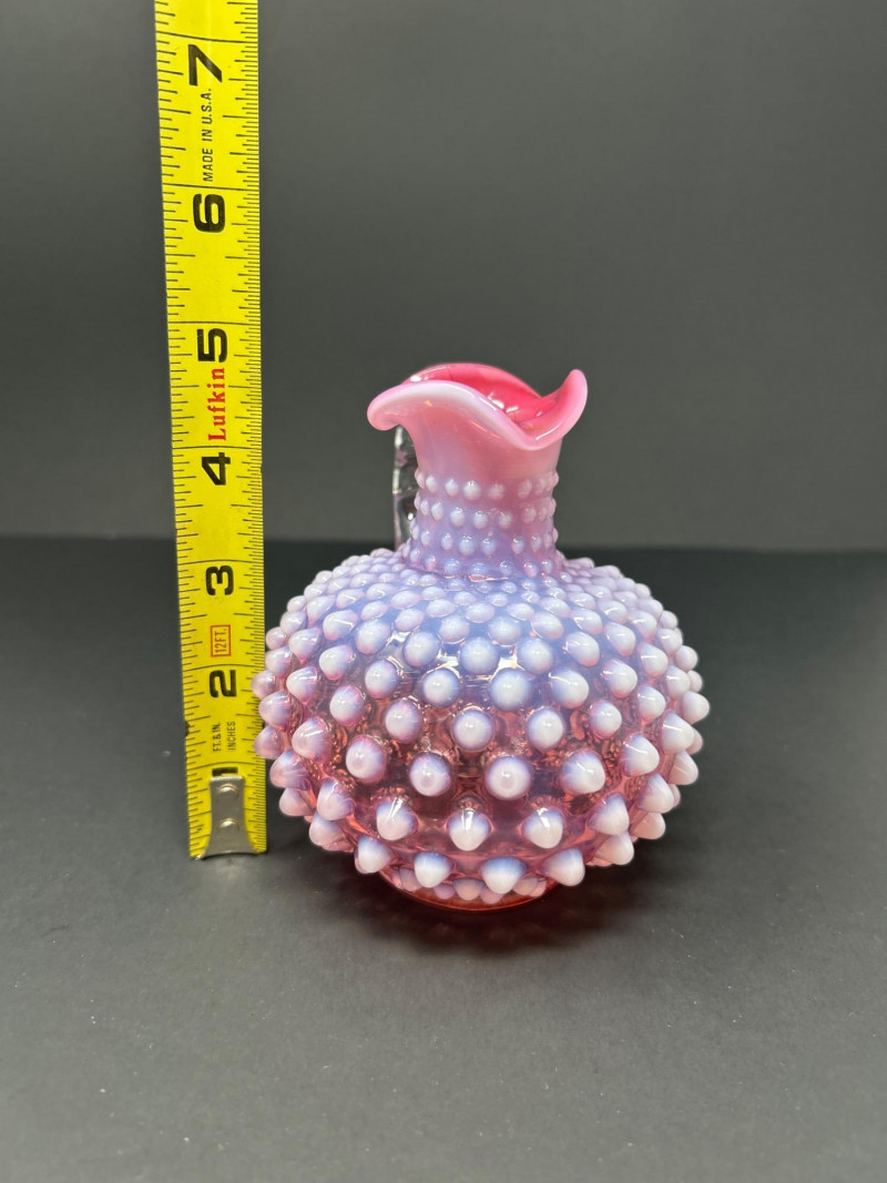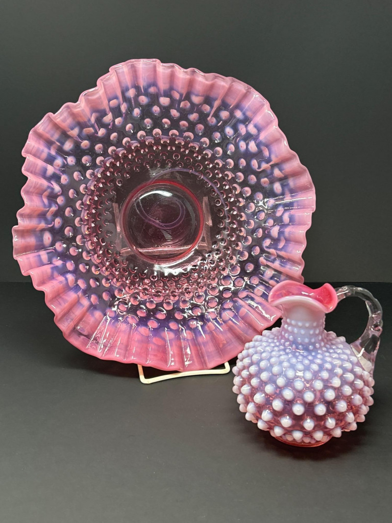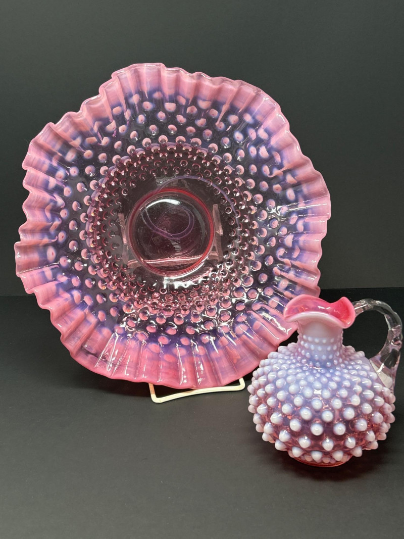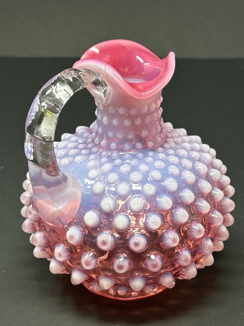 Bowl – Cranberry Opalescent Ruffled Edge Dimensions: 2.75" tall × 7.5" wide Color: Cranberry pink with opalescent white highlights Design: Deeply ruffled rim with raised hobnail texture. The body transitions from transparent cranberry to milky white under light, creating a luminous glow. Style Notes: A vibrant example of mid-century American decorative glass—textural, radiant, and elegantly formed for vanity or display. Cruet – Cranberry Opalescent Hobnail with Clear Handle Dimensions: 4.75" tall × 4.5" wide (handle to spout) Color: Matching cranberry-to-opalescent gradient with clear applied handle Design: Bulbous hobnail body with ruffled lip and clear applied handle. Likely produced by Fenton Art Glass, known for its radiant color transitions and fine handwork. Style Notes: A charming companion to the ruffled bowl, pairing rich color with the tactile appeal of opalescent hobnail glass.