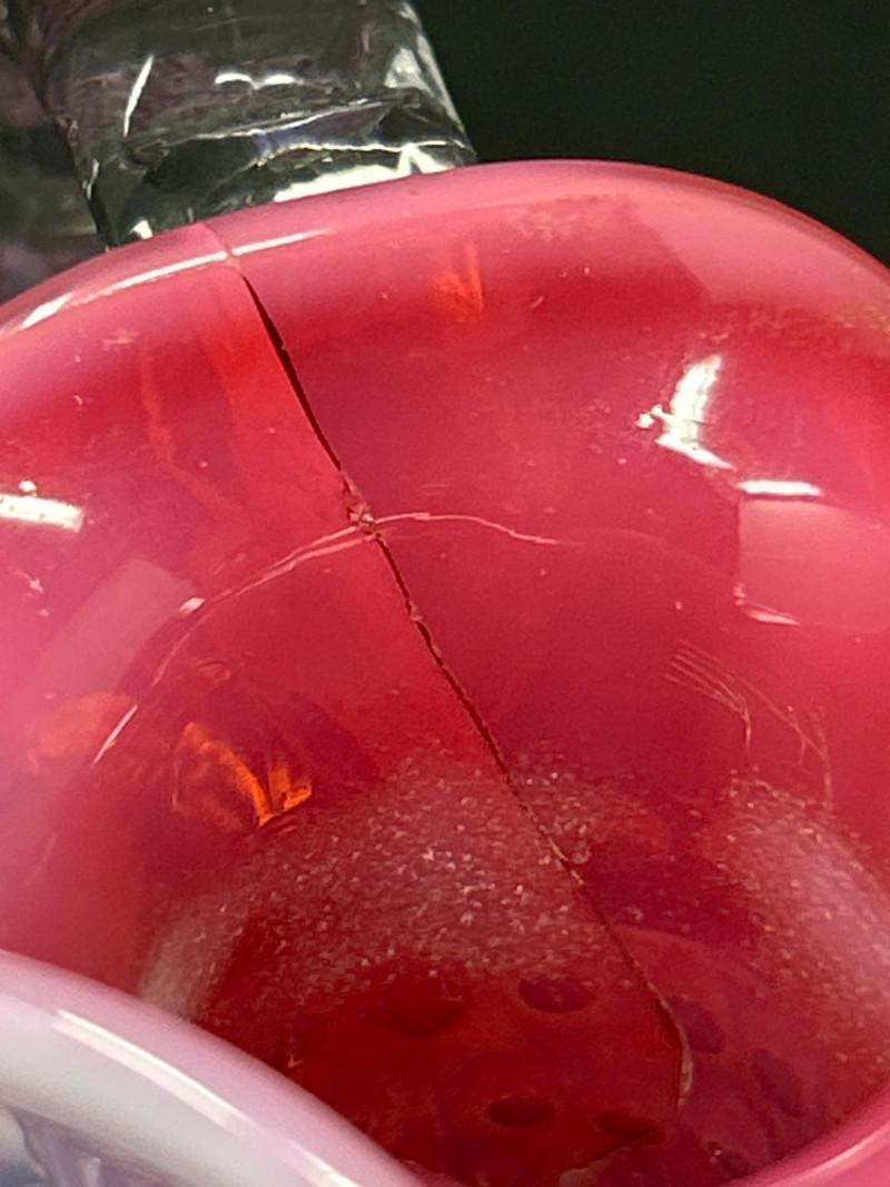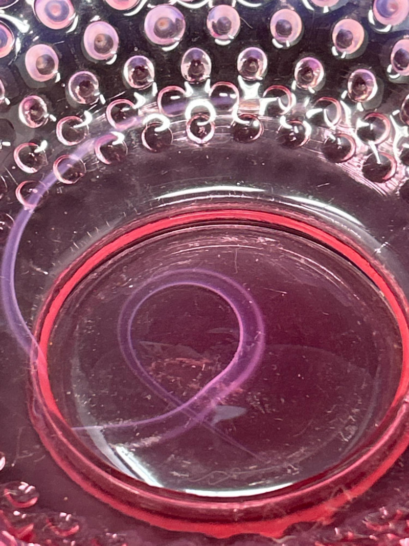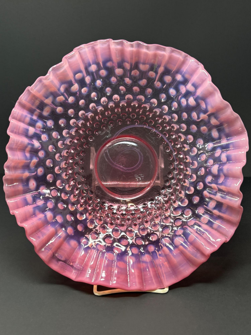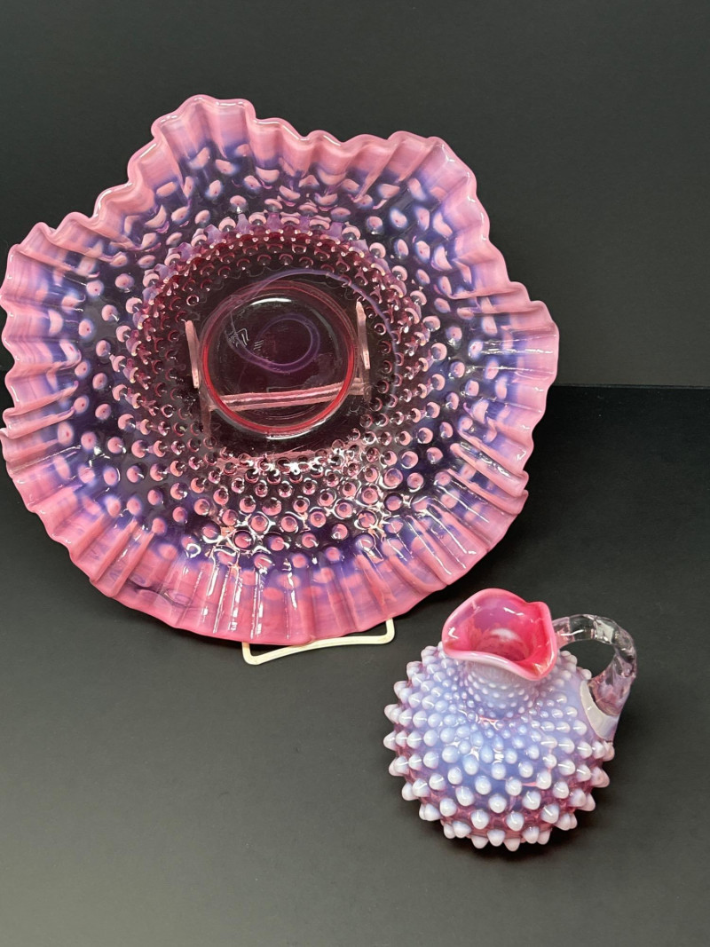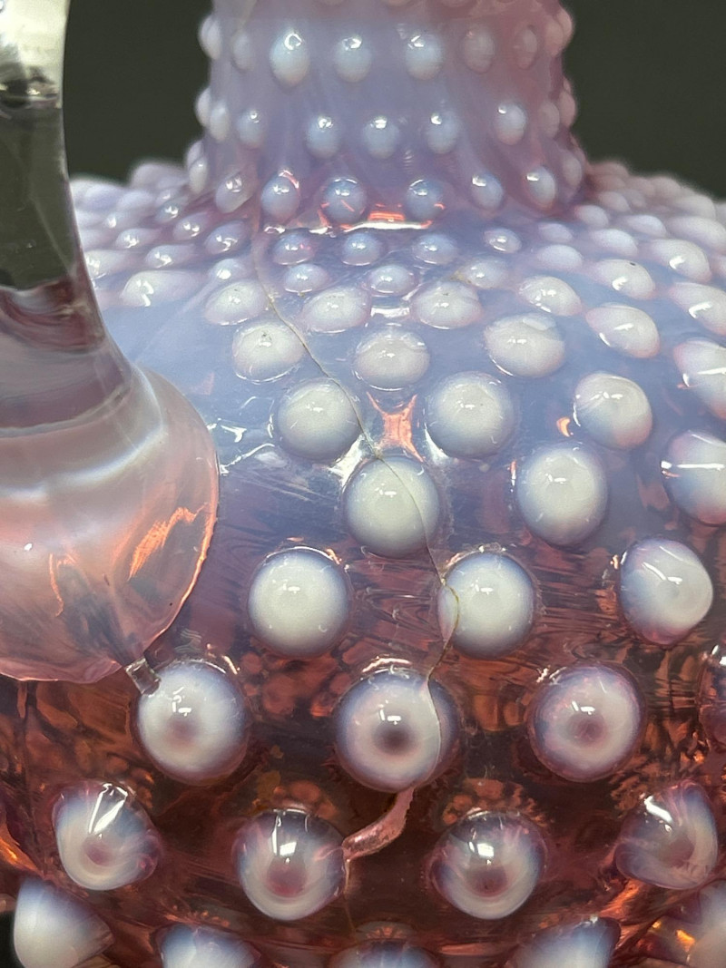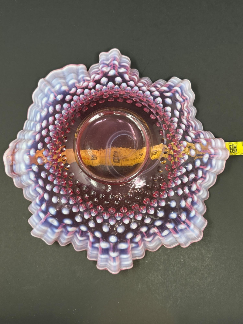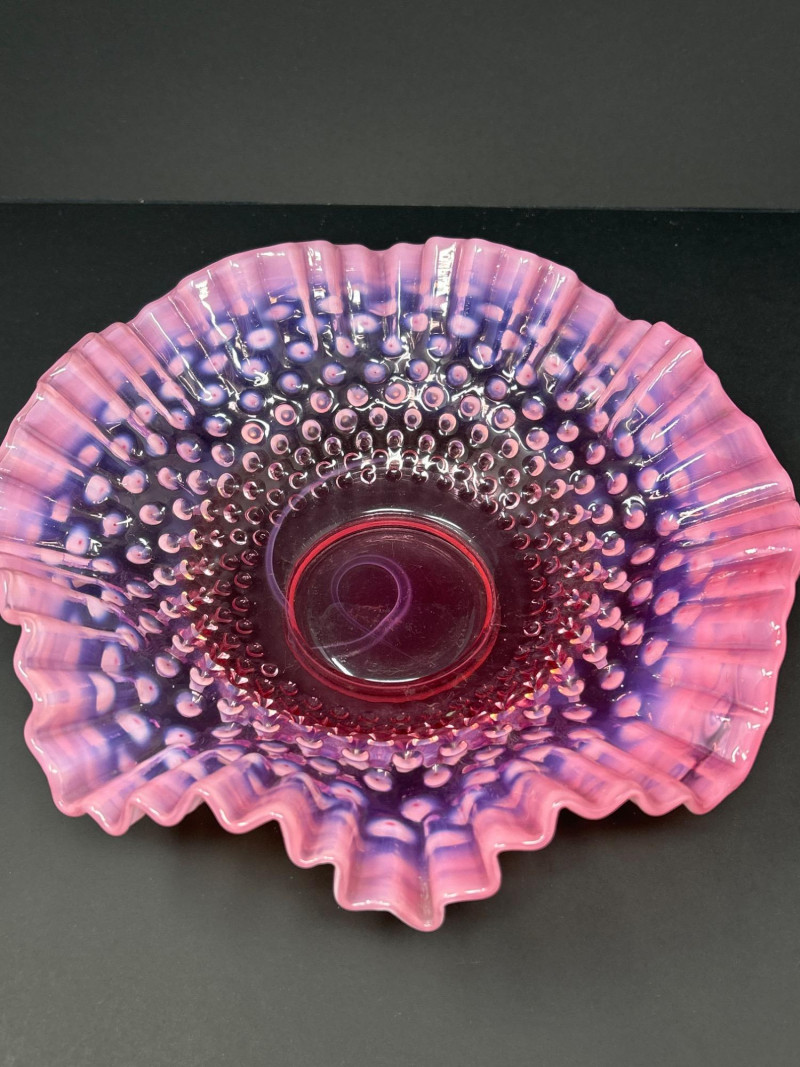 Bowl – Cranberry Opalescent Ruffled Edge Dimensions: 2.75" tall × 7.5" wide Color: Cranberry pink with opalescent white highlights Design: Deeply ruffled rim with raised hobnail texture. The body transitions from transparent cranberry to milky white under light, creating a luminous glow. Style Notes: A vibrant example of mid-century American decorative glass—textural, radiant, and elegantly formed for vanity or display. Cruet – Cranberry Opalescent Hobnail with Clear Handle Dimensions: 4.75" tall × 4.5" wide (handle to spout) Color: Matching cranberry-to-opalescent gradient with clear applied handle Design: Bulbous hobnail body with ruffled lip and clear applied handle. Likely produced by Fenton Art Glass, known for its radiant color transitions and fine handwork. Style Notes: A charming companion to the ruffled bowl, pairing rich color with the tactile appeal of opalescent hobnail glass.