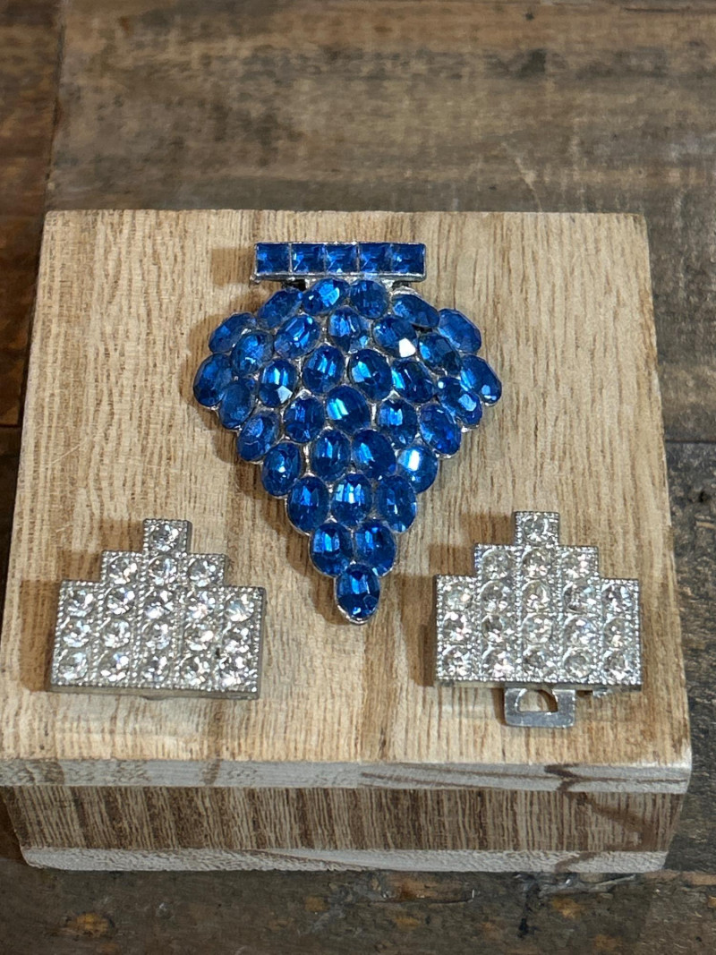 Dress Clip – Art Deco Blue Rhinestone Shield Dimensions:2.5" tall × 1.75" wideColor:Deep sapphire blue Material:Silver-tone metal with faceted glass rhinestones Design:Cascading shield form featuring multiple oval-cut rhinestones and a rectangular bar of square stones at the top. The reverse includes an ornate etched backplate and working hinged clip typical of 1930s craftsmanship. Style Notes:A striking example of Art Deco glamour with bold geometric symmetry and brilliant blue radiance. Originally used as a dress or fur clip to accent necklines, hats, or belts. Buckles (Pair) – Clear Rhinestone Geometric Stepped Design Dimensions:1.25" tall × 1.25" wide (each) Color:Clear crystal Material:Silver-tone metal with prong-set rhinestones Design:Tiered rectangular form set with clear faceted stones, showcasing the classic stepped Art Deco motif. Style Notes:Versatile accessories that once adorned shoes or fabric trims, these buckles echo the architectural style of the era and complement the blue clip beautifully as a matched set.