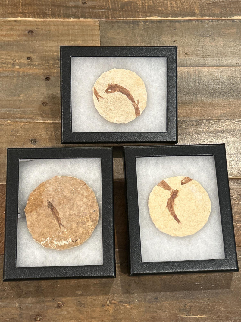 A curated trio of authentic fossil fish specimens from Wyoming’s Green River Formation, dating to the Eocene Epoch (~50 million years ago). Each specimen is preserved in cream-to-tan shale with visible skeletal and fin structures, professionally mounted in black glass-fronted frames. These examples reflect the exceptional fossilization conditions of this iconic formation. Formation:Green River Formation Age:Eocene Epoch (~50 million years) Location:Wyoming, USA Species (likely):Knightia eocaenaor Diplomystus dentatus Material:Fossil fish in natural shale matrix Display:Black frames with protective glass and foam backing Frame Size:Approx. 6.5” H × 5” W Fossil Disc Size:Approx. 3.5”–4” diameter Note: Green River fish fossils are among the most widely collected vertebrate fossils, valued for their clarity, provenance, and accessibility.