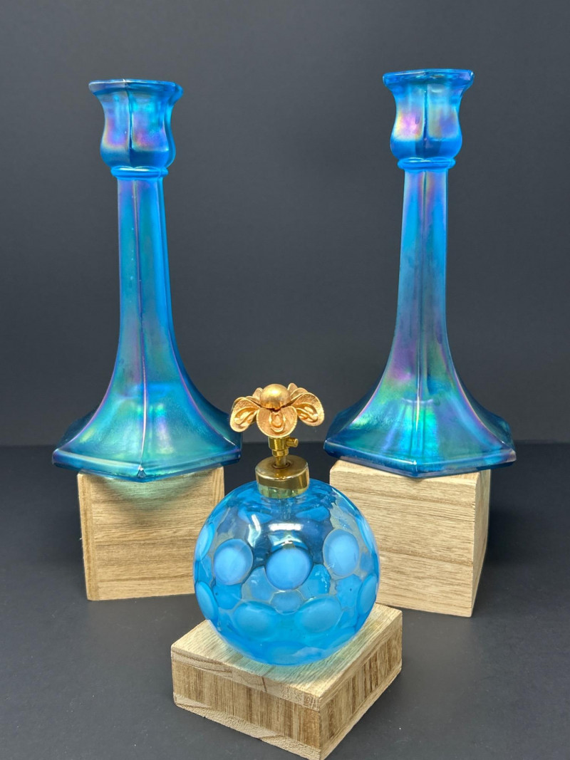 Candlestick Holders – Iridescent Blue Stretch Glass Dimensions: Approx. 8.5" tall Color: Deep iridescent blue with multicolor shimmer Design: Hexagonal base with flared top and slender neck Finish: Satin-like stretch glass surface with subtle striations Condition: One holder has a small chip on the underside of the base Style Notes: Likely American stretch glass, circa 1920s–1930s. Elegant symmetry and soft luster make these ideal for vintage table settings or vanity décor. Perfume Atomizer – Coin Dot Cased Glass Dimensions: Approx. 5" tall x 3" diameter Color: Powder blue with opalescent white coin dot pattern Design: Rounded body with raised circular motifs, topped with a gold-tone floral atomizer Glass Type: Cased glass with layered color and texture Style Notes: Attributed to Fenton for DeVilbiss, circa 1940s–1950s. A charming mid-century vanity piece with collectible appeal.