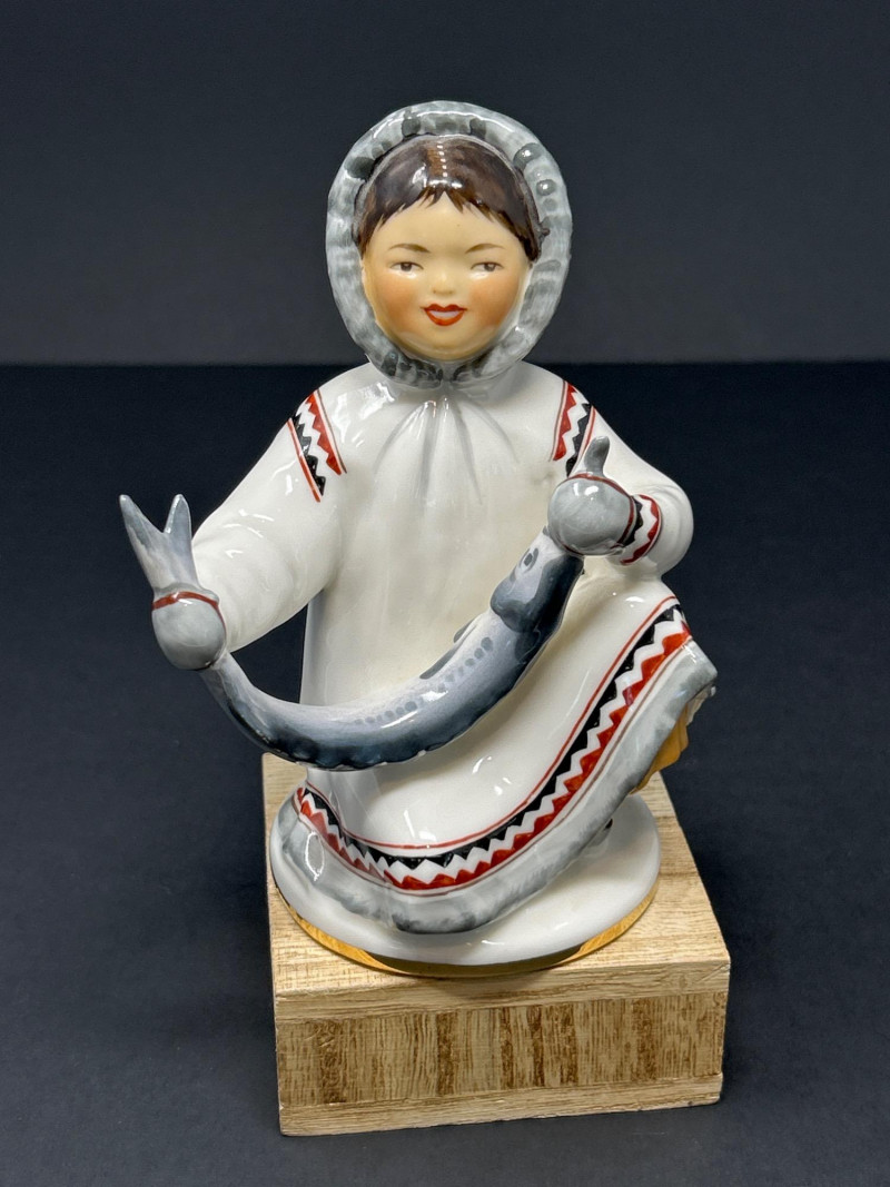 A rare mid-century porcelain figurine crafted by the Lomonosov Porcelain Factory (ЛФЗ), Saint Petersburg, USSR, depicting a seated Yakut (Sakha) girl in traditional winter attire, holding a fish—symbolizing subsistence and cultural heritage. Origin: Stamped “ЛФЗ” and “MADE IN USSR” on base; authentic Soviet-era production. Date: Circa 1950s. Material: Glazed porcelain with hand-painted polychrome accents. Design Details: White hooded parka with red and black geometric trim. Fur-textured hood lining and serene facial expression. Fish rendered in blue-gray tones, held in both hands. Mounted on a circular base; some variants include a wooden plinth. Dimensions: Approx. 5 inches (12.7 cm) tall. Provenance: Estate collection; matches known LFZ catalog examples. Collector Appeal: