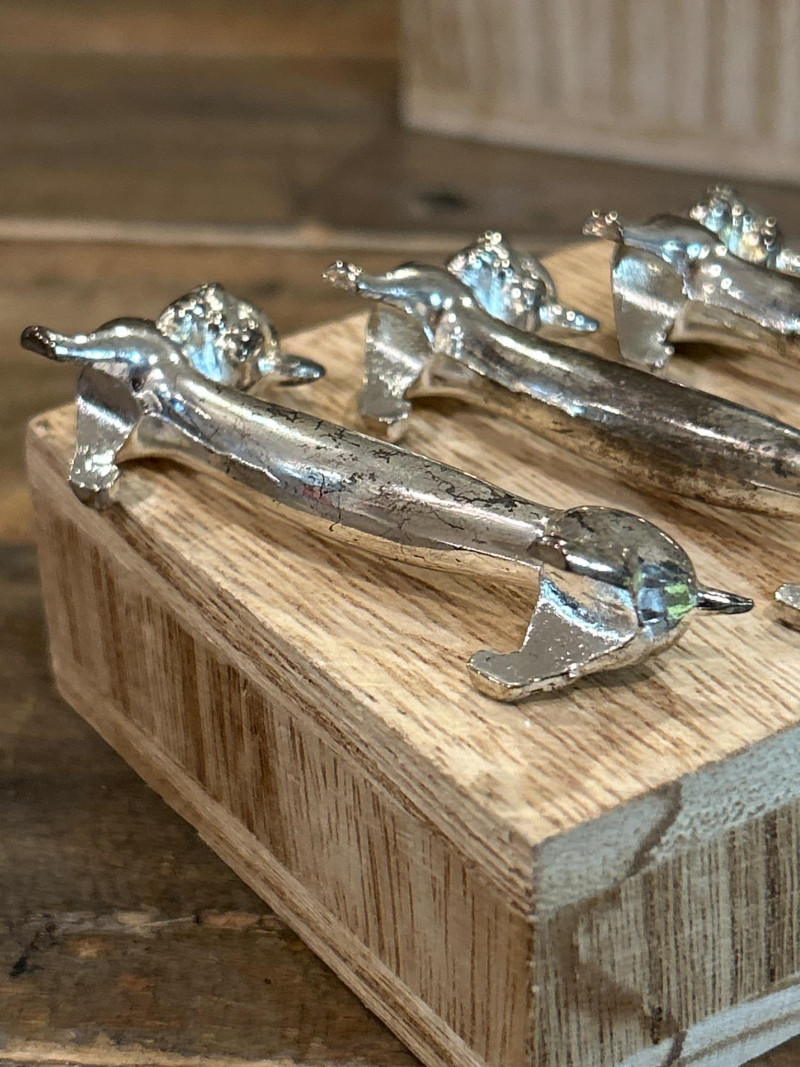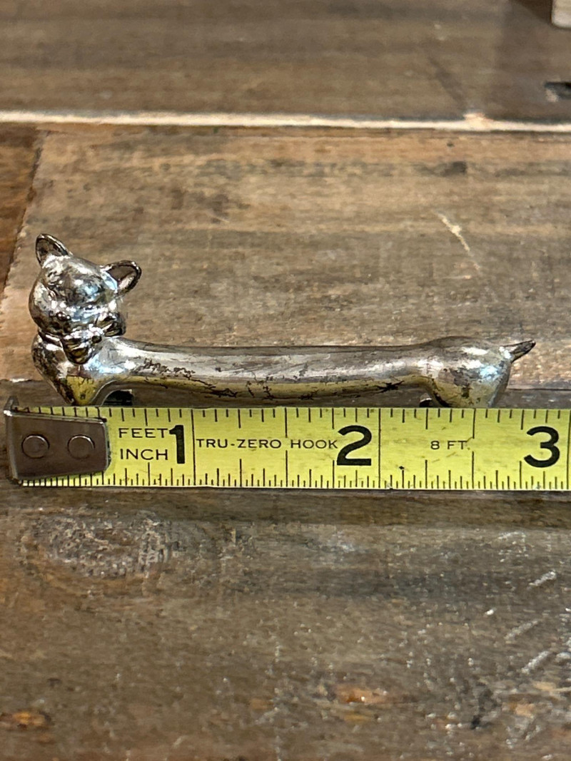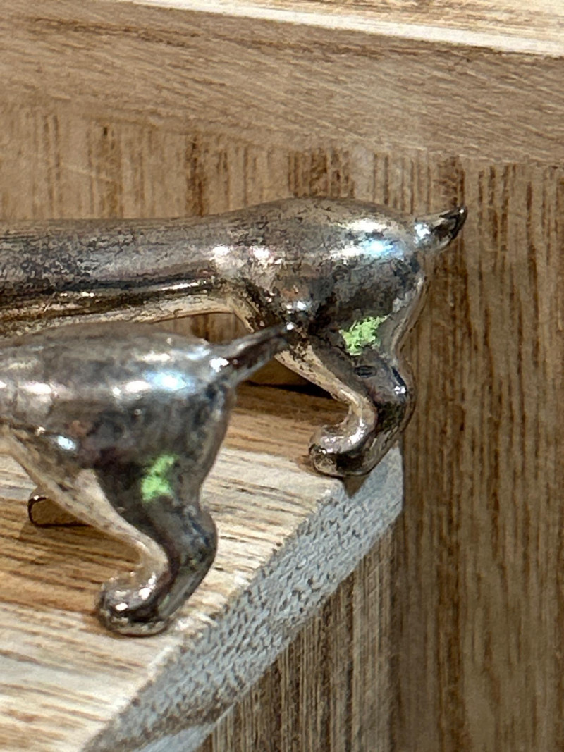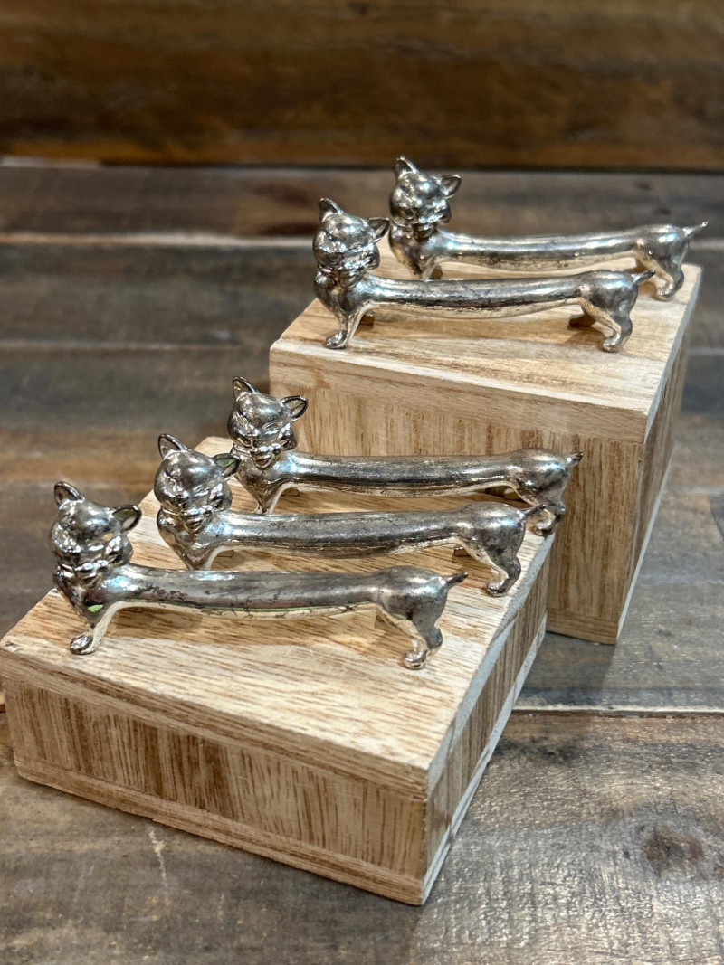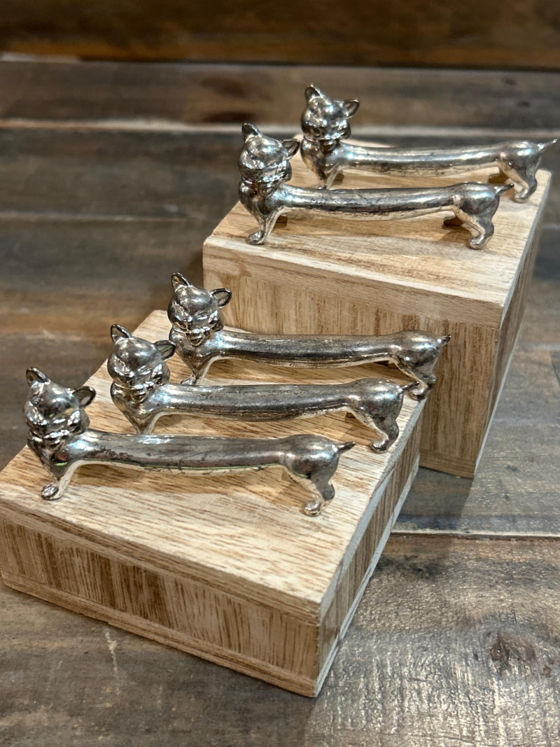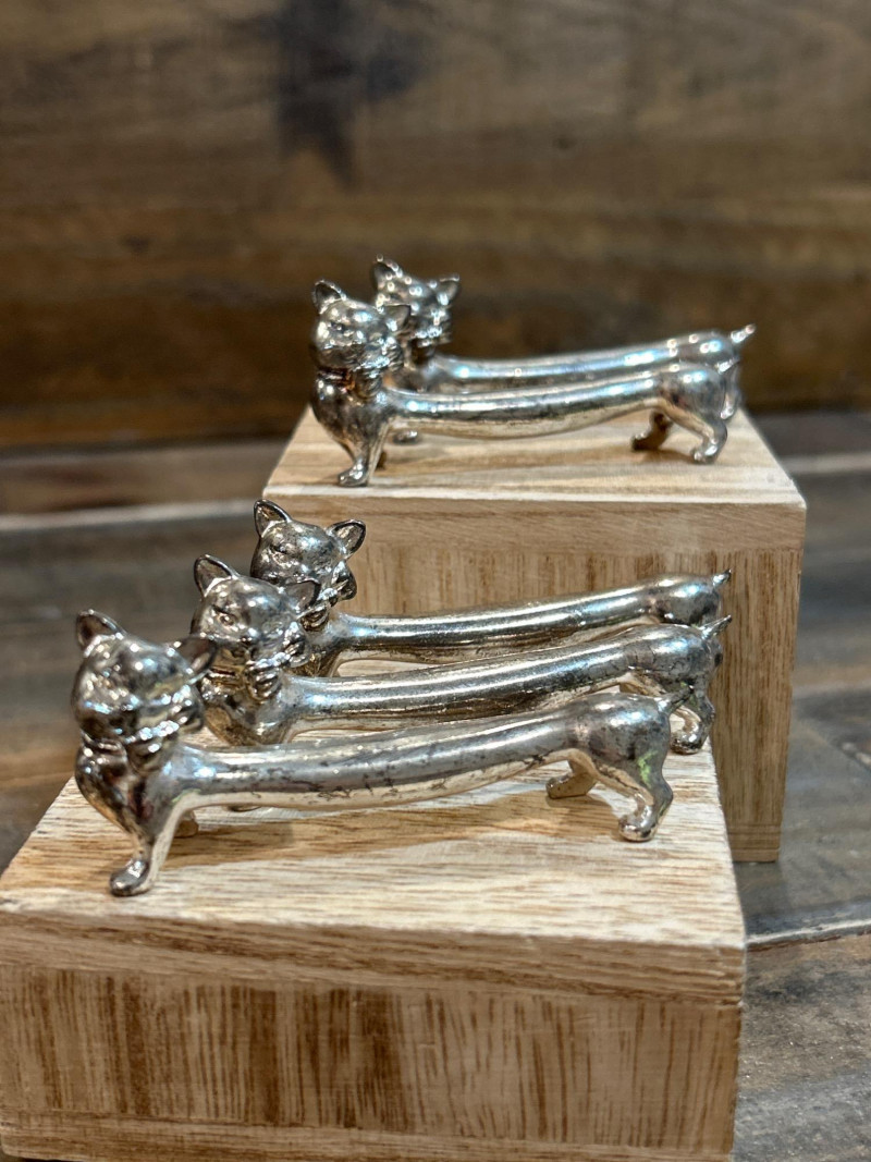 Add a dash of feline flair to your table with this charming set of five vintage knife rests. Each one features a sleek cat with perked ears and a gently arched back—designed to keep your cutlery elevated and your style on point. Measuring approx. 3" × 1", they’re perfect for collectors or anyone who loves a touch of whimsy. Material: Silver-tone metal alloy Includes: 5 matching cat-shaped knife rests Why You’ll Love Them: