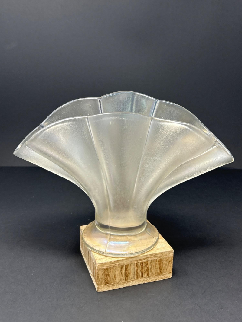 A luminous vintage Fenton fan vase crafted in frosted satin glass with a radiant opalescent sheen. This elegant piece features a flared, fan-shaped silhouette with scalloped edges and a soft iridescence that dances across its surface under light. Measuring approximately 7 inches tall and 8 inches wide, it captures the romantic charm and craftsmanship of mid-century Fenton glassware. The vase’s translucent body glows with pastel undertones—subtle hints of pink, blue, and gold shimmer through its pearlescent finish. Its molded glass form evokes stylized petals or shell motifs, making it a standout accent for vanity displays, vintage lighting setups, or curated glass collections. Height: approx. 7 inches Width (rim): approx. 8 inches Base diameter: approx. 3 inches Typical of certain Fenton production runs. Likely dates from the 1950s–1970s. May have originally served as a lamp shade or decorative vase. Ideal for collectors of Fenton, opalescent glass, or romantic vintage décor.Dimensions: