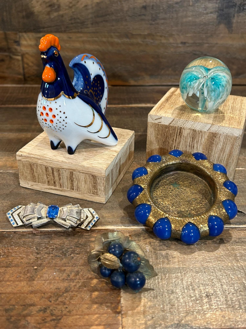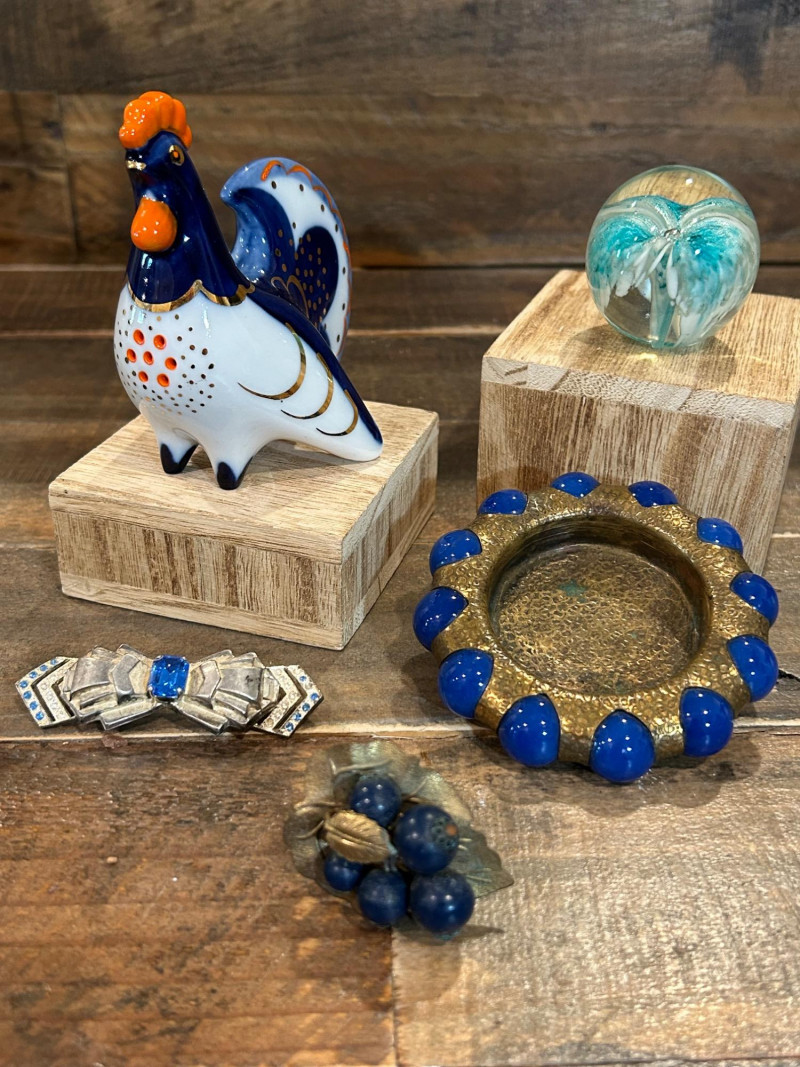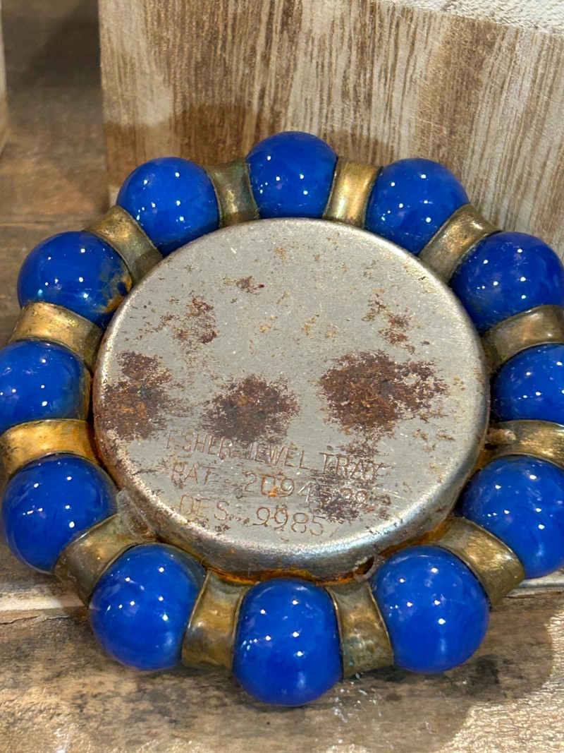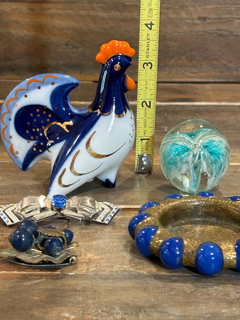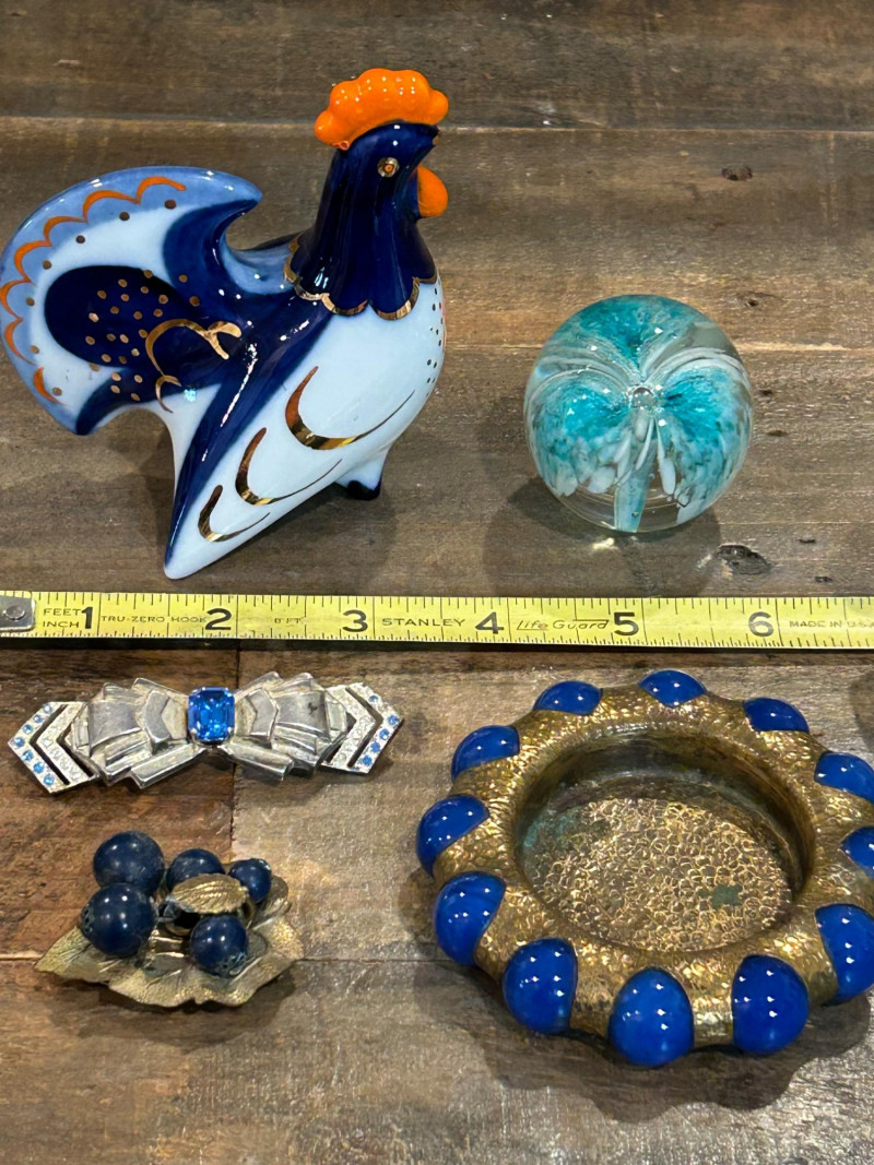Maker: Henry Arthur “Art” Fisher, Vitro Agate Co. Markings: “PAT 2094259” and “DES 9985” on underside Dimensions: Approx. 3¼" diameter Material: Gold-tone metal with embedded blue glass marbles Notes: Rare and historically documented; designed by a non-smoker as a decorative alternative to ashtrays Design: Clear dome with internal turquoise and white floral burst Dimensions: Approx. 2.5" diameter Style: Mid-century modern; resembles underwater flora or sea anemone Notes: Comparable to handmade Murano glass; ideal as a desk accent or shelf display Origin: Soviet-era Lomonosov porcelain Design: Stylized rooster with cobalt blue head, red comb, and gold accents Dimensions: Approx. 4" tall Condition: No chips or cracks; stopper missing Notes: Highly collectible; vibrant folk-art aesthetic Design: Stylized ribbon with central blue stone and clear rhinestone accents Dimensions: Approx. 2.25" wide Era: 1950s–60s costume jewelry Notes: Elegant and versatile; suitable for wear or display Design: Glossy dark blue beads arranged as berries with textured silver-tone leaves Dimensions: Approx. 2" long Style: Naturalistic mid-century design Notes: Adds botanical charm to any collectionFisher Jewel Tray – 1936 Patent-Stamped Ashtray with Blue Marbles