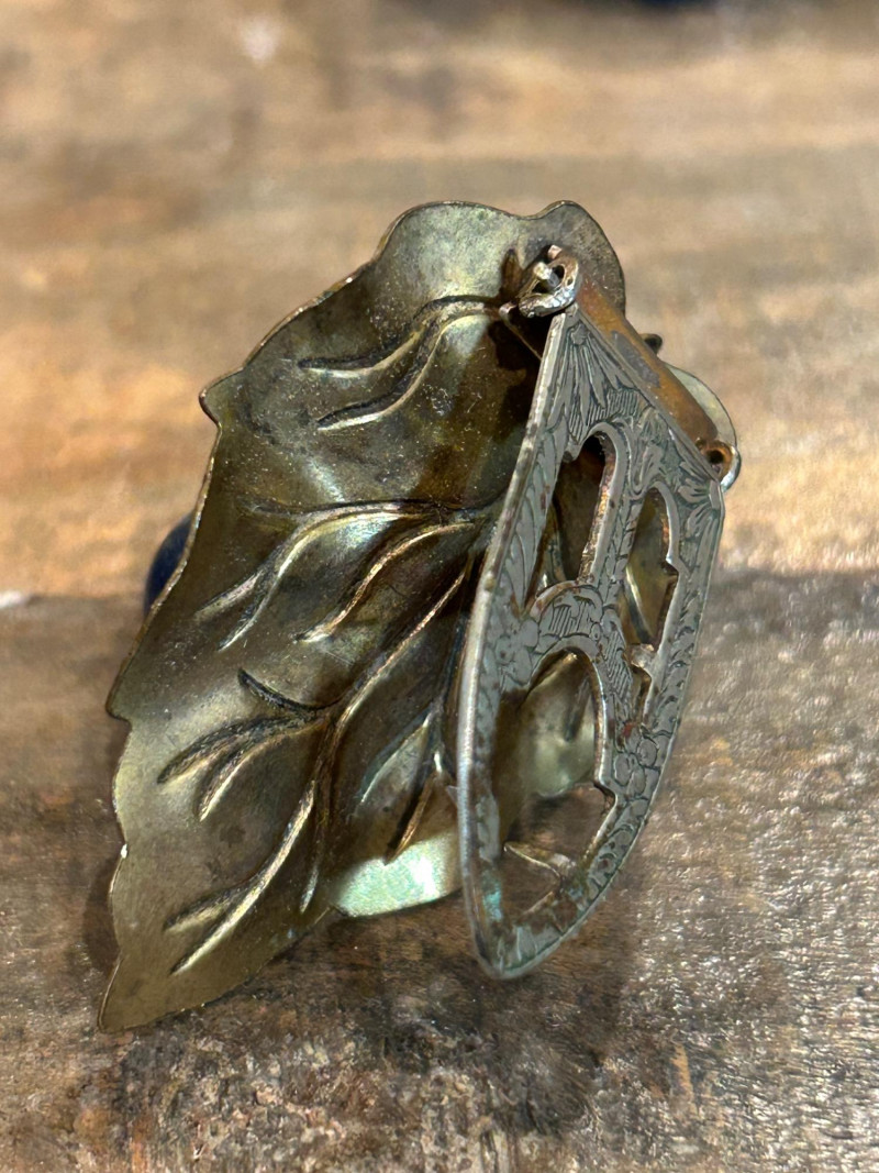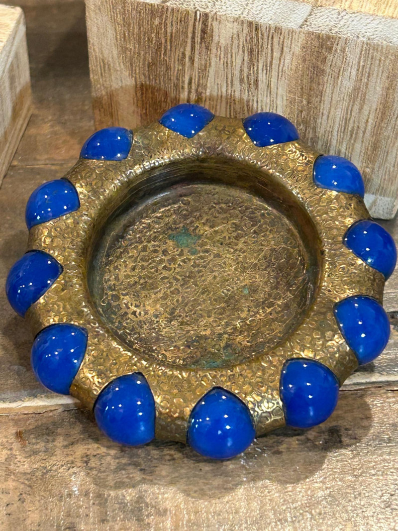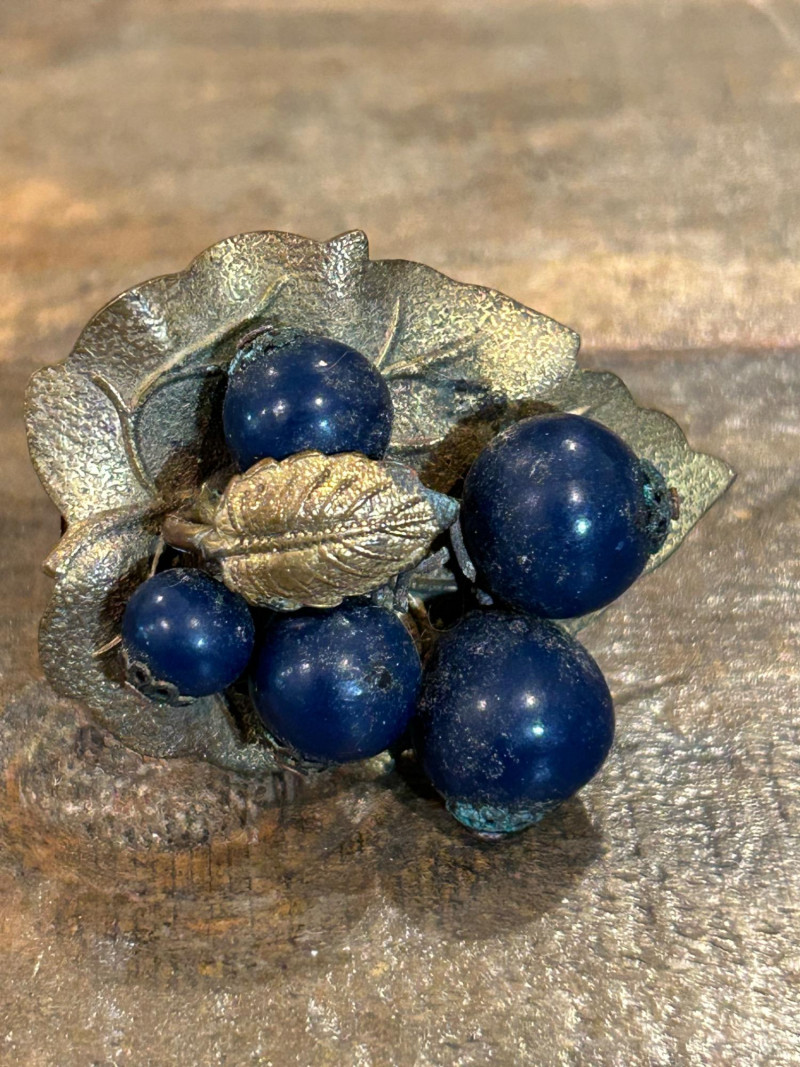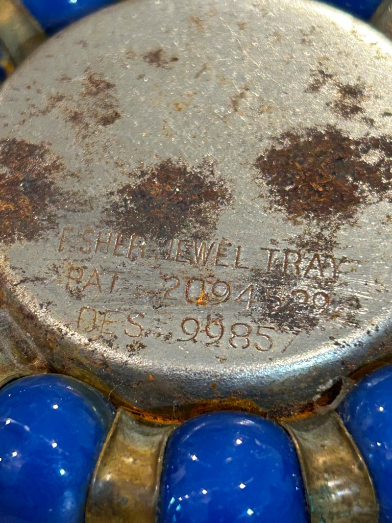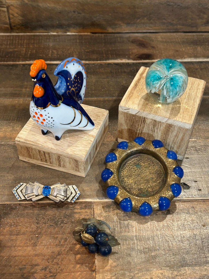 Maker: Henry Arthur “Art” Fisher, Vitro Agate Co. Markings: “PAT 2094259” and “DES 9985” on underside Dimensions: Approx. 3¼" diameter Material: Gold-tone metal with embedded blue glass marbles Notes: Rare and historically documented; designed by a non-smoker as a decorative alternative to ashtrays Design: Clear dome with internal turquoise and white floral burst Dimensions: Approx. 2.5" diameter Style: Mid-century modern; resembles underwater flora or sea anemone Notes: Comparable to handmade Murano glass; ideal as a desk accent or shelf display Origin: Soviet-era Lomonosov porcelain Design: Stylized rooster with cobalt blue head, red comb, and gold accents Dimensions: Approx. 4" tall Condition: No chips or cracks; stopper missing Notes: Highly collectible; vibrant folk-art aesthetic Design: Stylized ribbon with central blue stone and clear rhinestone accents Dimensions: Approx. 2.25" wide Era: 1950s–60s costume jewelry Notes: Elegant and versatile; suitable for wear or display Design: Glossy dark blue beads arranged as berries with textured silver-tone leaves Dimensions: Approx. 2" long Style: Naturalistic mid-century design Notes: Adds botanical charm to any collectionFisher Jewel Tray – 1936 Patent-Stamped Ashtray with Blue Marbles