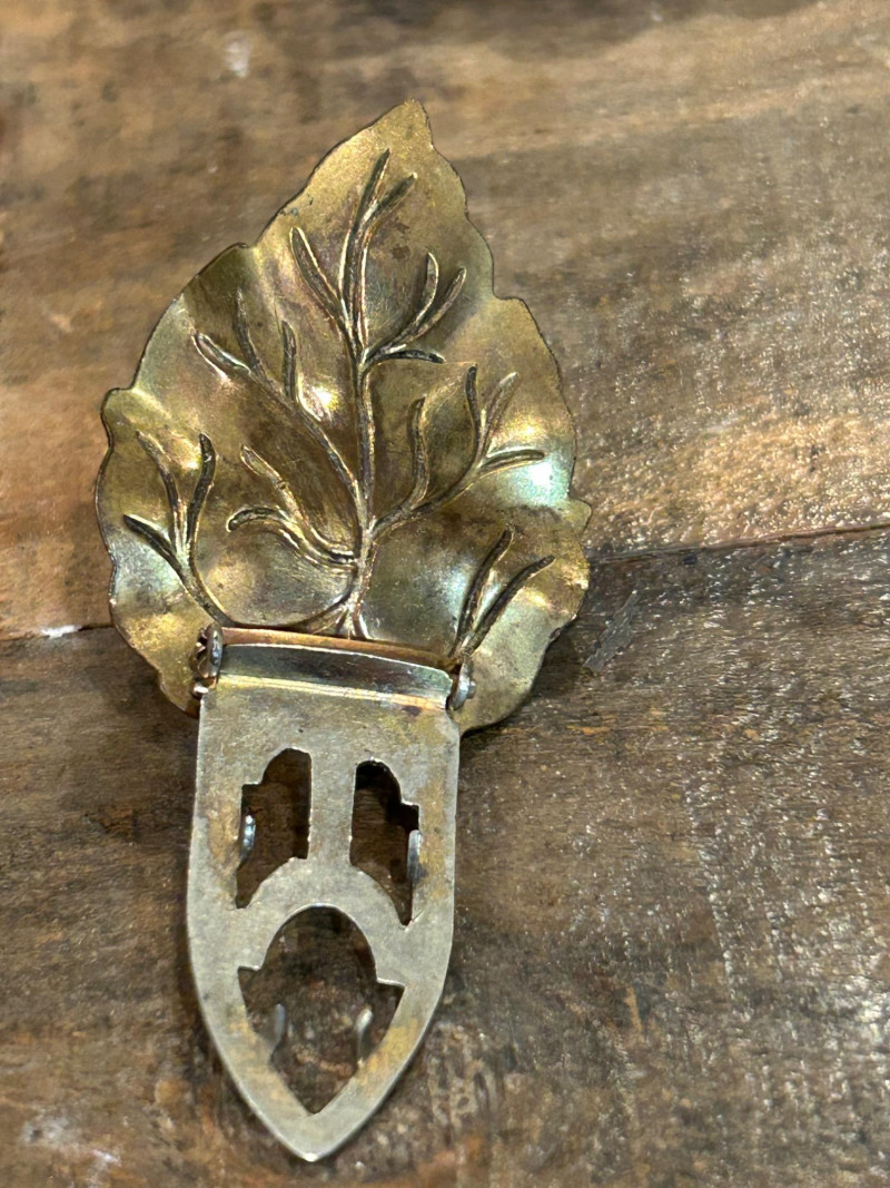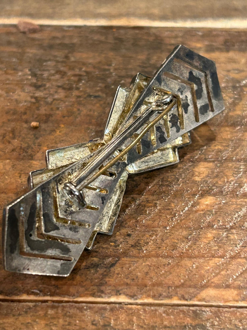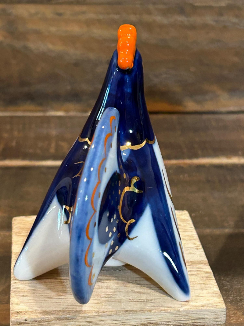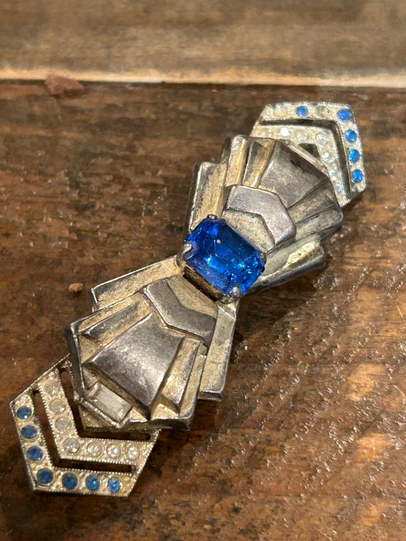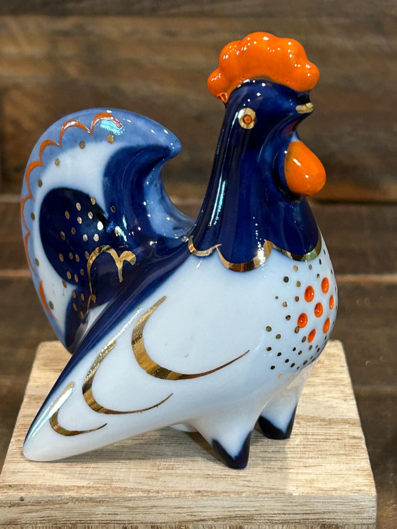 Maker: Henry Arthur “Art” Fisher, Vitro Agate Co. Markings: “PAT 2094259” and “DES 9985” on underside Dimensions: Approx. 3¼" diameter Material: Gold-tone metal with embedded blue glass marbles Notes: Rare and historically documented; designed by a non-smoker as a decorative alternative to ashtrays Design: Clear dome with internal turquoise and white floral burst Dimensions: Approx. 2.5" diameter Style: Mid-century modern; resembles underwater flora or sea anemone Notes: Comparable to handmade Murano glass; ideal as a desk accent or shelf display Origin: Soviet-era Lomonosov porcelain Design: Stylized rooster with cobalt blue head, red comb, and gold accents Dimensions: Approx. 4" tall Condition: No chips or cracks; stopper missing Notes: Highly collectible; vibrant folk-art aesthetic Design: Stylized ribbon with central blue stone and clear rhinestone accents Dimensions: Approx. 2.25" wide Era: 1950s–60s costume jewelry Notes: Elegant and versatile; suitable for wear or display Design: Glossy dark blue beads arranged as berries with textured silver-tone leaves Dimensions: Approx. 2" long Style: Naturalistic mid-century design Notes: Adds botanical charm to any collectionFisher Jewel Tray – 1936 Patent-Stamped Ashtray with Blue Marbles
