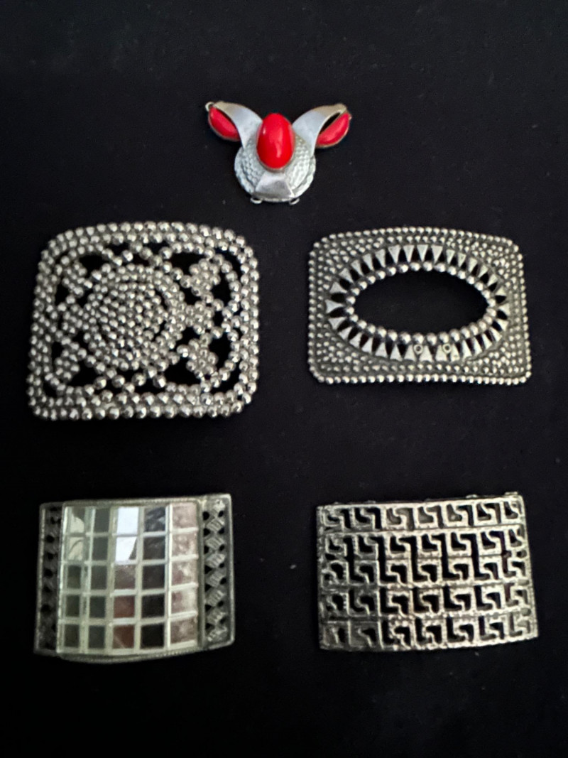 A versatile collection of five vintage shoe buckles and ornamental clips, each showcasing distinct mid-century metalwork styles. This mixed lot includes floral steel beading, geometric motifs, and sculptural forms—ideal for jewelry making, costume design, or repurposed fashion. Lot Highlights: Steel Beaded Buckle – Floral Mandala Design