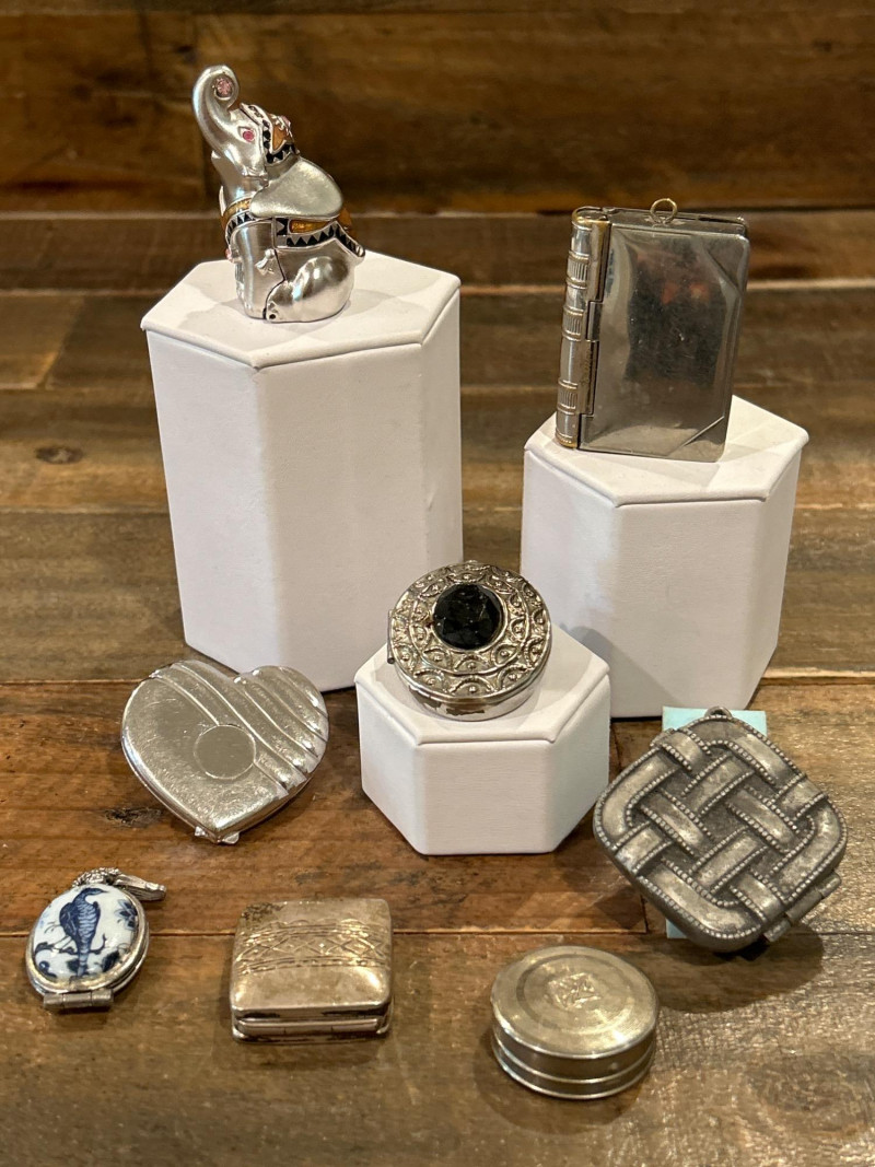 Lot # 112 - Collection of Eight Vintage Compacts, Perfume Lockets & Trinket Boxes