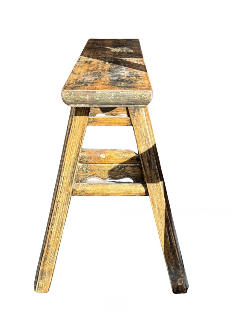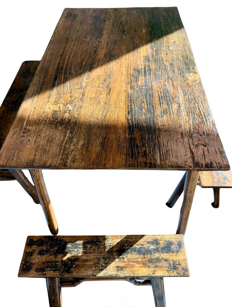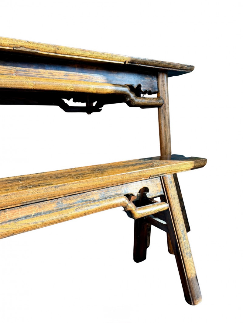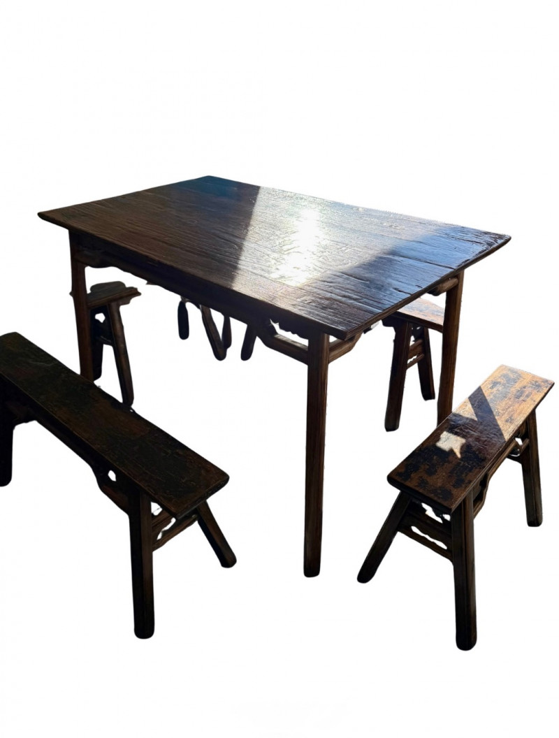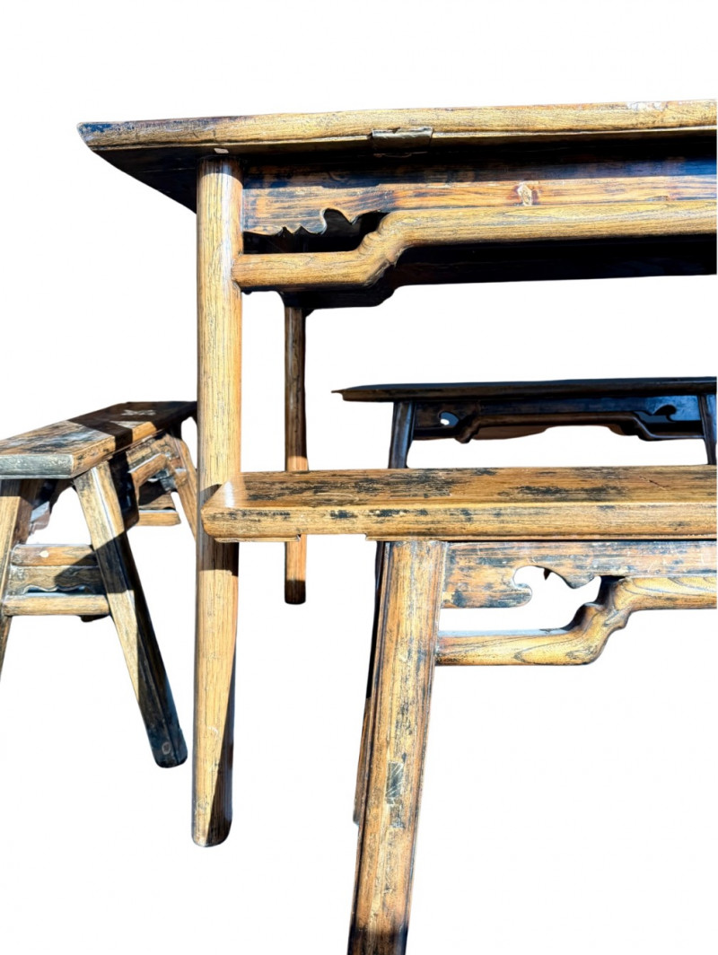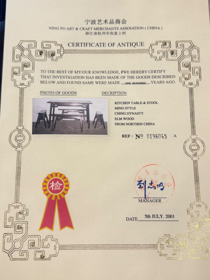 Approximate Dimensions: Table: 60" L × 32" W × 30" H Benches (each): 44" L × 10" W × 18" H Exquisite antique Chinese kitchen table with matching stools, crafted in elm wood in the Ming-style tradition. This set comes with an official Certificate of Antique issued by the Ning Po Art & Craft Merchants Association (China), dated July 5, 2001, which attributes the pieces to the Ch’ing (Qing) Dynasty period and estimates them to be approximately one hundred years old at the time of certification. The craftsmanship features classic Ming-style joinery, straight tapered legs, and understated geometric stretchers, reflecting the elegant restraint characteristic of Chinese design from the late imperial era. The elmwood displays a rich natural patina, testifying to both age and authenticity. Details: Origin: Northern China Wood: Solid Elm Style: Ming-style, attributed to the Ch’ing Dynasty Includes: One table and 4 matching stools/benches Certification: Official Certificate of Antique (issued 2001, Ref. No. 0196045) Condition: Excellent antique condition with age-appropriate wear and patina Historical Note: