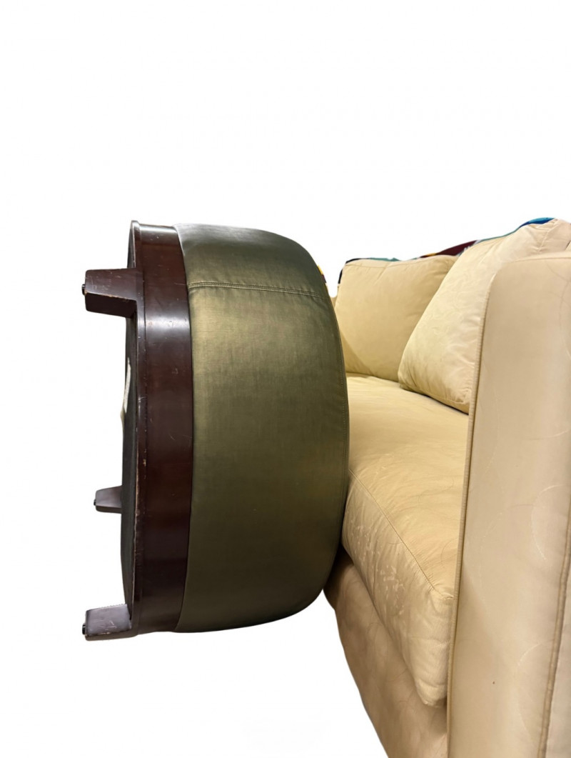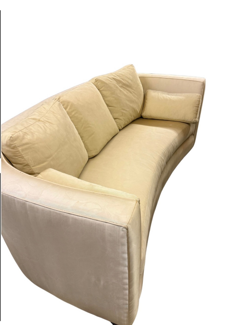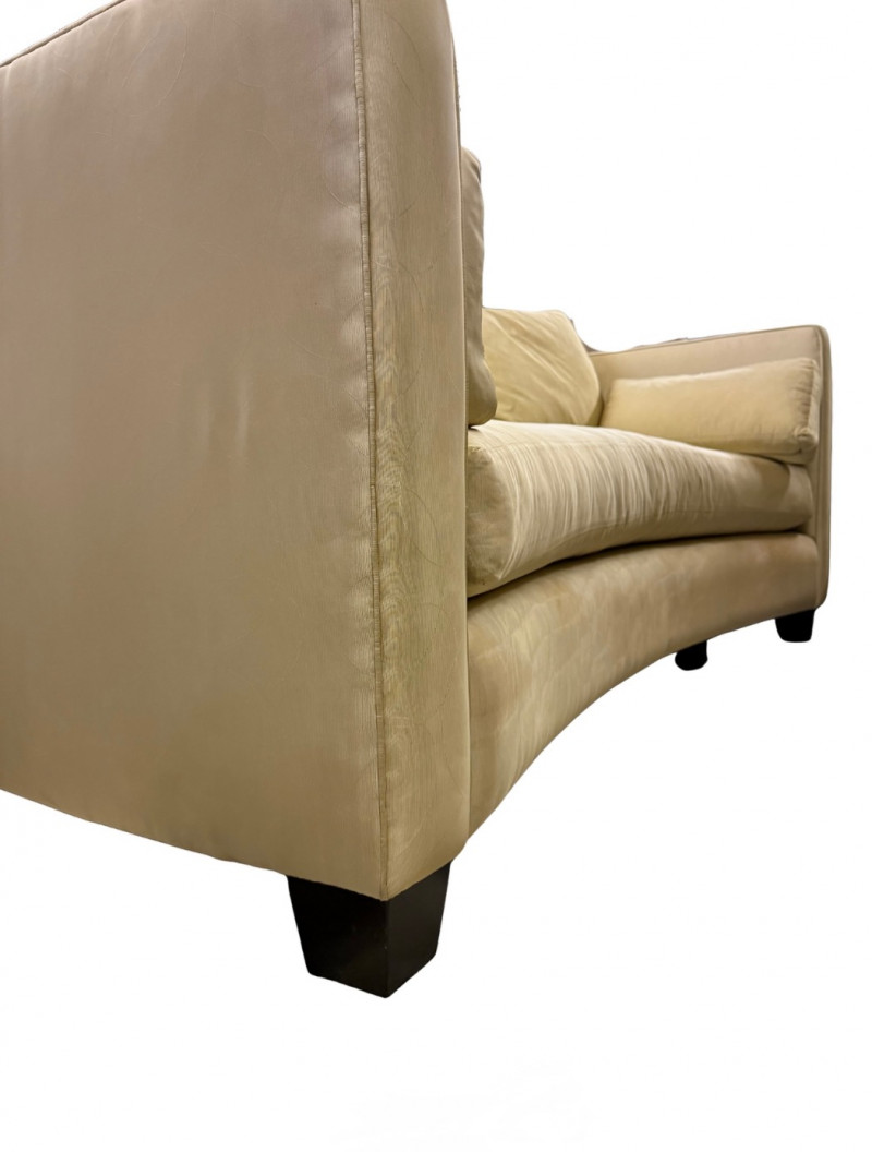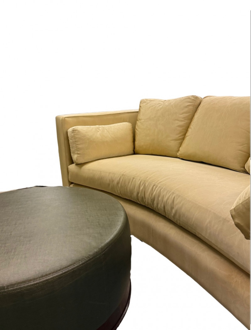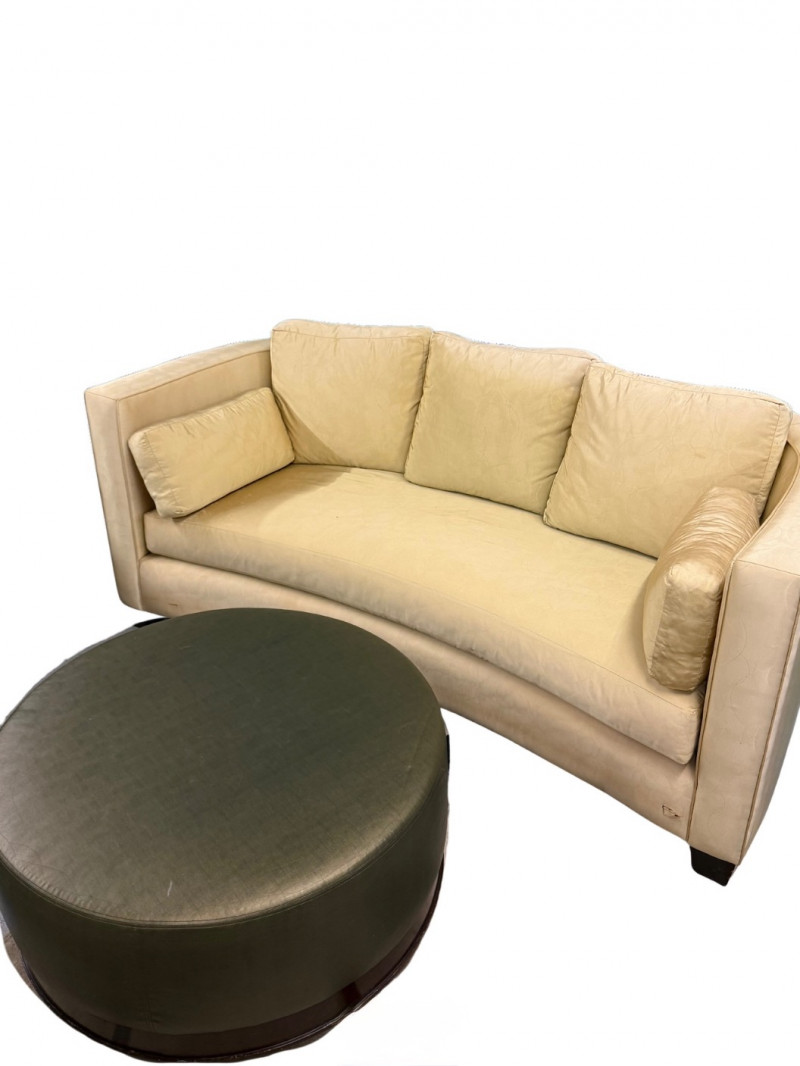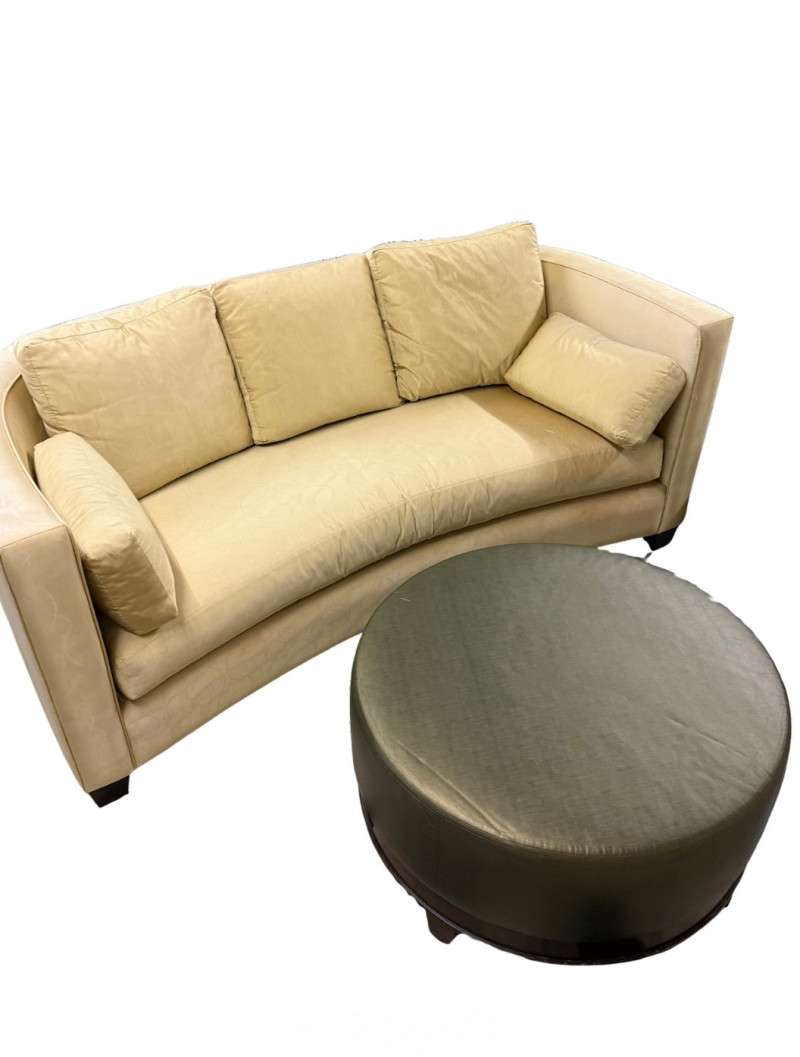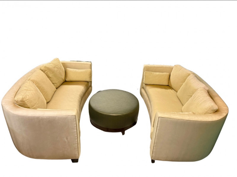 Elegant pair of curved tuxedo-style sofas with a matching round ottoman by Councill Furniture, known for their exceptional craftsmanship and timeless design. Upholstered in buttery cream fabric with matching bolster and back cushions, each sofa showcases a sculptural curved silhouette and dark wood block feet for a refined and balanced look. The round ottoman features a soft sage-green upholstery with a contrasting wood base, complementing the set while adding functional versatility. Dimensions: Condition: Excellent overall condition with light, age-appropriate wear to fabric. Design Note: Estimated Value: $3,500–$5,500Pair of Curved Cream Sofas with Matching Round Ottoman — Councill Furniture