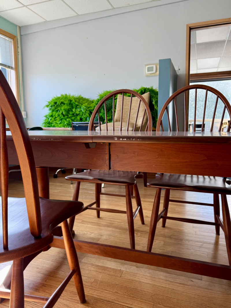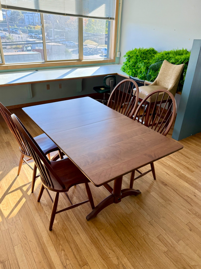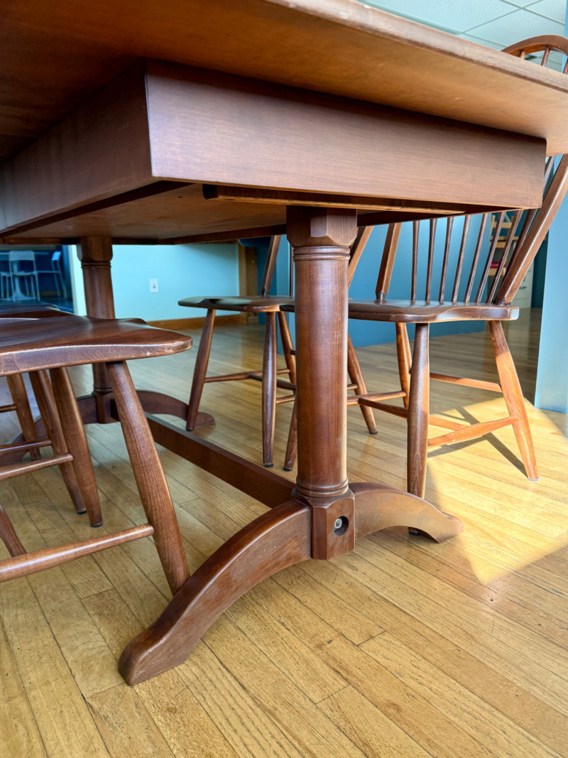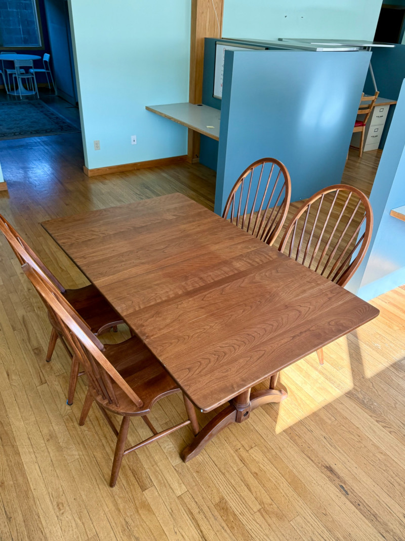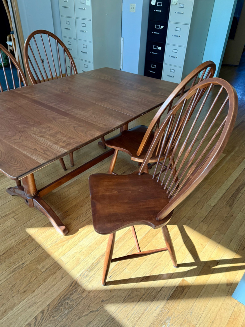 Vintage Solid Wood Dining Table with 4 Windsor Chairs Type: Solid wood dining table with 4 matching Windsor chairs Comparable vintage oak dining sets of this style have sold between $600–$1,200 depending on maker and finish.