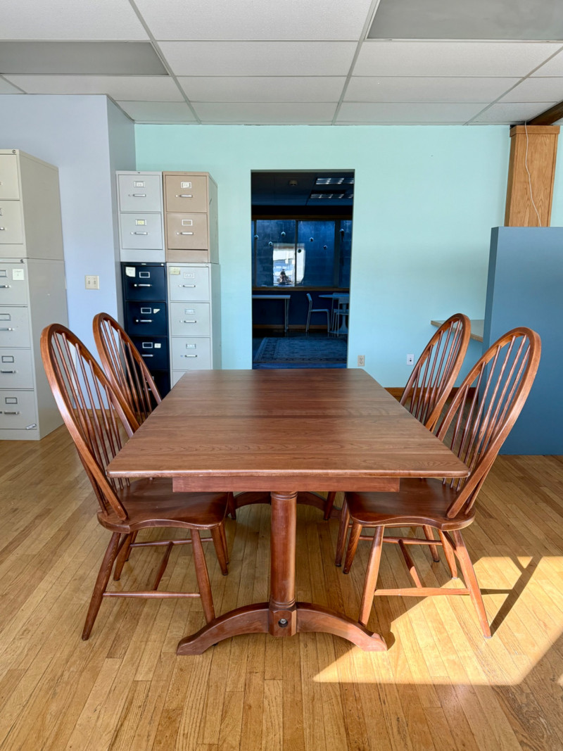 Classic vintage dining set featuring a solid wood rectangular table with a center extension leaf and four Windsor-style spindle back chairs. The warm honey oak finish and timeless craftsmanship evoke early Americana design, offering durability and charm ideal for farmhouse, traditional, or rustic-inspired interiors.