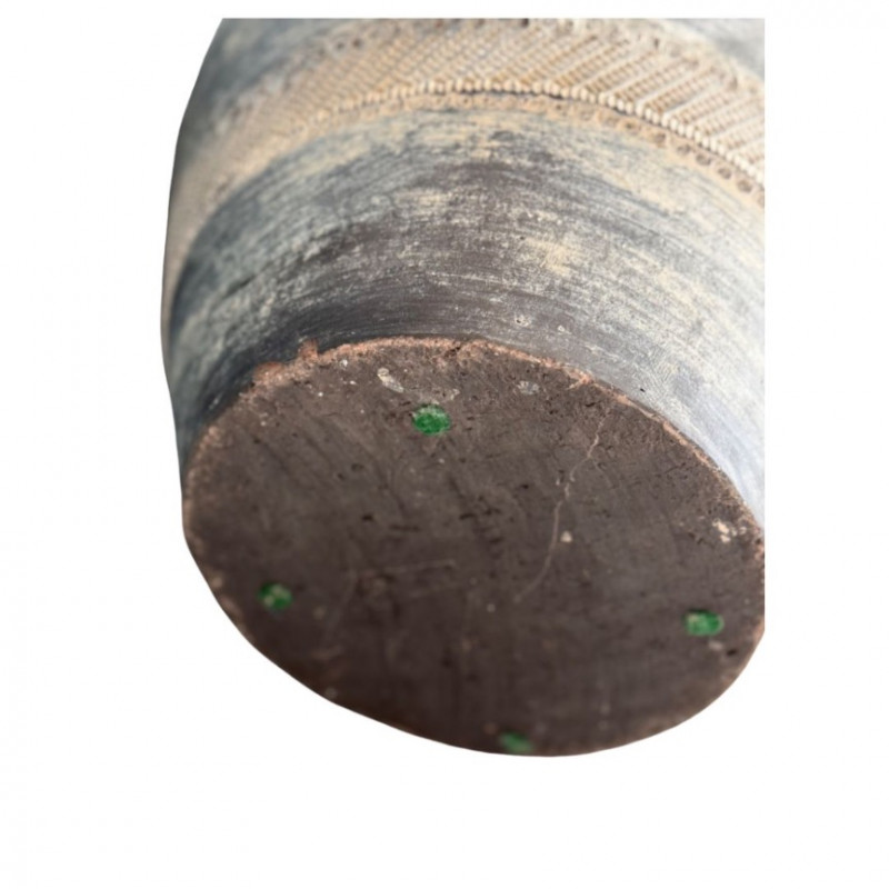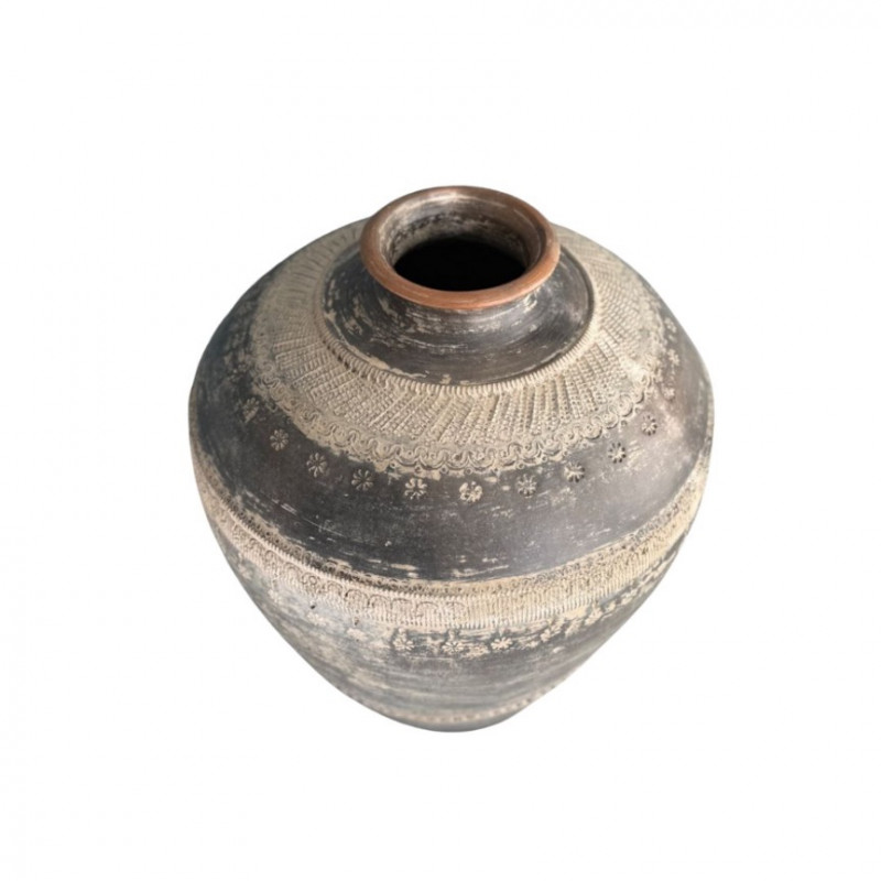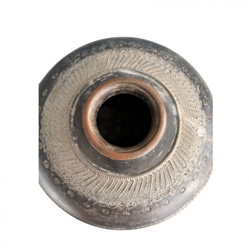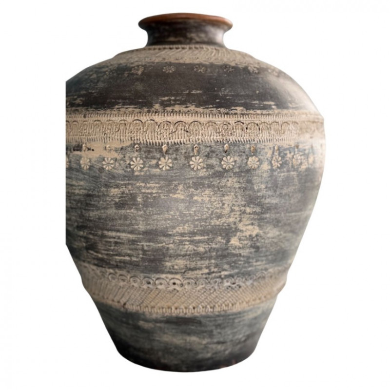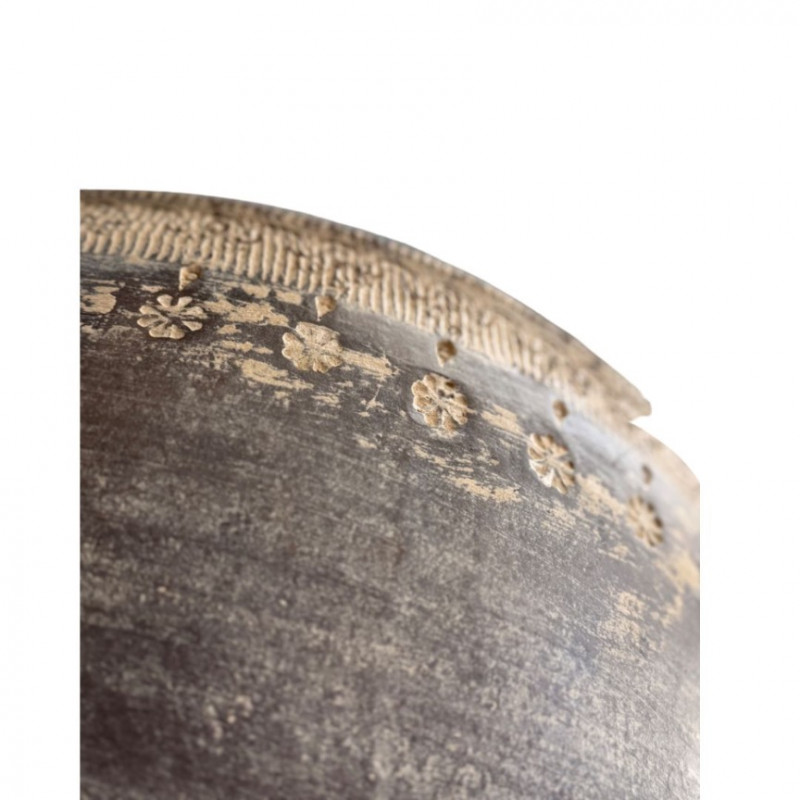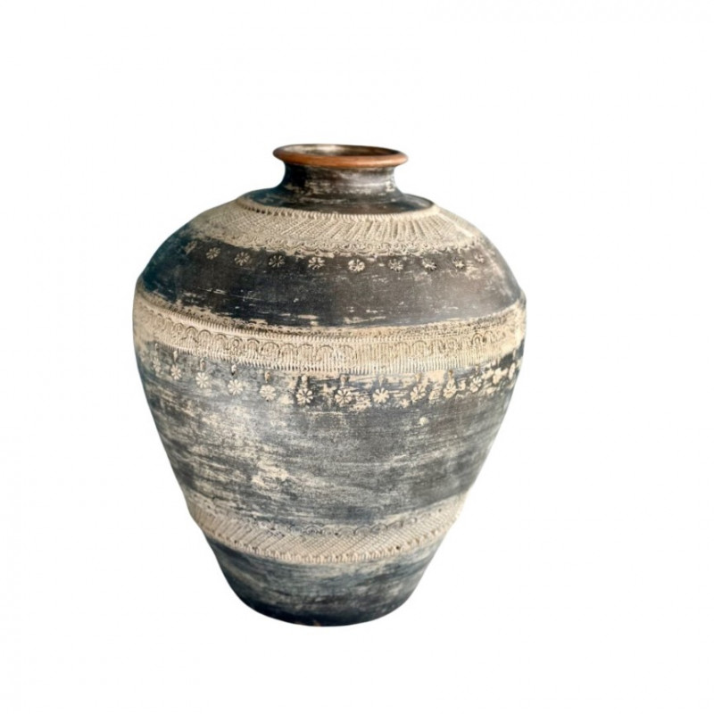 Striking vintage earthenware vessel featuring intricate embossed floral and lace-like motifs around the body. The matte charcoal glaze with natural distressing gives it an aged, timeworn character, while the wide rounded form and narrow neck evoke traditional global pottery craftsmanship. A beautiful decorative accent for bohemian, wabi-sabi, or eclectic interiors.