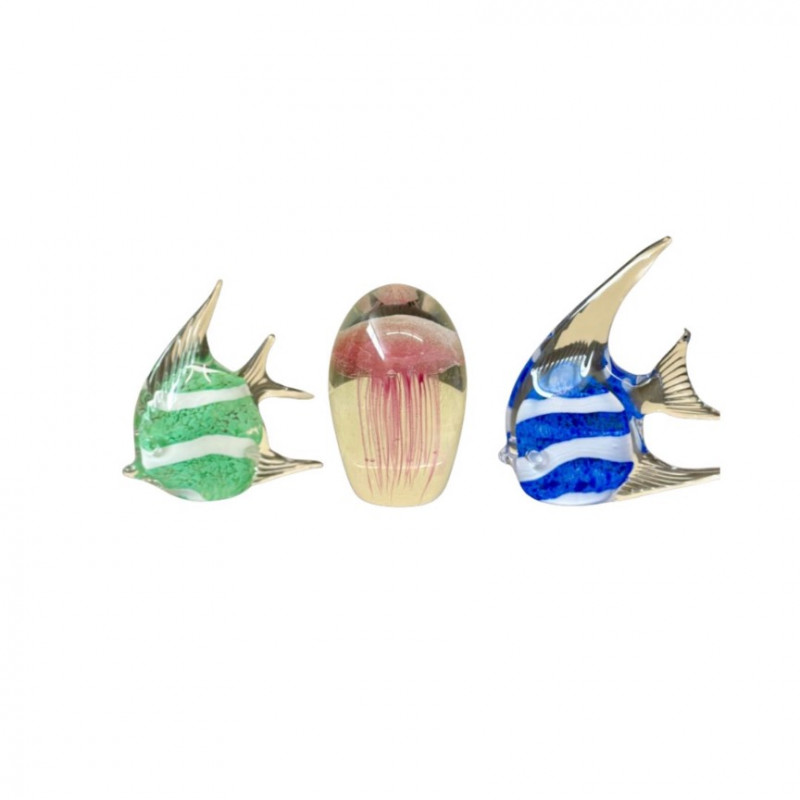 Art Glass Trio — Jellyfish Paperweight & Pair of Fish Sculptures Striking art glass collection featuring a mesmerizing pink jellyfish paperweight paired with two vibrant glass fish sculptures in oceanic hues of emerald green and cobalt blue. Each piece showcases remarkable craftsmanship, with fluid lines, clear glass fins, and encased color detail that beautifully captures light from every angle. Perfect for display on a shelf or desk, this trio embodies mid-century coastal charm and fine artisan technique. Includes: Three pieces — jellyfish paperweight, green fish, blue fish Material: Hand-blown glass Condition: Excellent vintage condition with no visible chips or cracks Measurements: Jellyfish approx. 4.5” H; fish approx. 5.5” W each