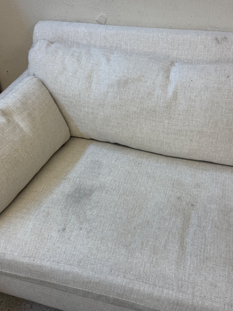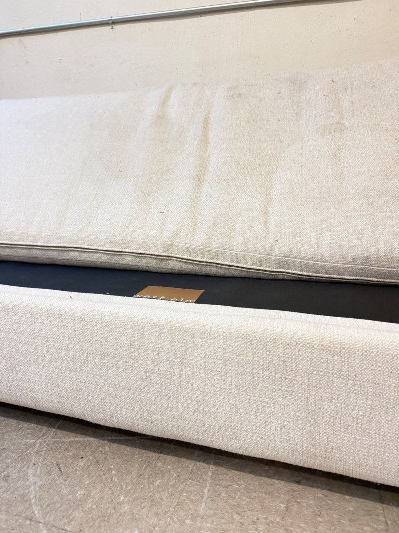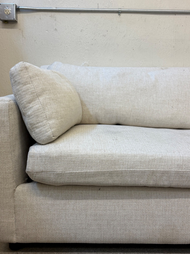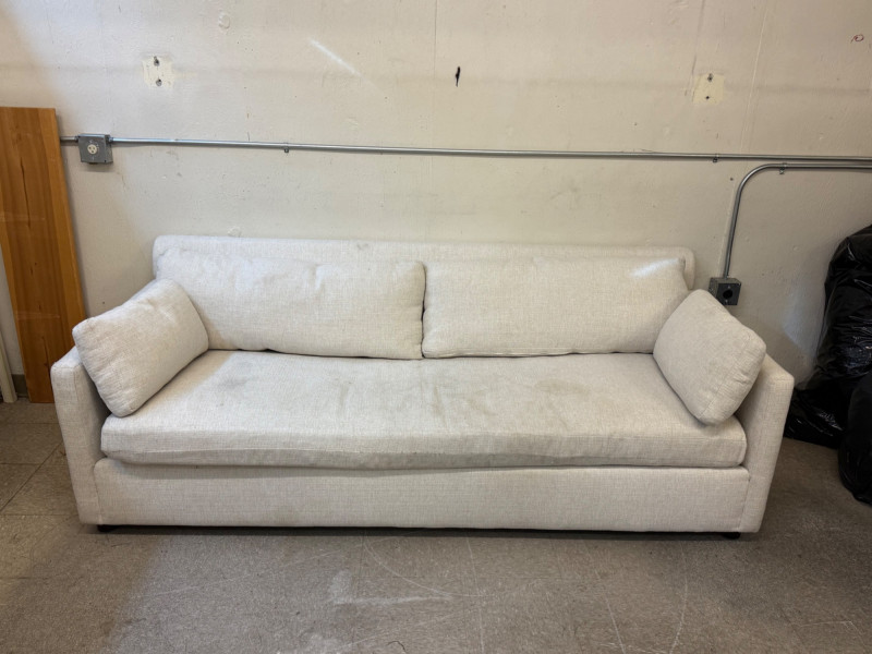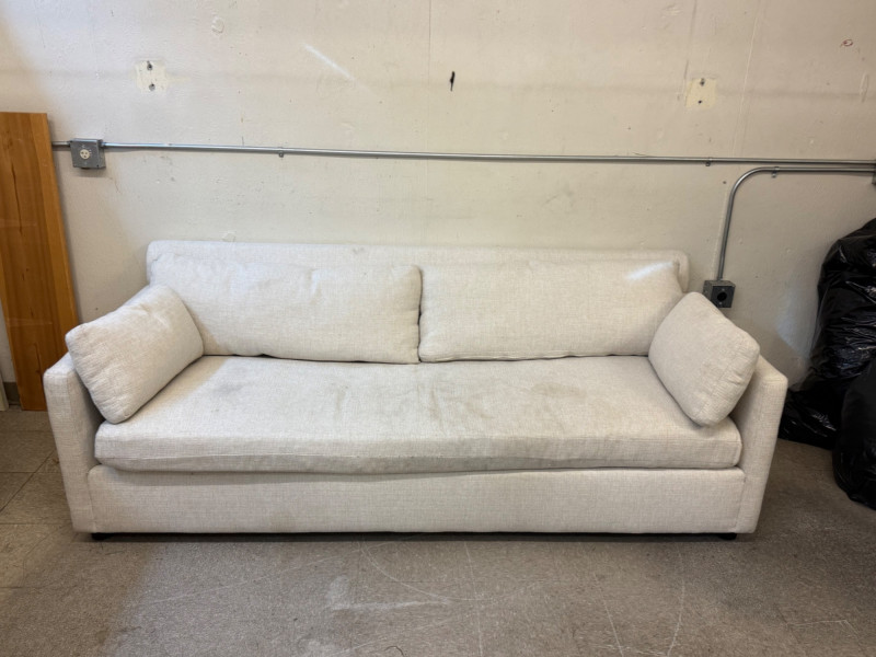 Modern, streamlined design by West Elm, this Andes-style sofa features a soft neutral woven upholstery, low profile, and plush back cushions. Sleek and versatile, it brings effortless sophistication to any modern or transitional space. Sofa shows light wear and a few surface stains that will benefit from a professional cleaning. Cushions remain structurally sound, and the frame is sturdy. Measurements: Brand: Condition: Estimated Value: