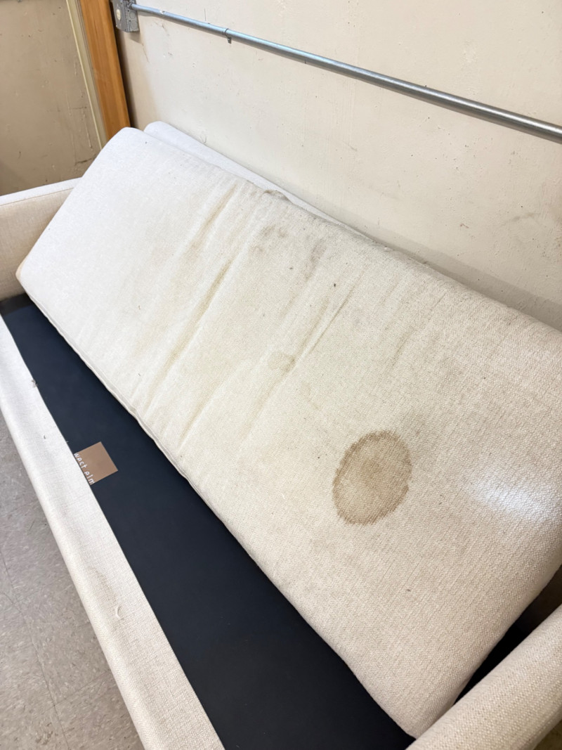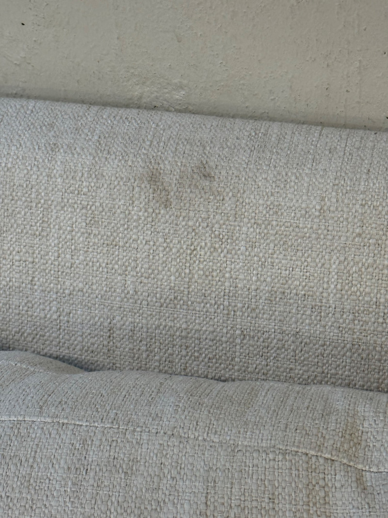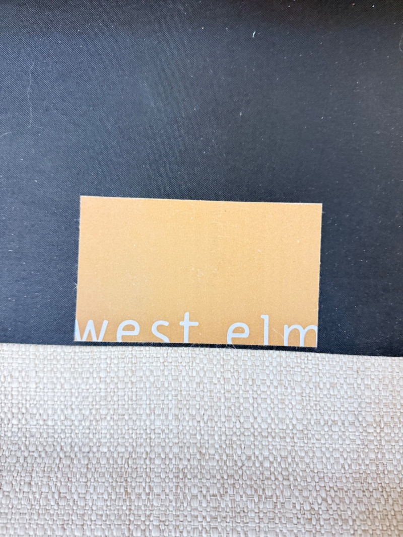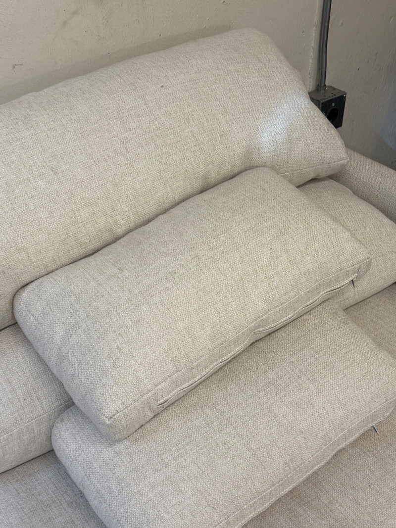 Modern, streamlined design by West Elm, this Andes-style sofa features a soft neutral woven upholstery, low profile, and plush back cushions. Sleek and versatile, it brings effortless sophistication to any modern or transitional space. Sofa shows light wear and a few surface stains that will benefit from a professional cleaning. Cushions remain structurally sound, and the frame is sturdy. Measurements: Brand: Condition: Estimated Value: