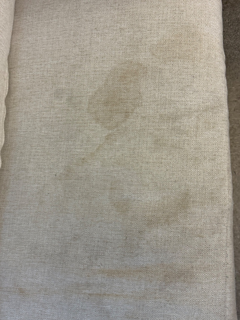 Good, with visible fabric discoloration and minor wear consistent with age and use. Needs a good cleaning but in good condition otherwise.