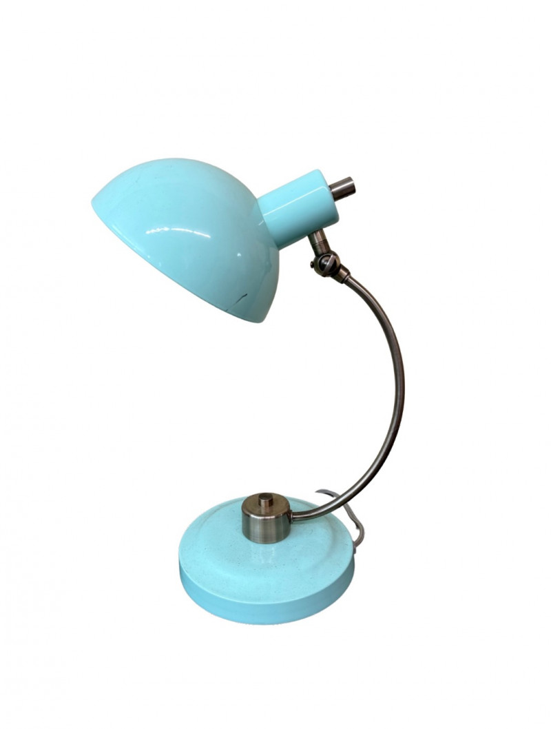 Charming mid-century modern desk lamp featuring a curved gooseneck design and sleek powder blue enamel finish. The lamp’s domed shade and minimalist silhouette reflect classic 1950s–60s industrial styling, blending functionality with a soft retro color palette.