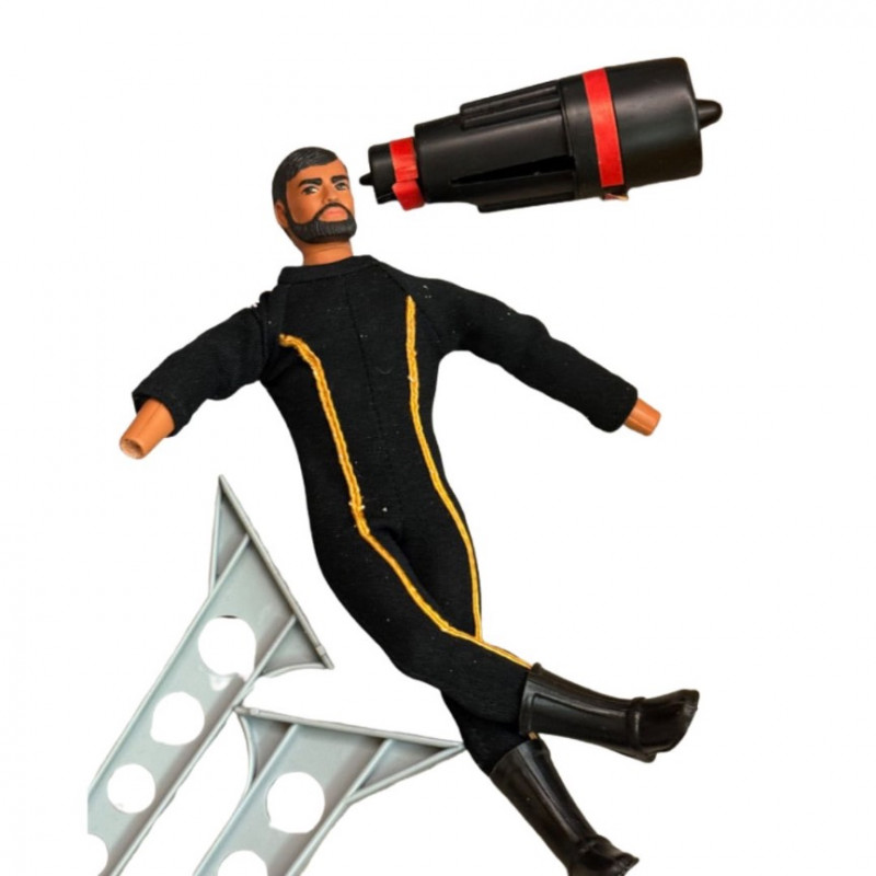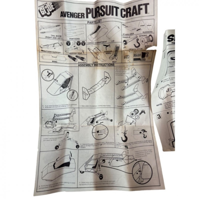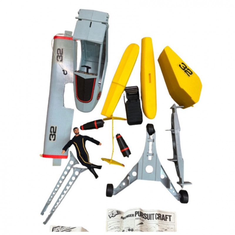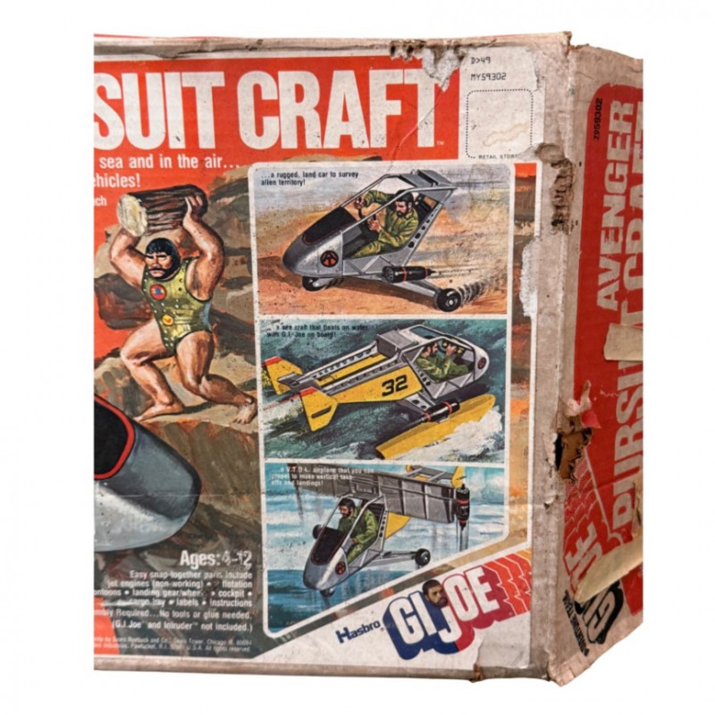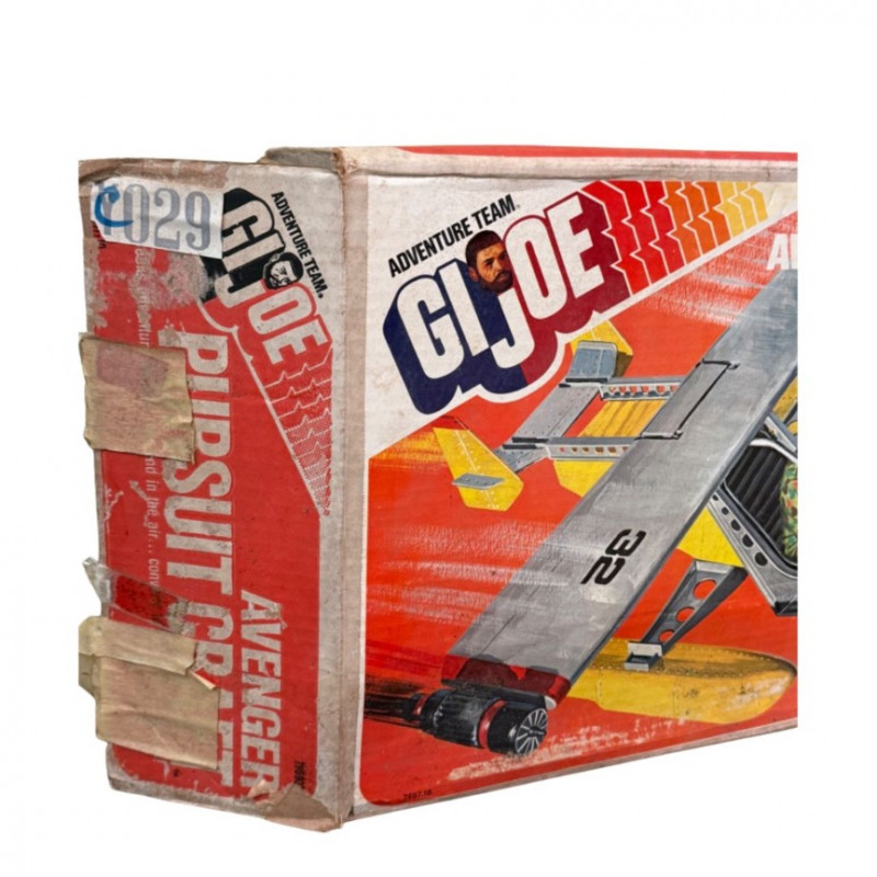 1972 Hasbro G.I. Joe Adventure Team “Avenger Pursuit Craft” with Original Box and Figure Includes main body, wings, pontoons, propeller units, and accessories shown. The original G.I. Joe pilot features the signature flocked beard and black jumpsuit with gold piping. The colorful box displays the classic Adventure Team artwork, showcasing the 1970s action-hero aesthetic. Maker: Hasbro