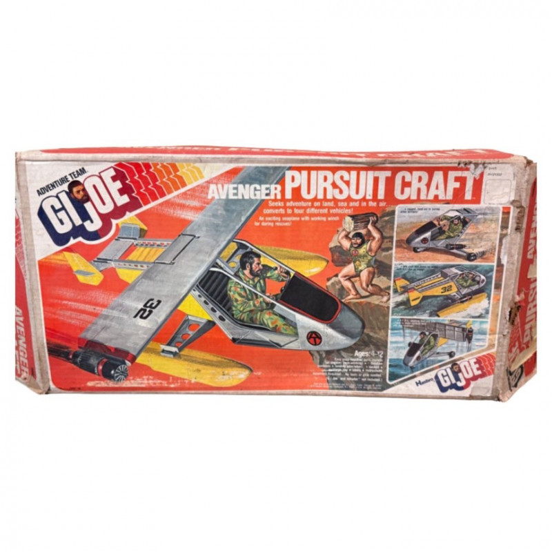 Rare vintage G.I. Joe Adventure Team “Avenger Pursuit Craft” by Hasbro, circa 1972, complete with original box, manual, and pilot figure. This modular vehicle was one of the Adventure Team’s most dynamic releases—converting into four modes of travel: seaplane, jet car, hovercraft, and rescue craft.