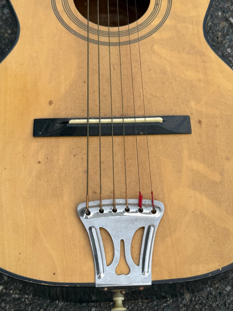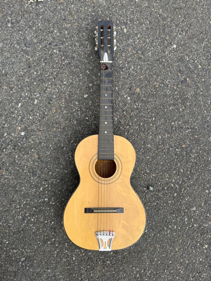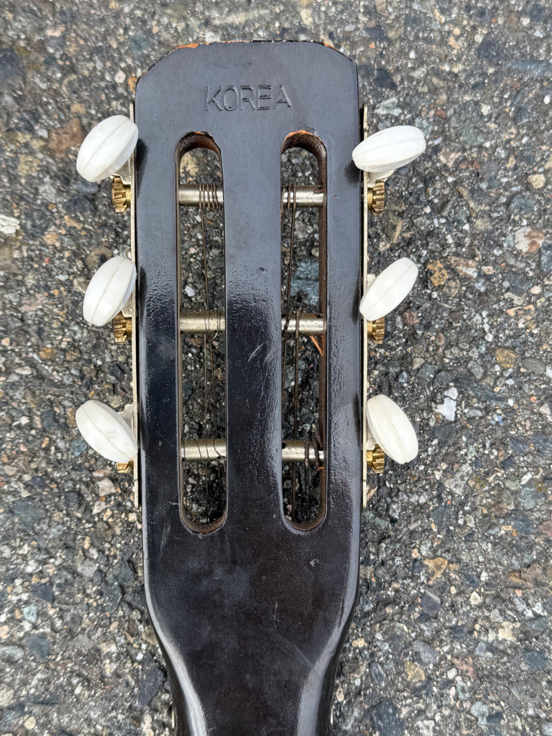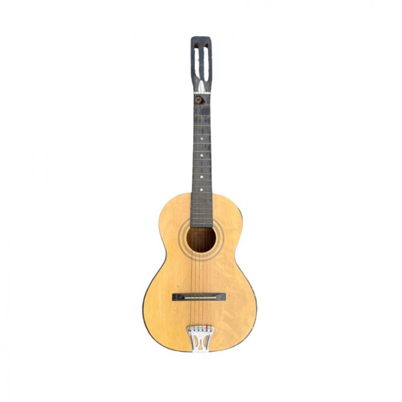 Vintage parlor-size acoustic guitar made in Korea, featuring a natural wood finish, slotted headstock, and chrome trapeze tailpiece. Compact and lightweight, this folk-style guitar delivers classic mid-century appeal with vintage tonal character.