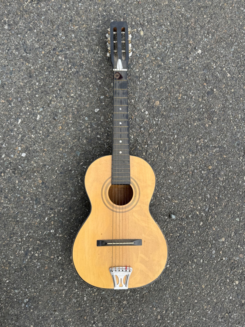 Description: Made during the 1970s–1980s era, when Korean guitar production was gaining international recognition for quality craftsmanship, this piece makes a great addition to any collection or as a rustic decorative accent. Measurements: Condition:Vintage Korean Parlor Acoustic Guitar — Natural Wood Finish, 1970s–1980s Era