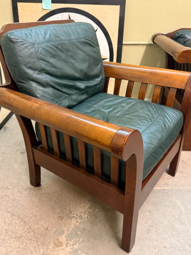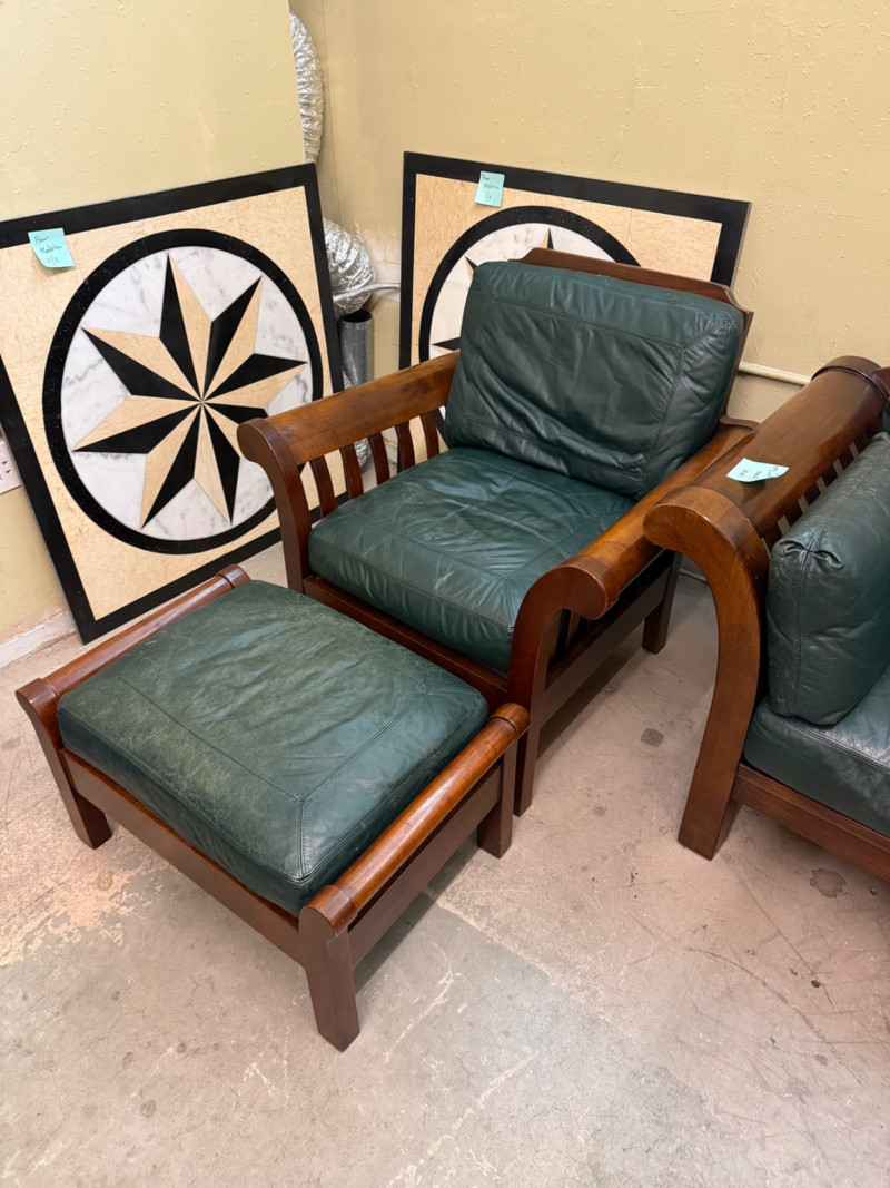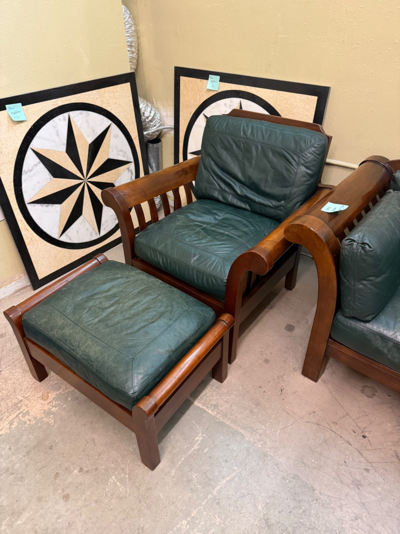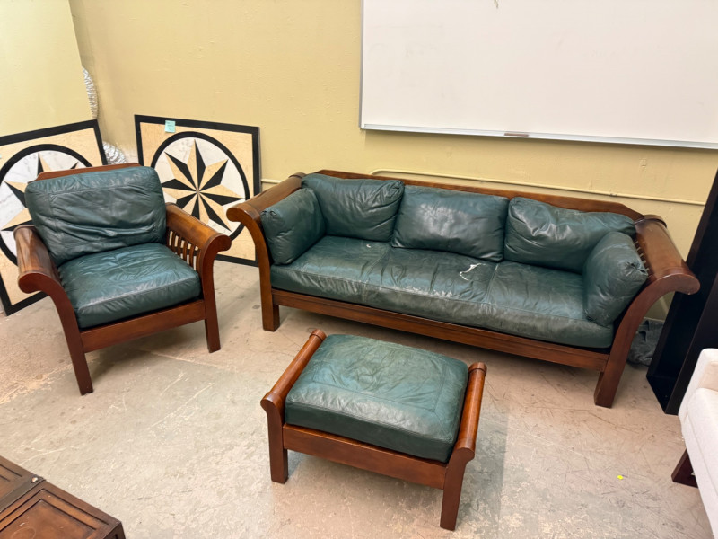 This collection blends organic Scandinavian-inspired design with the comfort of supple leather seating. A statement trio that adds sophistication to any living space, office, or studio. Details: Solid teak wood construction Original dark green leather upholstery Includes 3 pieces: sofa, chair, and ottoman Comfortable and structurally sound Condition: Measurements (approx.): Sofa: 80” W × 32” D × 30” H Chair: 33” W × 32” D × 30” H Ottoman: 26” W × 22” D × 17” H Retail Value:Vintage Mid-Century Teak & Leather Living Room Set — Sofa, Lounge Chair, and Ottoman