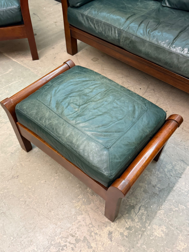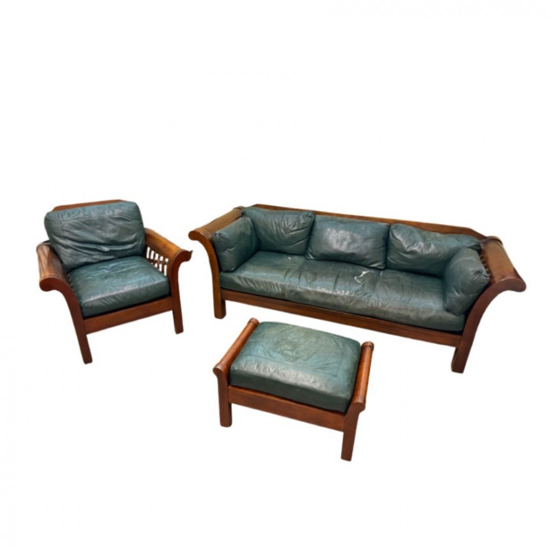 Beautiful vintage mid-century modern living room set featuring solid teak wood frames with rich warm tones and original deep green leather upholstery. The set includes a three-seat sofa, matching lounge chair, and ottoman, each showcasing elegant curved armrests and timeless craftsmanship.
