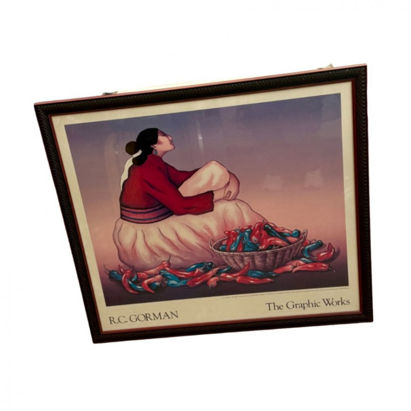 Vibrant framed exhibition poster featuring the work of renowned Navajo artist R.C. Gorman, titled “The Graphic Works.” This piece showcases Gorman’s signature style — elegant, contemplative female figures wrapped in traditional dress, surrounded by earthy tones and organic forms. The imagery reflects the artist’s deep connection to Native culture and the Southwest landscape.