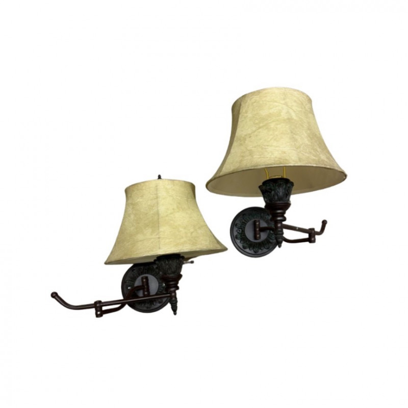 Elegant pair of vintage bronze wall sconces featuring detailed acanthus leaf accents, gently flared fabric shades, and swing-arm extensions. Each sconce offers warm, ambient light with classic traditional charm — perfect for bedroom, hallway, or living room settings. The soft parchment-style shades complement the dark bronze finish beautifully, creating a timeless and refined look. Condition: Measurements: Retail Value: