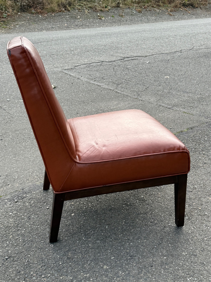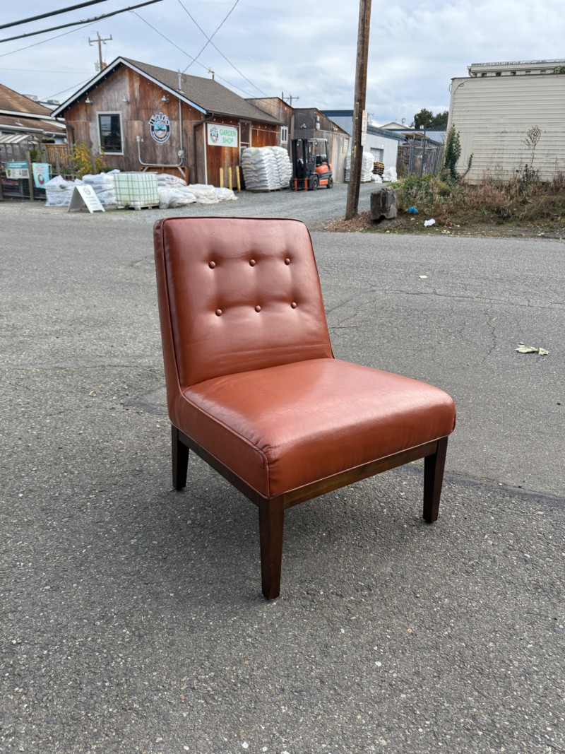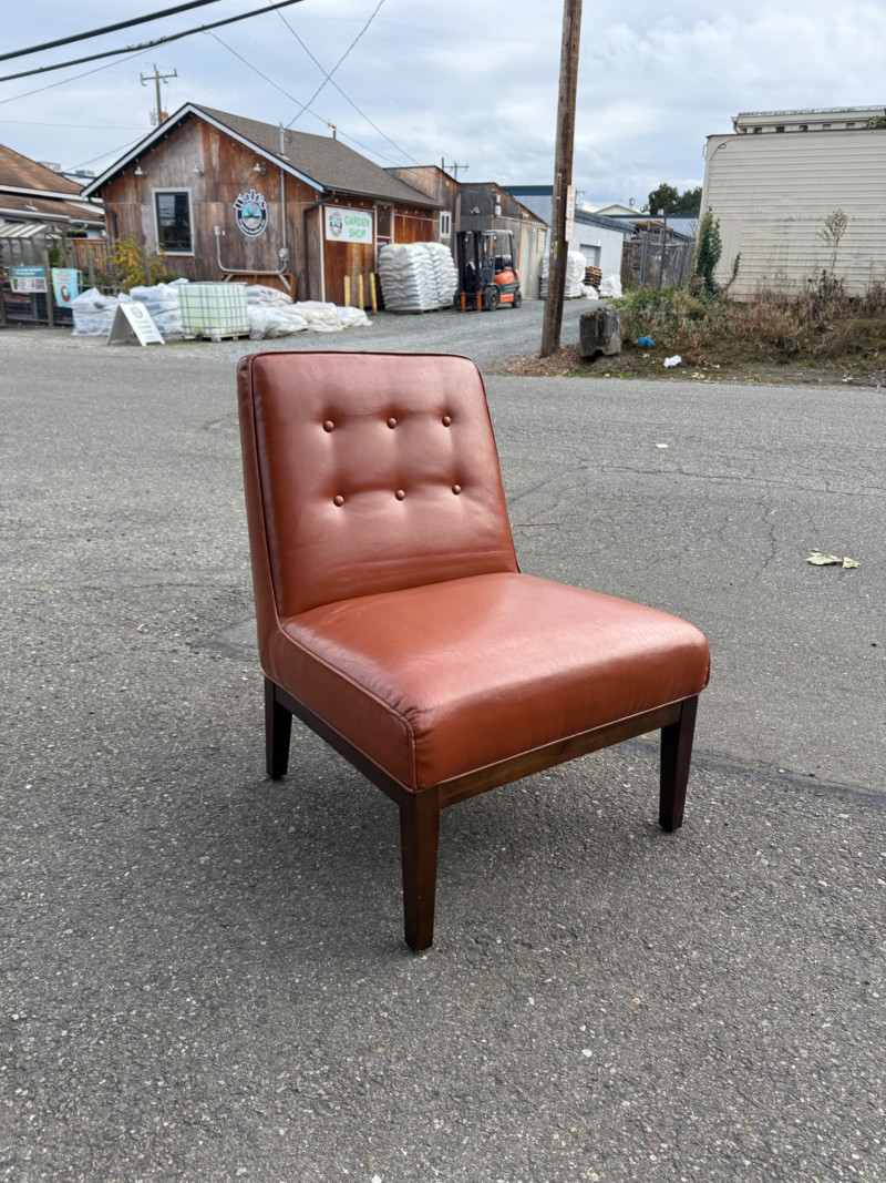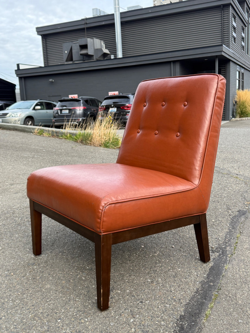 Handsome mid-century inspired leather slipper chair featuring rich burnt cognac brown upholstery with button-tufted backrest and dark wood legs. The clean, low-profile silhouette makes it ideal for a reading nook, office, or lounge space. Crafted with quality faux leather for easy maintenance and timeless appeal. Its minimalist frame pairs beautifully with both vintage and modern interiors. Measurements: Condition:
