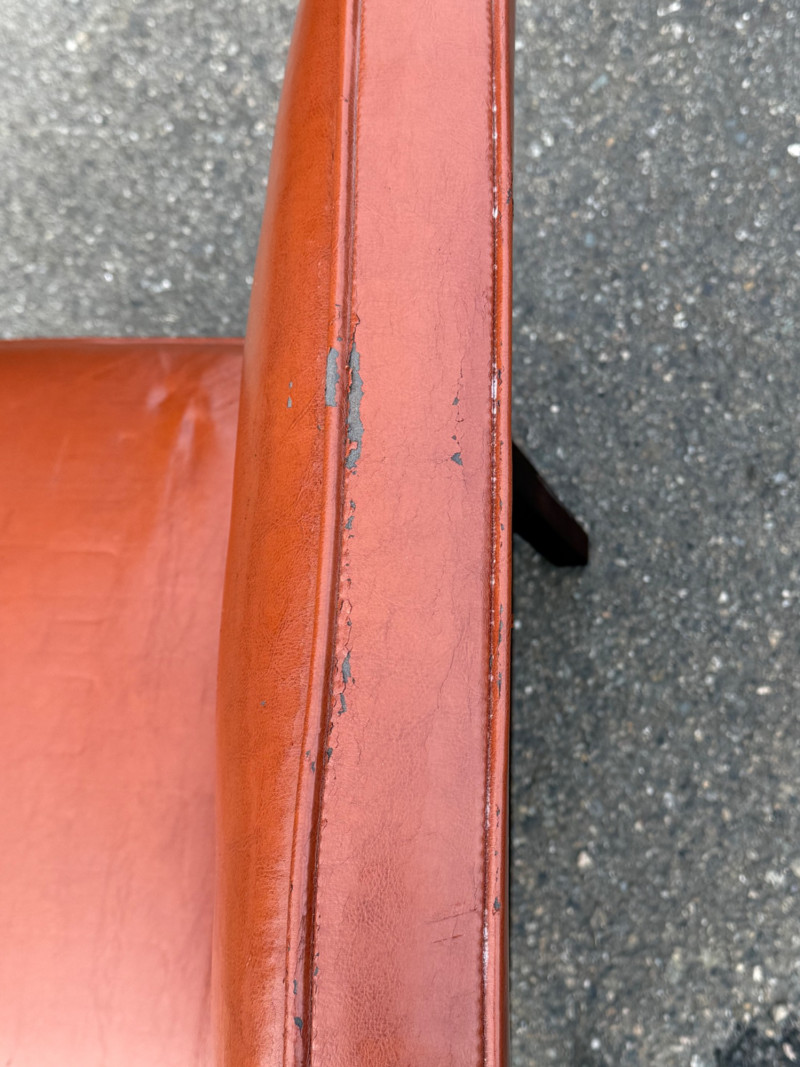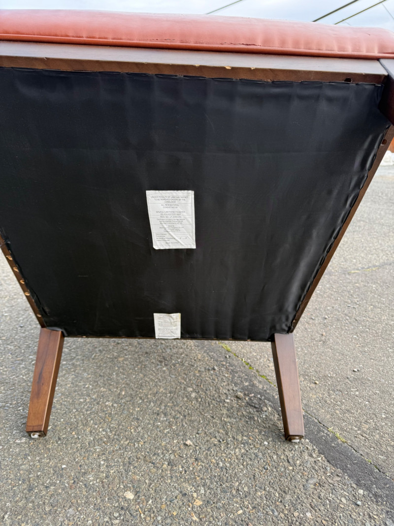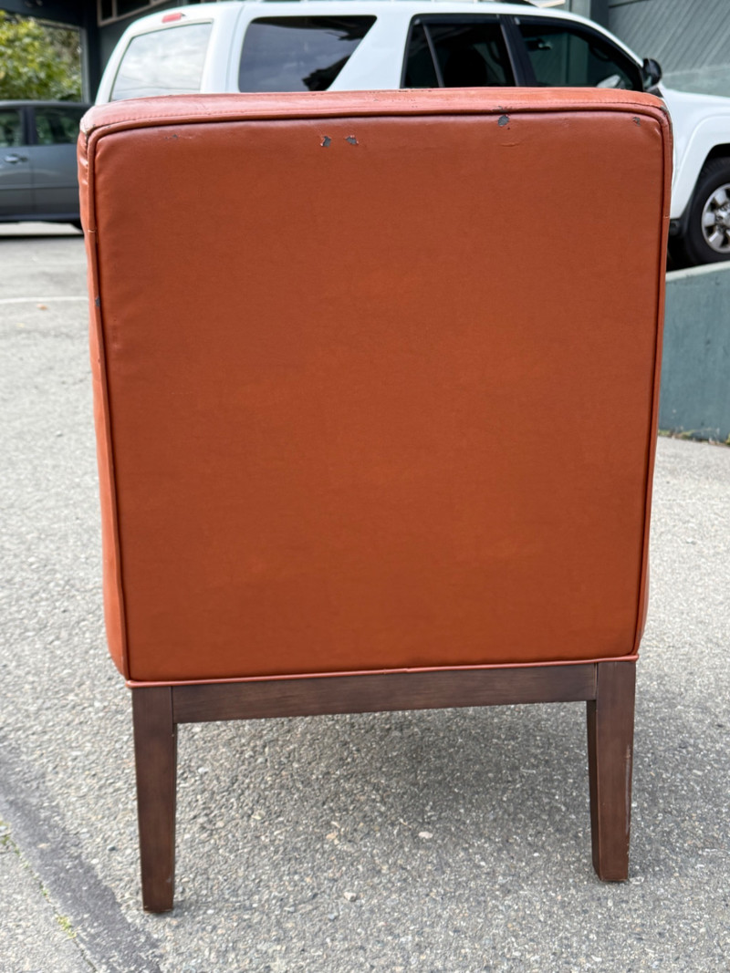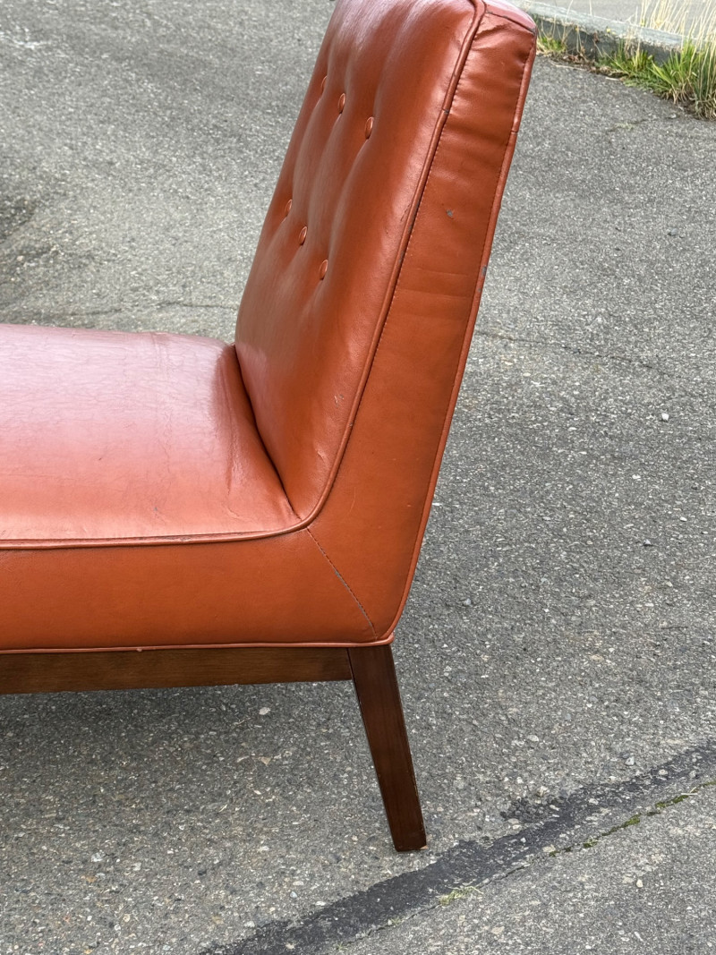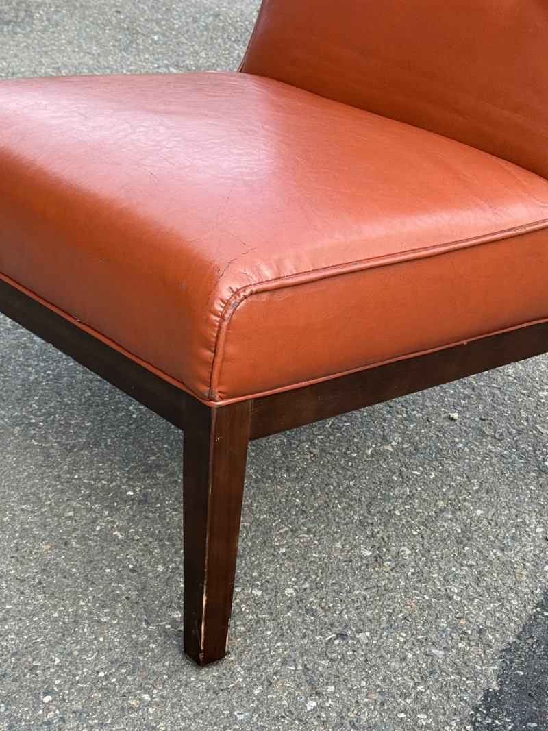 Handsome mid-century inspired leather slipper chair featuring rich burnt cognac brown upholstery with button-tufted backrest and dark wood legs. The clean, low-profile silhouette makes it ideal for a reading nook, office, or lounge space. Crafted with quality faux leather for easy maintenance and timeless appeal. Its minimalist frame pairs beautifully with both vintage and modern interiors. Measurements: Condition: