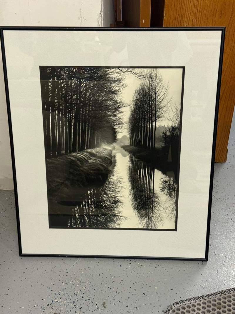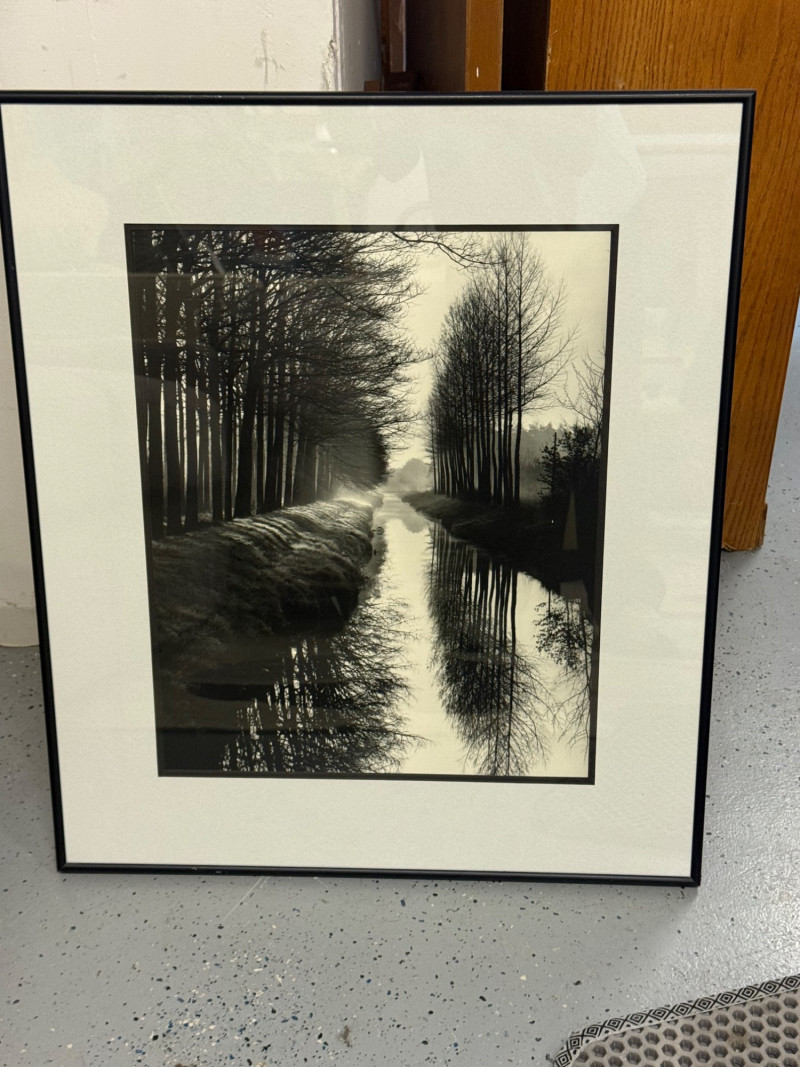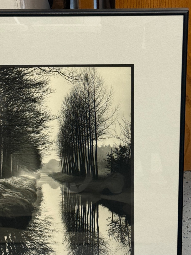 Description: Printed on high-quality photographic paper and professionally framed with a neutral mat and black gallery frame. A timeless addition for collectors of fine art photography or modernist design. Condition: Measurements: Retail Value:Brett Weston “Trees and Canal, Holland” — Framed Black and White Photograph