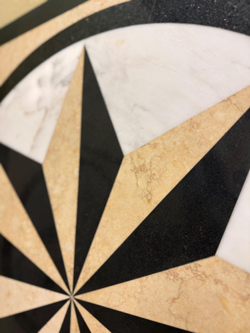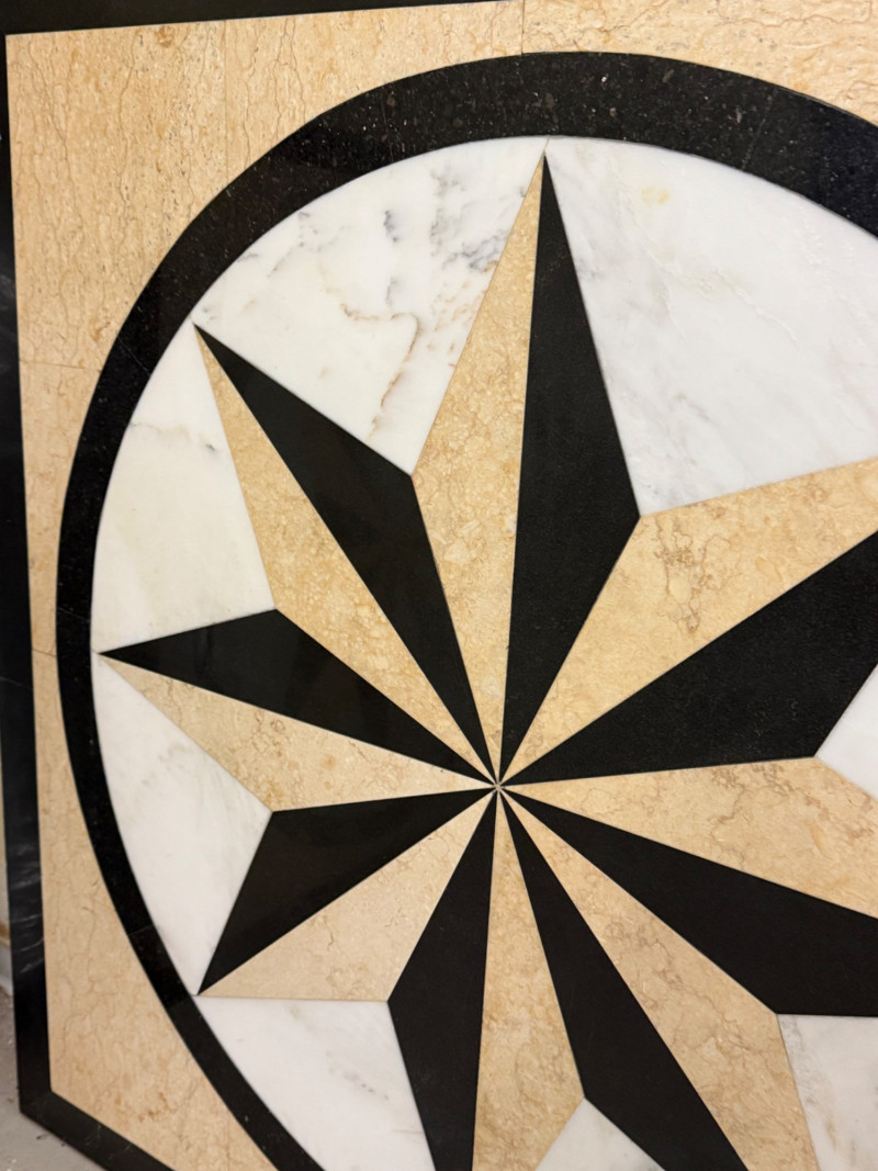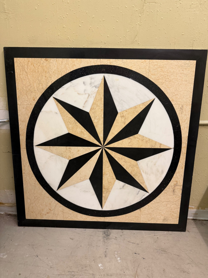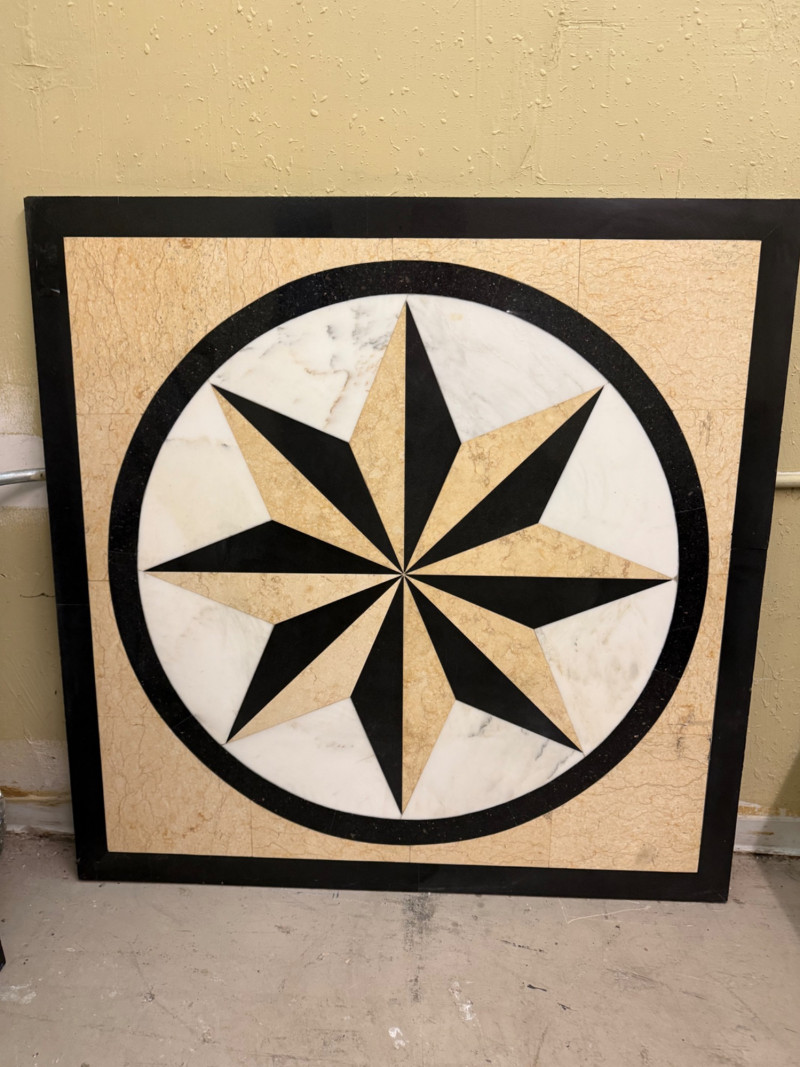 Striking marble compass rose inlay panel featuring a geometric eight-point star crafted from natural black, cream, and white marble. The intricate stonework showcases expert craftsmanship and timeless elegance. Perfect as a floor medallion, wall art, or tabletop inset, this piece adds architectural sophistication and classical design to any interior. Heavy and finely made, with polished surface and bold contrast detailing. Measurements: Condition: Retail Value: