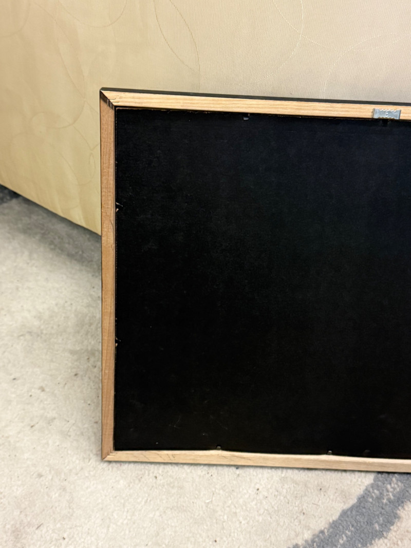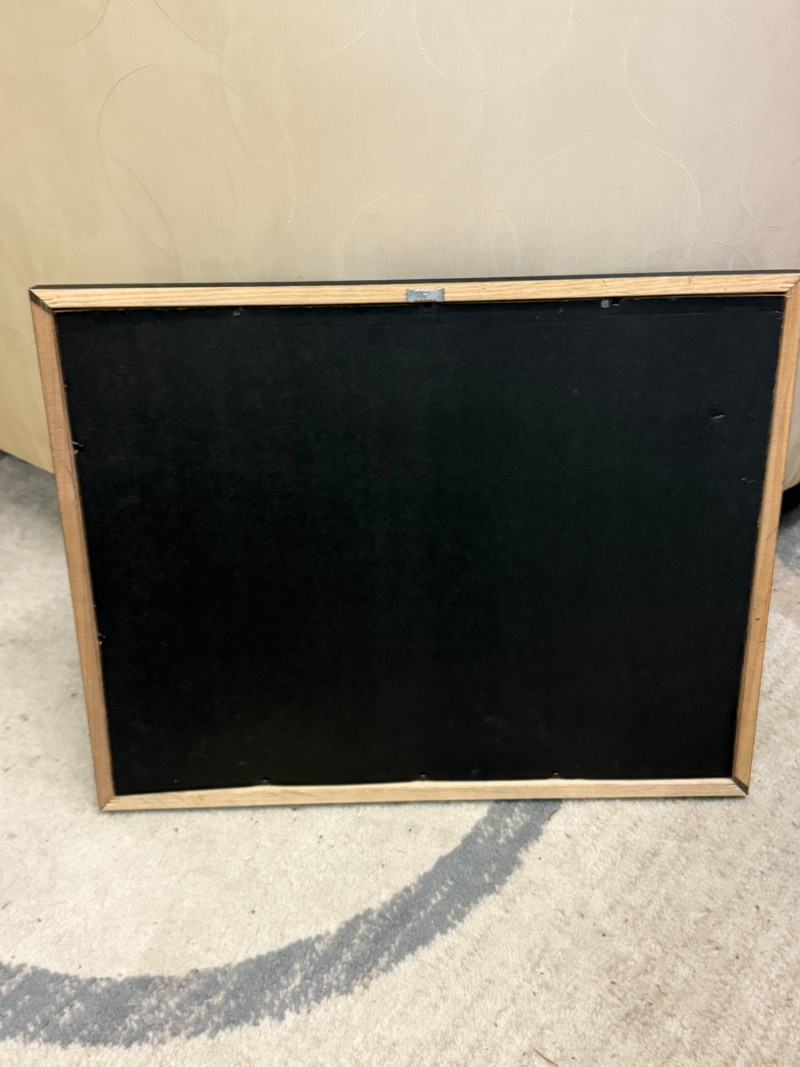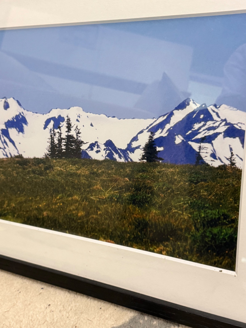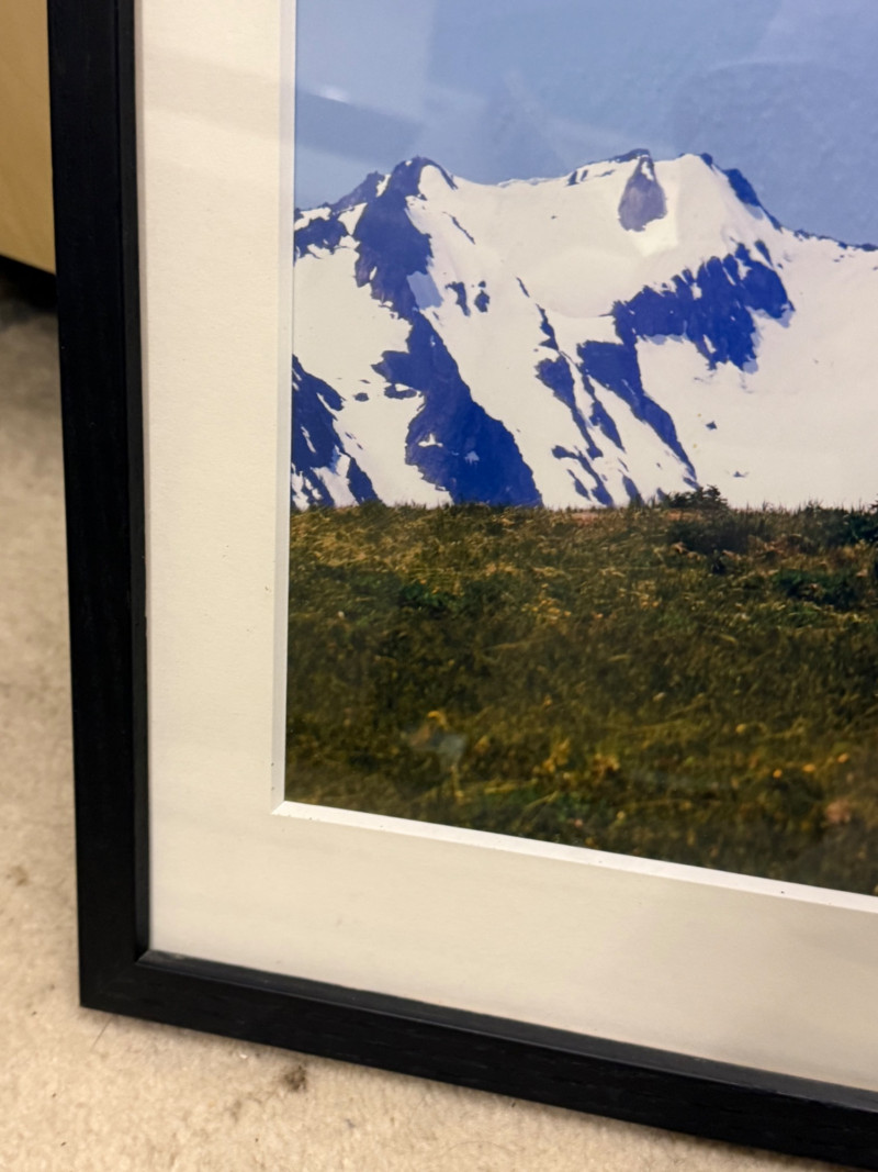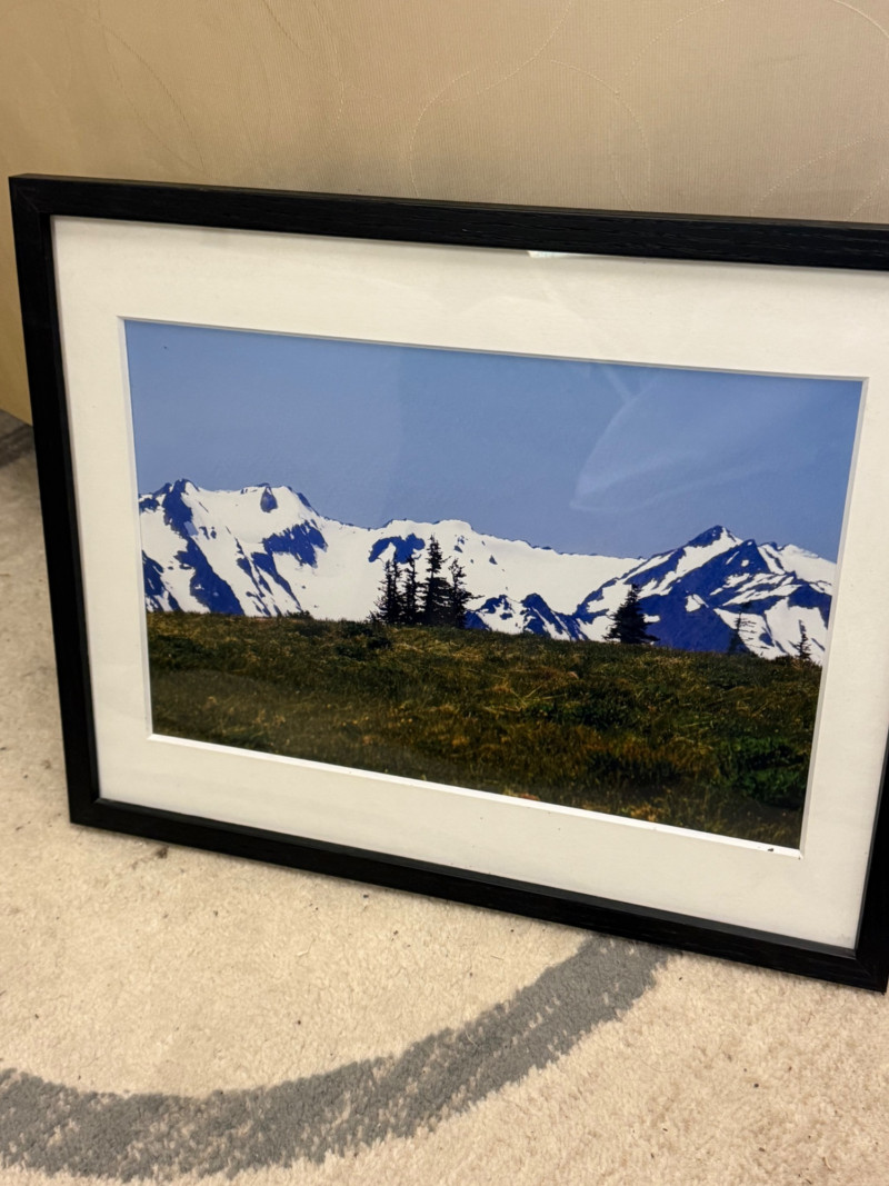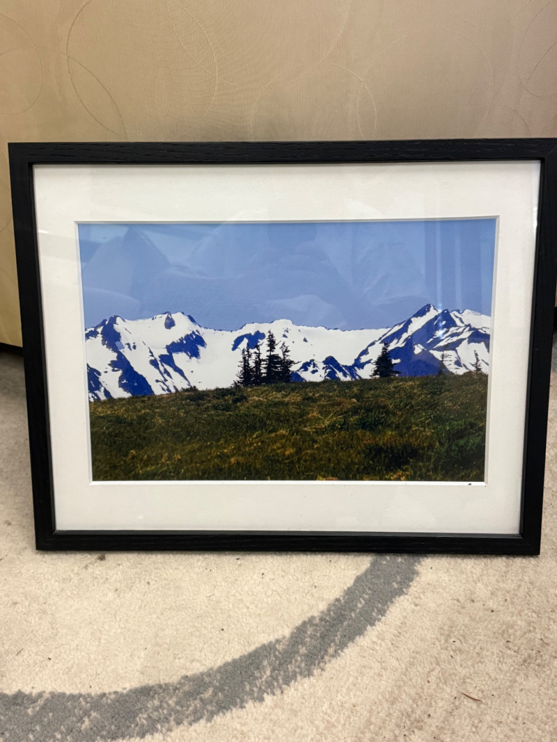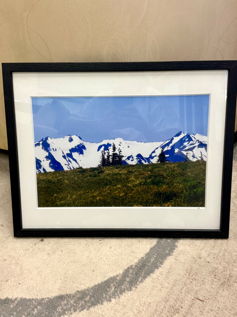 Striking color photograph capturing the snow-capped Olympic Mountains under a vivid blue sky, viewed across an alpine meadow. Framed under glass with a clean modern presentation. Details: Subject: Olympic Mountain Range, Washington State Medium: Color photographic print on glossy paper Frame: Contemporary black wood frame with white mat Era: Late 20th century / early 2000s (unsigned) Condition: Excellent — print is crisp and color-saturated; minor wear to frame corners consistent with age. Dimensions (approx.): 14” W × 11” H (framed) Historical Note:Framed Landscape Photograph — Olympic Mountains, Washington