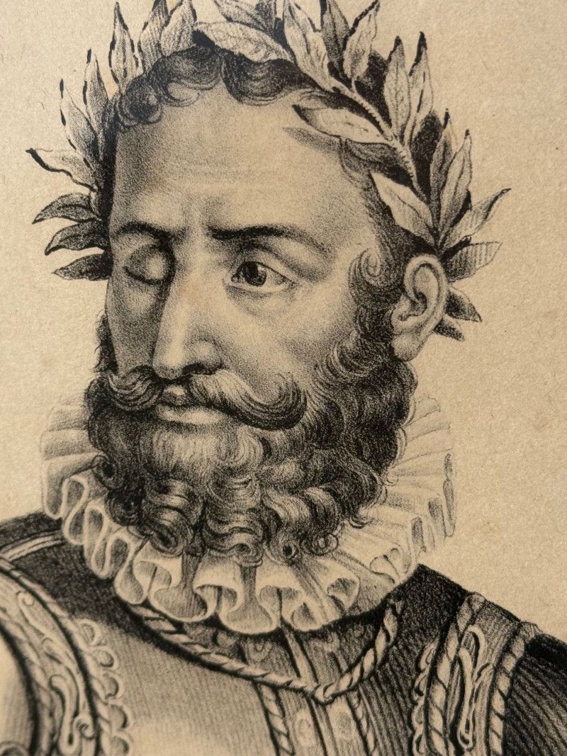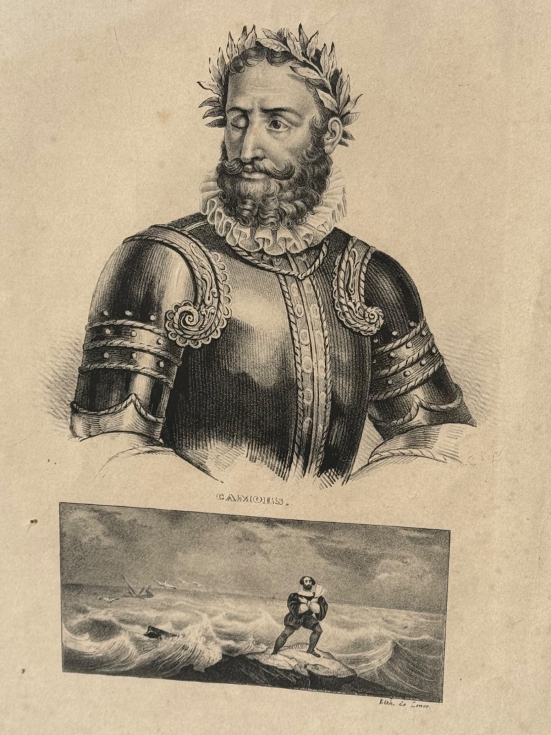 Luís de Camões is revered as one of Europe’s greatest poets, often called the “Portuguese Shakespeare.” His epic Os Lusíadas (1572) immortalized the Age of Discovery and Portugal’s maritime empire. Portrait engravings of Camões were especially popular during the 19th century, coinciding with Portugal’s Romantic nationalist revival and the rise of illustrated book plates and lithographs.