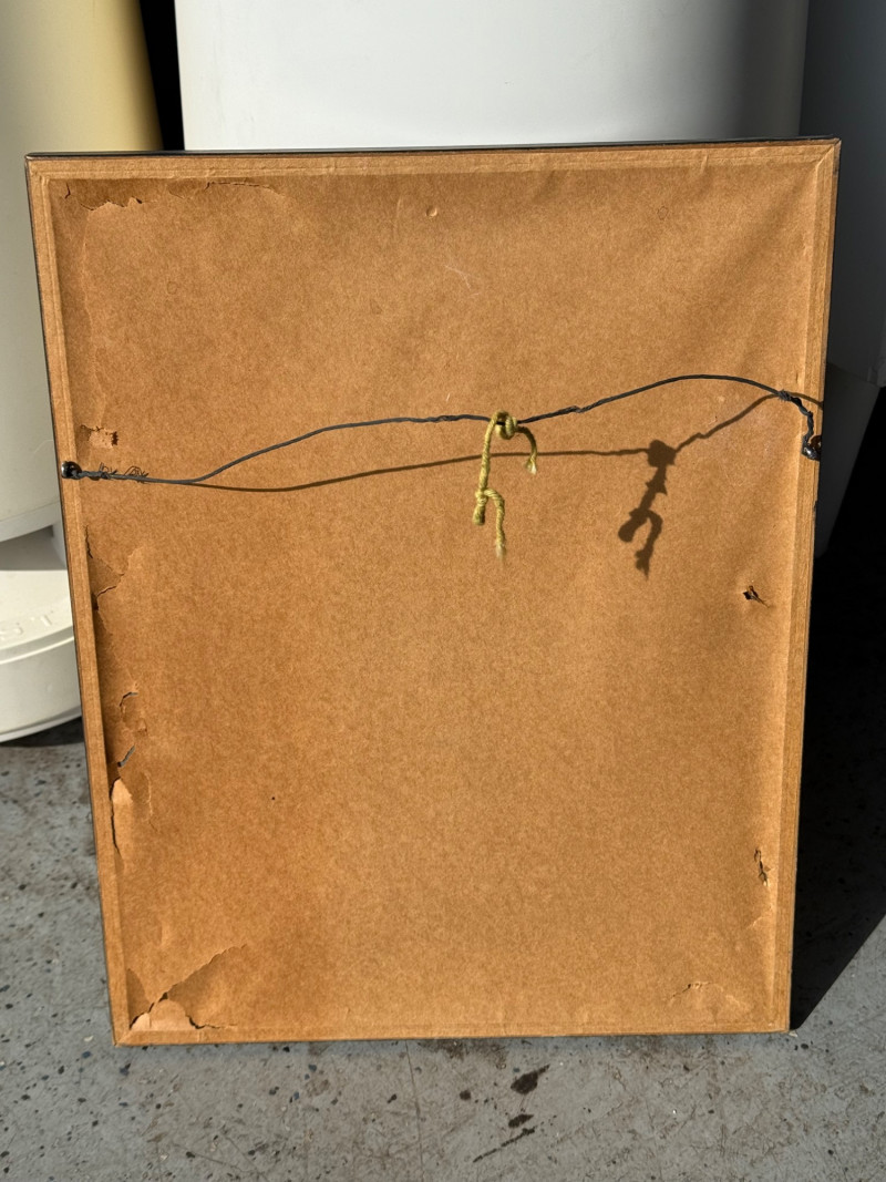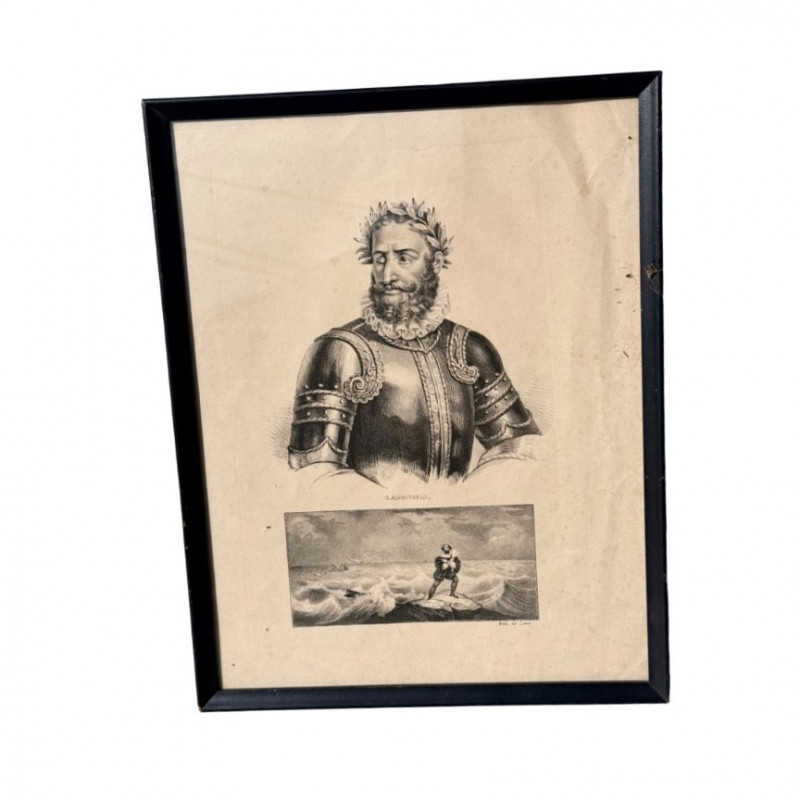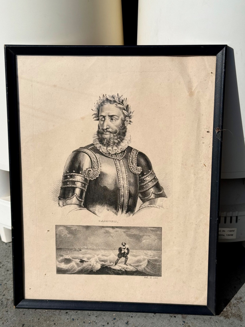 Striking antique engraving depicting Luís Vaz de Camões (1524–1580), the Portuguese national poet and author of Os Lusíadas, portrayed in classical laurel and armor. Below, a detailed vignette shows the poet clutching his manuscript amid crashing waves — a reference to the legend that he swam to shore during a shipwreck, saving his literary masterpiece. Printed in fine black ink on cream wove paper and framed under glass. Signed in plate lower right: “Lith. de Lemerc.” Historical Note: Condition: light age toning and minor creasing consistent with age; vintage frame included. Approx. 19” × 15” framedAntique 19th-Century Engraving of Luís de Camões — “Os Lusíadas” Maritime Scene