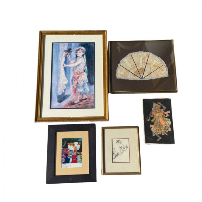Curated set of five framed artworks spanning styles from European Impressionist reproductions to Asian and African-inspired folk art and textile-based pieces. A unique and colorful assortment ideal for gallery wall arrangements or collectors of multicultural art. Includes: Large gold-framed print of a young girl with bird — likely after Pierre-Auguste Renoir, impressionist reproduction. Framed textured paper fan artwork — handmade mixed-media piece in gold and indigo tones. Framed miniature Asian floral painting — delicate ink and watercolor composition with calligraphy mark. Colorful modern print — depicting monks or villagers in procession, framed with broad black mat. Unframed Indian or Balinese-style figure illustration — hand-painted detail on black background, depicting a traditional dancer or deity. Details: Era: Mid-20th century to contemporary (varied) Mediums: Print, mixed-media, watercolor, and textile paper Frames: Mixed wood and metal in coordinating neutral tones Condition: Good overall — minor wear consistent with age; no major damage to prints or mats Dimensions: Range from 8” × 10” to 18” × 24” Historical Note:Collection of 5 Framed Global Art Prints and Mixed Media Works — Eclectic Cultural Decor